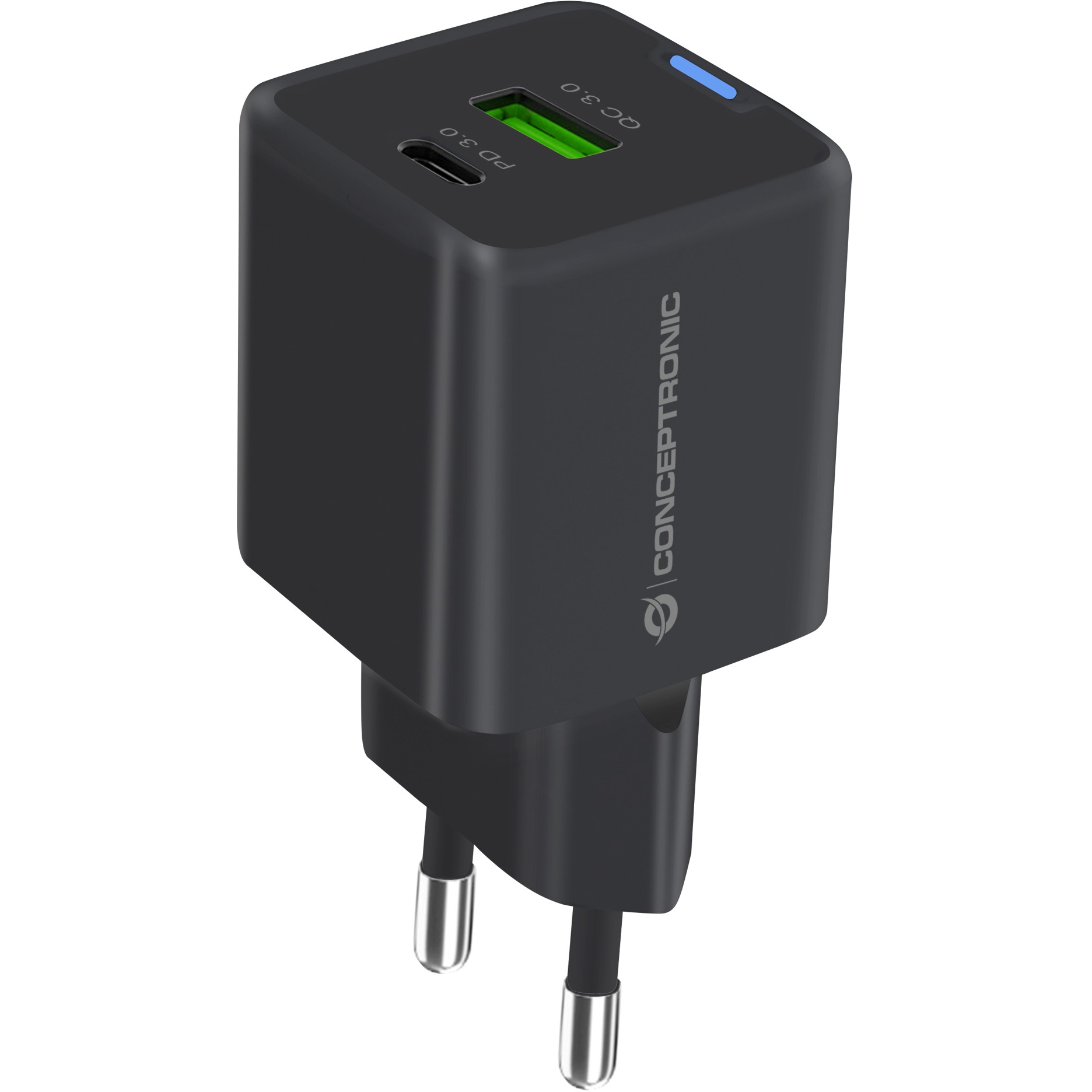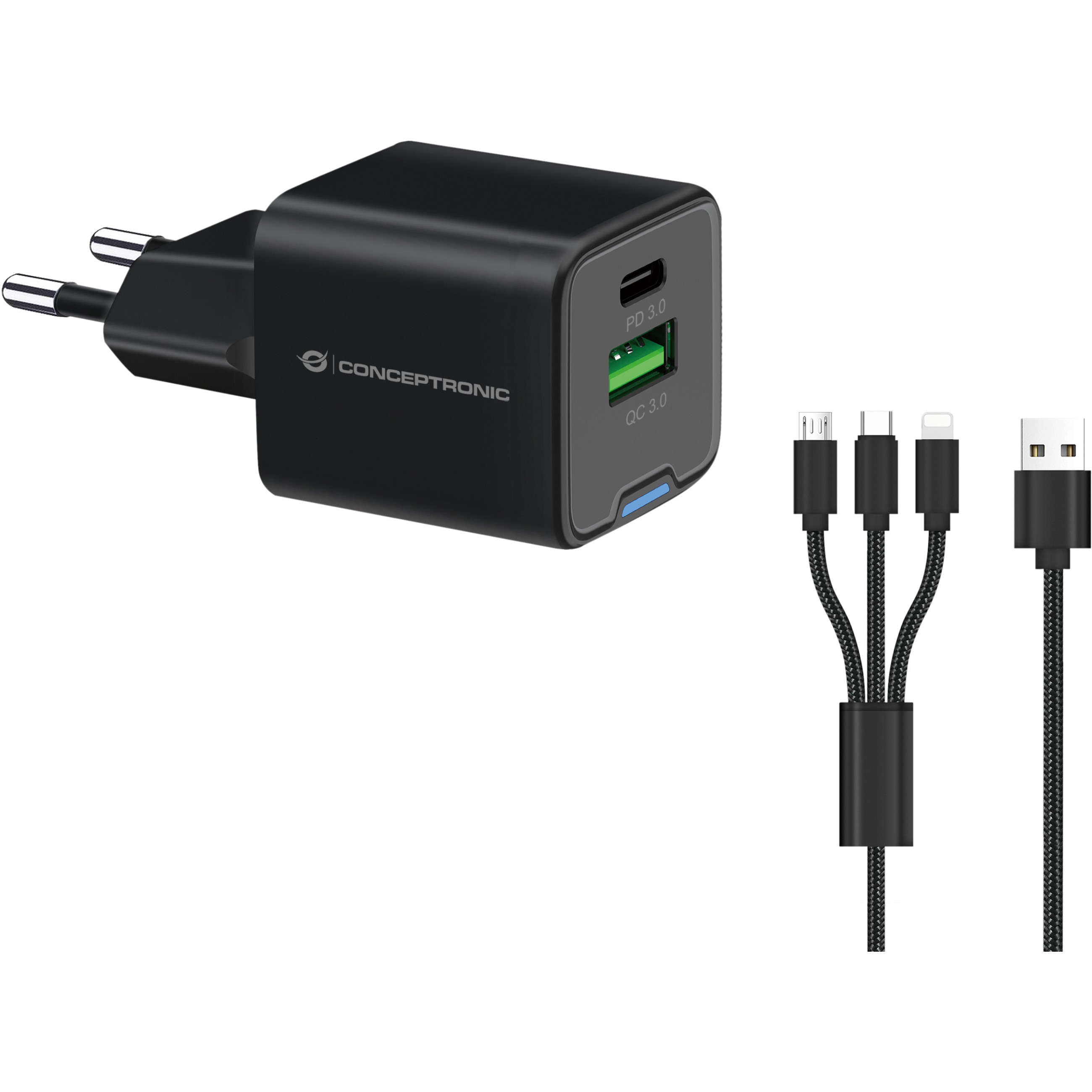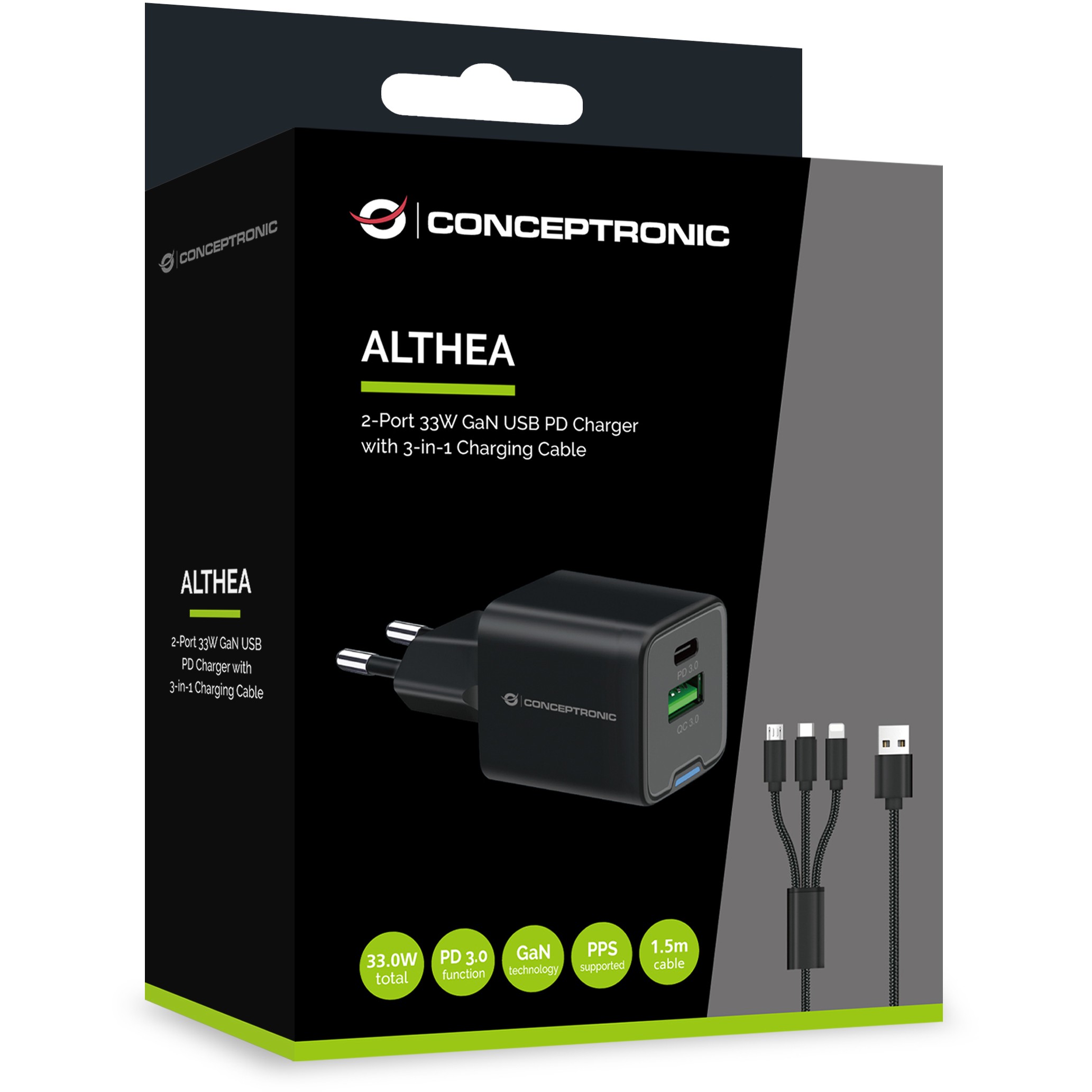 Dieses Ladegerät nutzt die Leistung der fortschrittlichen Galliumnitrid-Technologie (GaN) und liefert bis zu 33 W Gesamtleistung für schnelleres und effizienteres Laden. Es bietet vielseitige Anschlussoptionen mit 1 USB-C-Anschluss mit USB Power Delivery (PD) 3.0 und 1 USB-A-Anschluss mit Quick Charge (QC) 3.0, was das gleichzeitige Laden mehrerer Geräte mit unterschiedlichem Strombedarf ermöglicht. Das Ladegerät unterstützt eine breite Palette von Ausgangsoptionen von 3,3 V bis 20,0 V und ist somit mit allen Geräten von Smartphones bis hin zu Laptops kompatibel. Es ist mit erweiterten Sicherheitsfunktionen ausgestattet, einschließlich Schutz vor Überlastung, Kurzschluss und Überhitzung, um sowohl das Ladegerät als auch die angeschlossenen Geräte zu schützen. Das Ladegerät verfügt außerdem über die Technologien USB Power Delivery (PD) 3.0 und Quick Charge (QC) 3.0 sowie Programmable Power Supply (PPS), um die Ladeeffizienz zu optimieren und die Wärmeentwicklung zu reduzieren. Außerdem wird ein 1,5 m langes 3,0 A 3-in-1-Kabel für zusätzlichen Komfort und Vielseitigkeit mitgeliefert.