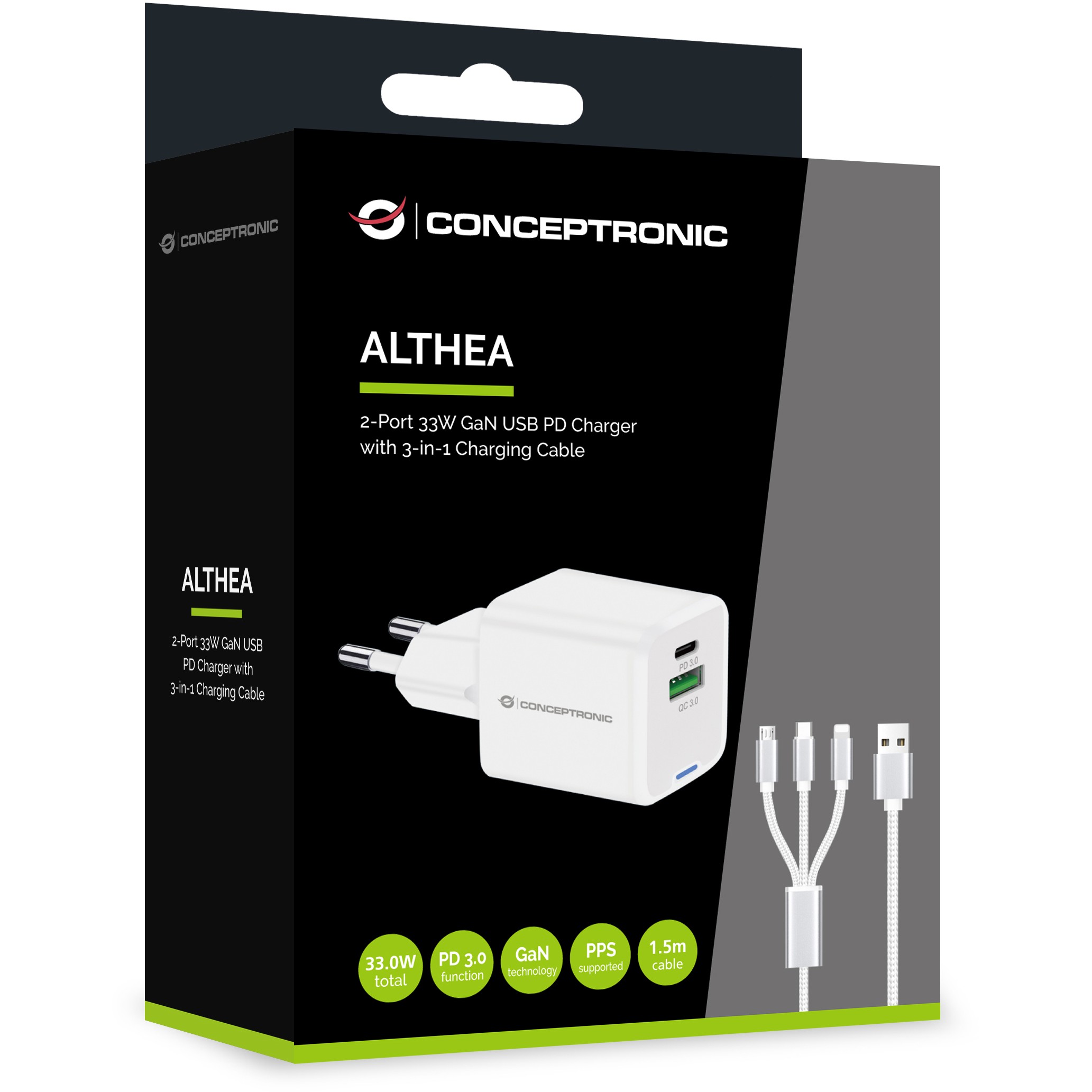 Dieses Ladegerät nutzt die fortschrittliche Galliumnitrid (GaN)-Technologie, um eine Gesamtleistung von bis zu 33 W zu liefern, die ein schnelleres und effizienteres Laden ermöglicht. Es verfügt über eine vielseitige Anschlussauswahl mit 1 USB-C-Anschluss, der USB Power Delivery (PD) 3.0 unterstützt, und 1 USB-A-Anschluss mit Quick Charge (QC) 3.0, was das gleichzeitige Laden mehrerer Geräte mit unterschiedlichem Strombedarf ermöglicht. Das Ladegerät unterstützt eine breite Palette von Ausgangsoptionen von 3,3 V bis 20,0 V und gewährleistet so die Kompatibilität mit einer Vielzahl von Geräten, einschließlich Smartphones und Laptops. Der integrierte Schutz vor Überlastung, Kurzschluss und Überhitzung sorgt für erhöhte Sicherheit. Darüber hinaus verfügt es über die Technologien USB Power Delivery (PD) 3.0 und Quick Charge (QC) 3.0 für schnelles Laden sowie über eine programmierbare Stromversorgung (PPS) zur Maximierung der Effizienz und Minimierung der Wärmeentwicklung. Für zusätzlichen Komfort enthält das Ladegerät ein 1,5 m langes 3,0 A 3-in-1-Kabel.