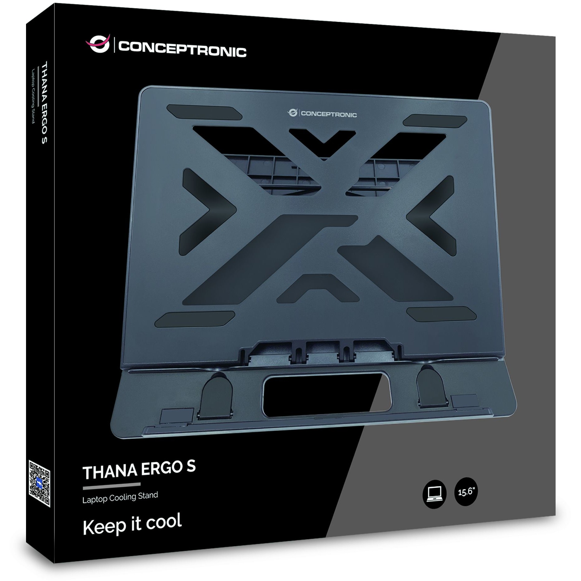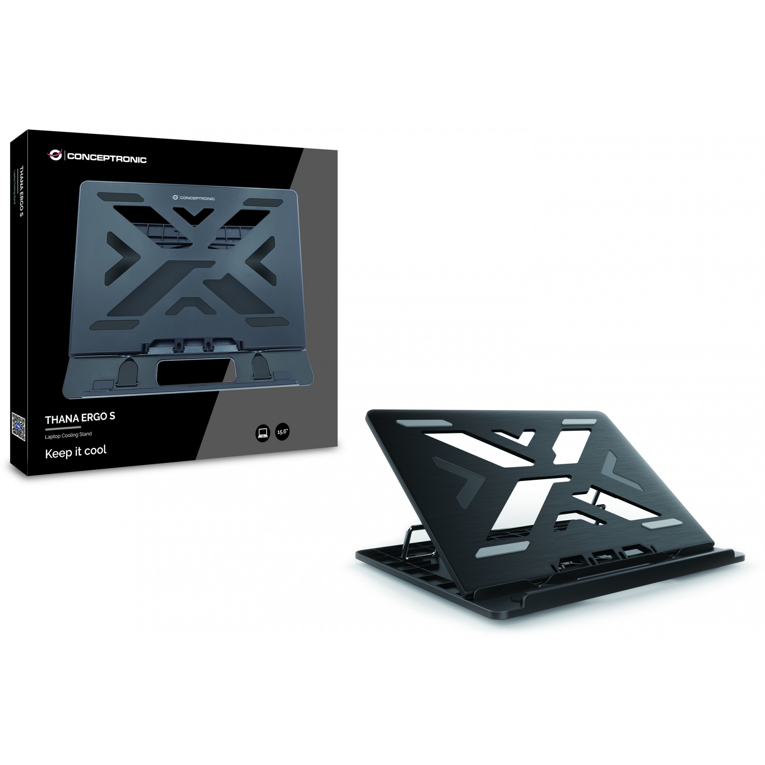 Conceptronic ERGO Laptop Cooling Stand. Produkttyp: Laptop-Ständer, Produktfarbe: Schwarz, Maximale Notebook-Bildschirm-Größenkompatibilität: 39,6 cm (15.6"). Breite: 258 mm, Tiefe: 302 mm, Höhe: 24 mm. Verpackungsbreite: 258 mm, Verpackungstiefe: 302 mm, Verpackungshöhe: 24 mm