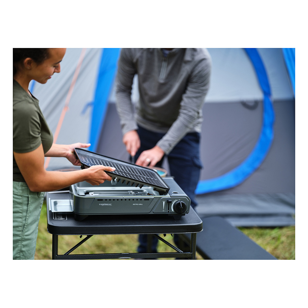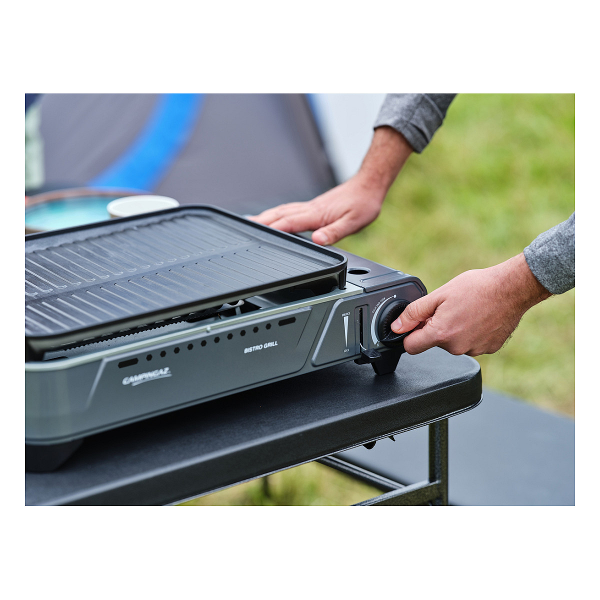 Der Bistro GRILL dient als Grillbegleiter für jeden Anlass: zu Hause auf dem Balkon oder im Garten; beim Camping oder auf Reisen. Mit seiner großen antihaftbeschichteten Grillfläche kann nach einer kurzen Vorheizzeit von 6 Minuten der Grillspaß bereits beginnen.