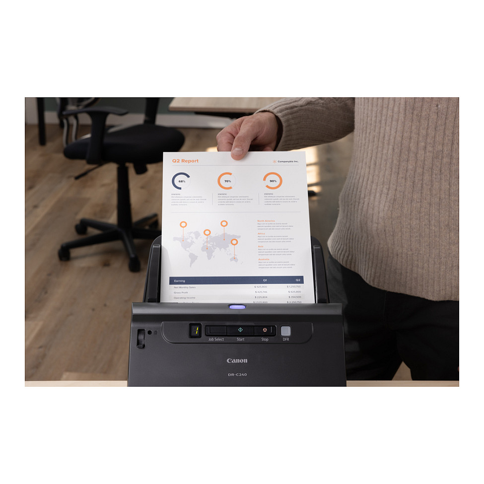 Der imageFORMULA DR-C240 ist mit seinem hochwertigen Design und seinen auf Produktivität ausgerichteten Features bahnbrechend in diesem Segment. Durch seine Geschwindigkeit von bis zu 45 Seiten/90 Bildern pro Minute ist der imageFORMULA DR-C240 der Alleskönner für viel beschäftigte Büros und Arbeitsgruppen. Sein geräuscharmer Betrieb und das kompakte, attraktive Design sind optimal für alle Bereiche mit Kundenkontakt, beispielsweise in Banken, Hotels, Kanzleien, Krankenhäuser und Behörden.