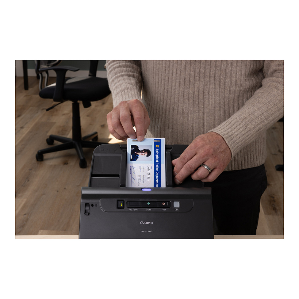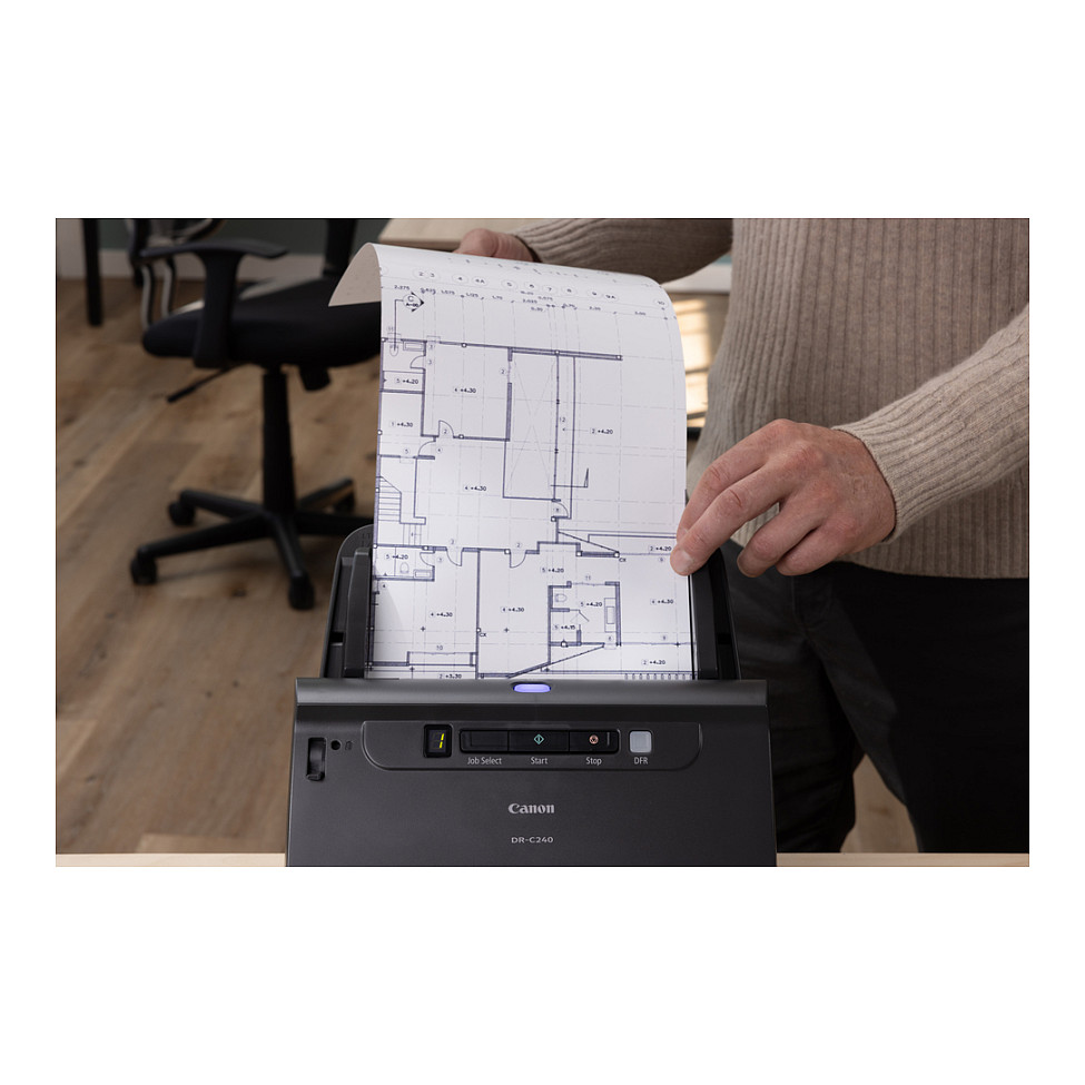 Die solide Bauweise des imageFORMULA DR-C240 und sein robuster Vorlageneinzug sind als direktes Ergebnis auf das die Anforderungen vieler Kunden entstanden. Ein riesiger Fortschritt in Sachen Produktqualität in diesem Segment ist, dass mühelos bis zu 4.000 Scans pro Tag erfasst werden können. Durch den 60-Blatt-ADF, der zuverlässig auch Stapel im Format- und Medienmix verarbeitet, wird die Produktivität gesteigert. Ausweise und Scheckkarten können ebenso verarbeitet werden wie Duplex DIN A4, DIN A3 Formate (als Folio) und lange Dokumente bis zu 3 m Länge.