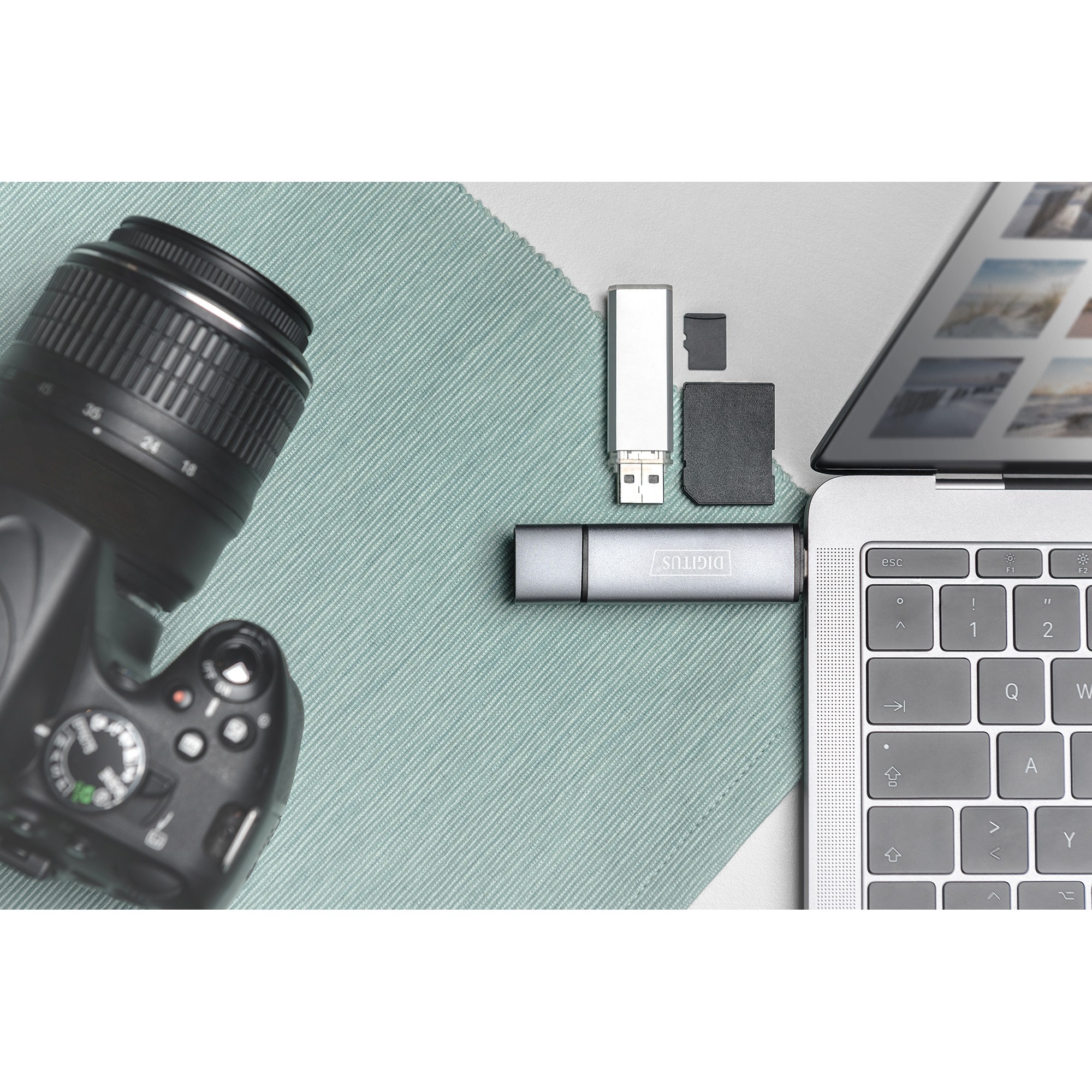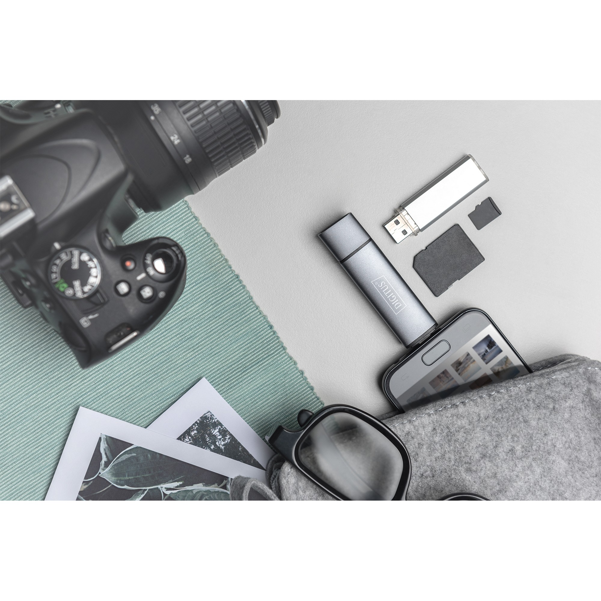 Der Dual Kartenleser von DIGITUS® mit integriertem USB-Hub (OTG) kann wahlweise am Smartphone, Tablet oder Notebook angeschlossen werden, so können Sie auf eingesteckte Speichermedien wie z. B. USB-Sticks, SD- oder MircoSD-Speicherkarten zugreifen. Sie können das Gerät entweder über den USB A (USB 3.0) oder über den USB-C™-Stecker des Hubs anschliessen. Der USB-Hub kann zeitgleich mit dem Speicherkartenleser genutzt werden, so können auch Dateien zwischen beiden Anschlüssen verschoben oder kopiert werden. Die Installation von Treibern oder Apps ist dank Plug and Play nicht notwendig. Ideal beispielsweise zur Sicherung von Urlaubsfotos direkt vor Ort, ohne ein Notebook nutzen zu müssen.