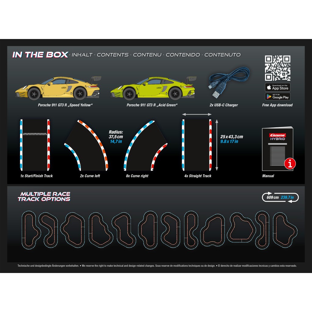 Das Carrera Hybrid - Speedway to Hell Set bringt eine bahnbrechende Innovation in dein Rennspiel-Erlebnis.. In diesem Set enthalten sind zwei detailgetreue Porsche 911 GT3 R Modelle, "Green Acid" und "Speed Yellow", welche dir eine neue Dimension des Rennens eröffnen. Die Streckenkonfiguration umfasst eine Start-/Zielgerade, vier gerade Streckenteile, acht Rechtskurven und zwei Linkskurven, die ein herausforderndes und abwechslungsreiches Fahrerlebnis ermöglichen. Mit den beiliegenden USB-C-Ladekabeln bleiben die Fahrzeuge einsatzbereit. Dieses Set bietet eine perfekte Kombination aus moderner Technologie und klassischem Rennvergnügen.