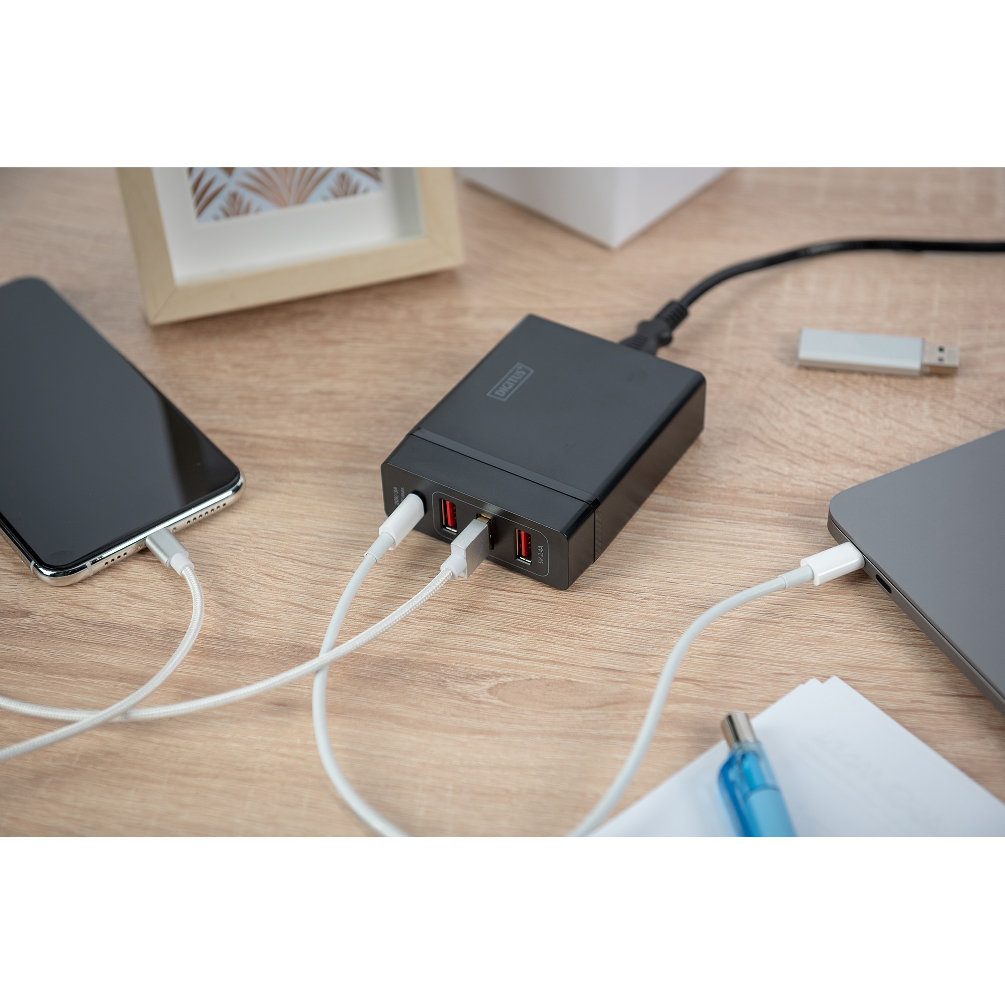Der 4-Port USB-Ladeadapter, USB Type-C™ von Digitus® ist die universelle Ladestation für all Ihre Geräte. Der USB-C Ladeport (5-20V/3A/60W max.) mit Power Delivery (PD) 2.0 Funktionalität lädt Ultrabooks, Notebooks, Tablets, Smartphones, mobile Spielekonsolen, etc. schnell und effizient wieder auf. Über die drei USB-A Ladeports (total: 5V/2,4A, jeder Port liefern bis zu5V/2,4A max.) laden Sie jegliche Art von Mobilgeräten wie z.B. Smartphones, Tablets, Power Banks, Lautsprecher, etc. Die Gesamtleistung beträgt 72W.4-Port USB-Ladegerät,72W,1xUSB-C(Power Delivery) 5,9,15,20V/3A, 3x USB-A 5V/2.4A, schwarz
