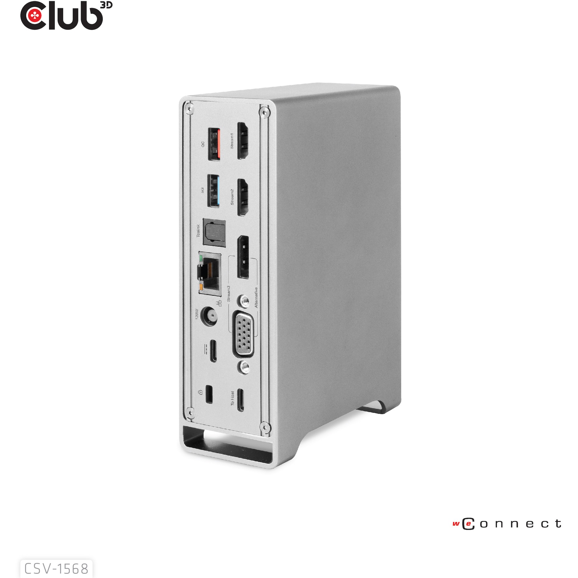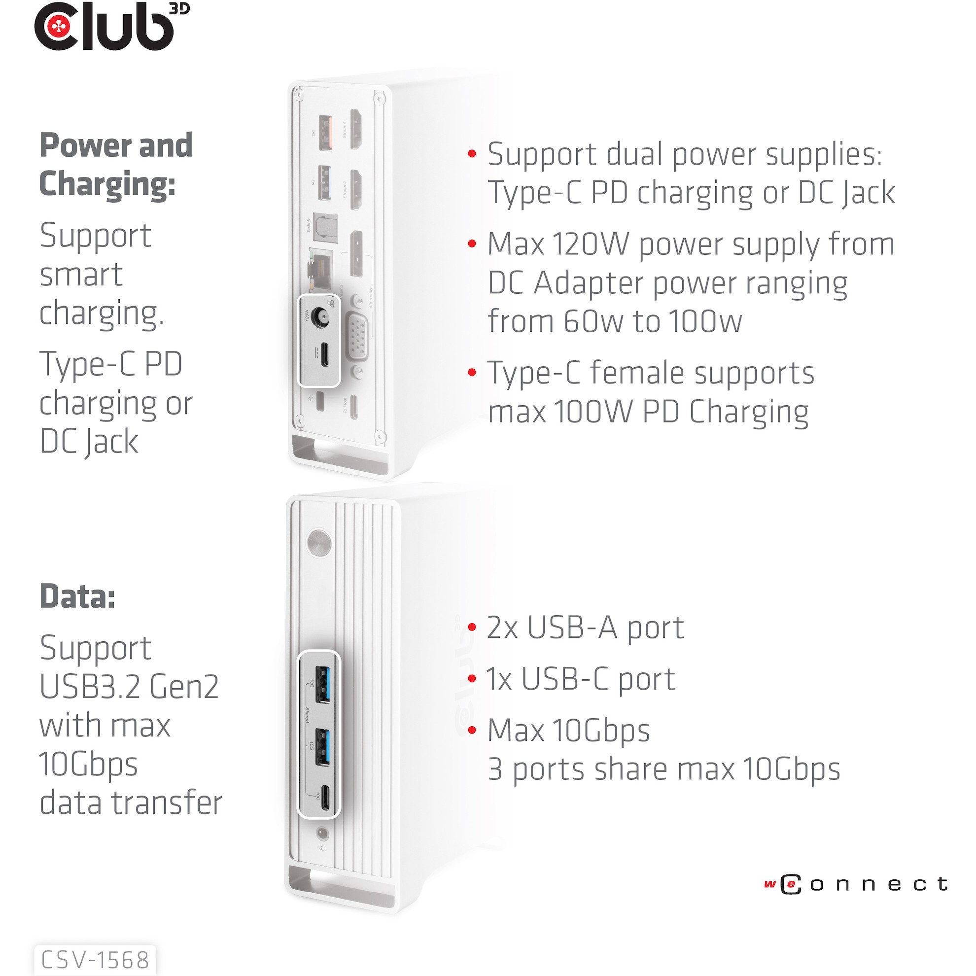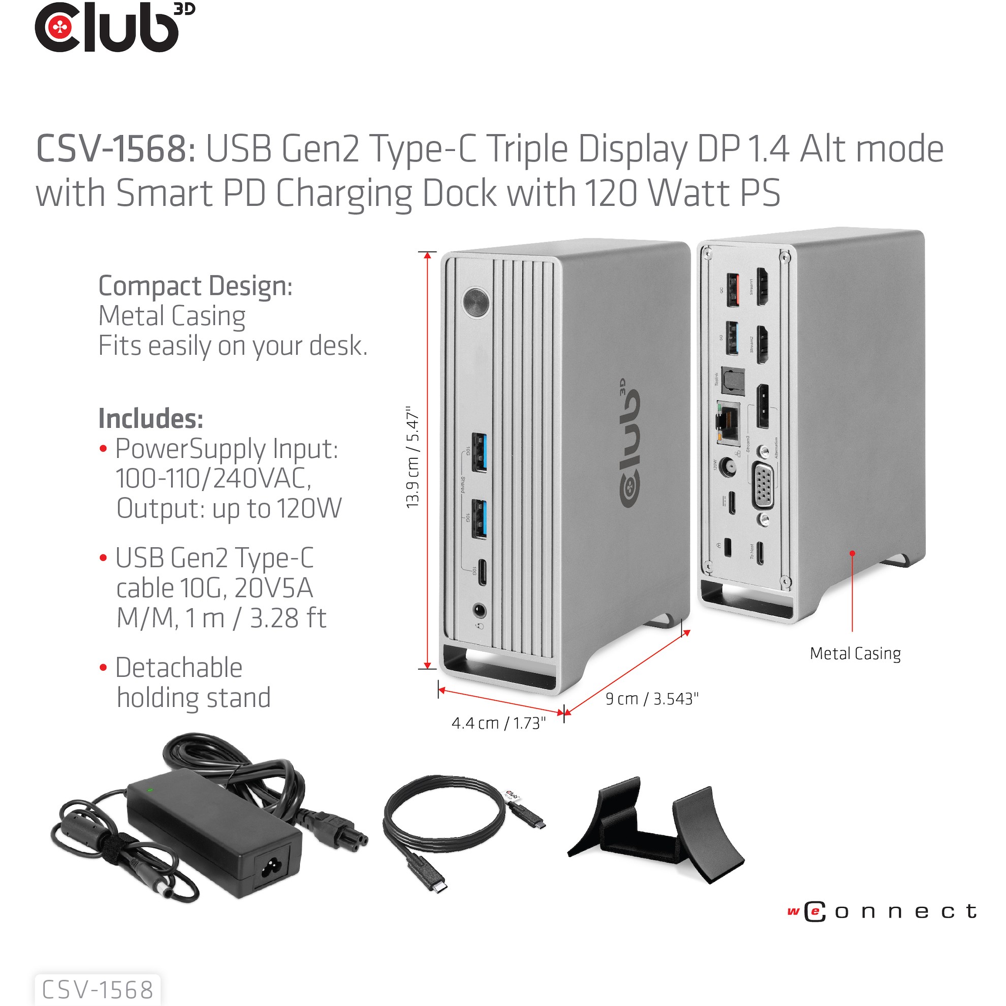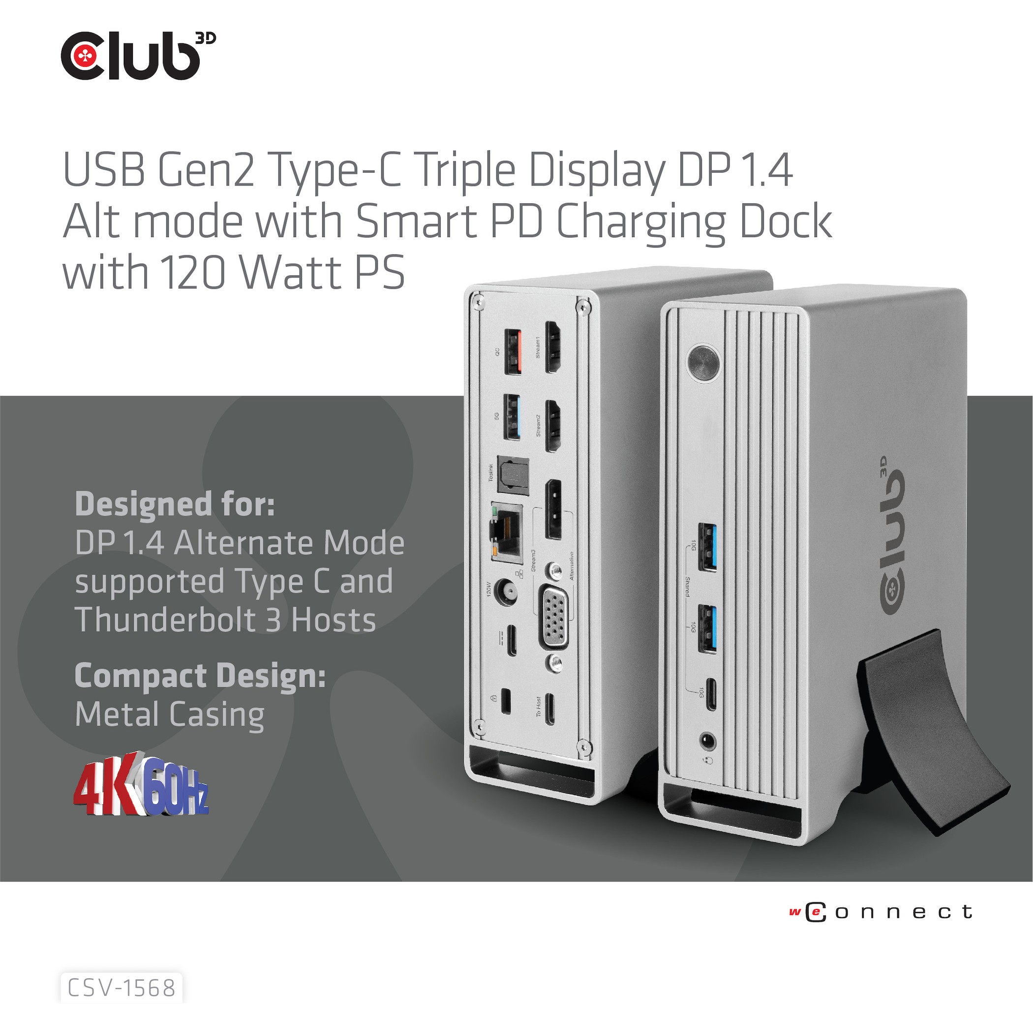 CLUB3D Universal Docking station Metal casing 1x USB Gen2 Type-C (data) 2x USB Gen2 Type-A Female 1x USB Gen1 Type-A Female 1x USB Type-A (RED) Smart Charging port 5V/2.4A Max. • 2x HDMI™ (DP Alt Mode) 1x DP™ (DP Alt Mode) hdr 1x VGA 1x RJ45+ 120 Watt. Übertragungstechnik: Andocken, Hostschnittstelle: USB 3.2 Gen 2 (3.1 Gen 2) Type-C, USB-Stromversorgung bis zu: 100 W. Produktfarbe: Metallisch, Datenübertragungsrate: 16,2 Gbit/s, Maximale Bildwiederholrate: 60 Hz. Energiequelle: Gleichstrom, Netzstecker: USB Typ-C, AC Eingangsspannung: 100 - 240 V. Breite: 139 mm, Tiefe: 90 mm, Höhe: 44 mm. Menge pro Packung: 1 Stück(e), Verpackungsbreite: 225 mm, Verpackungstiefe: 155 mm