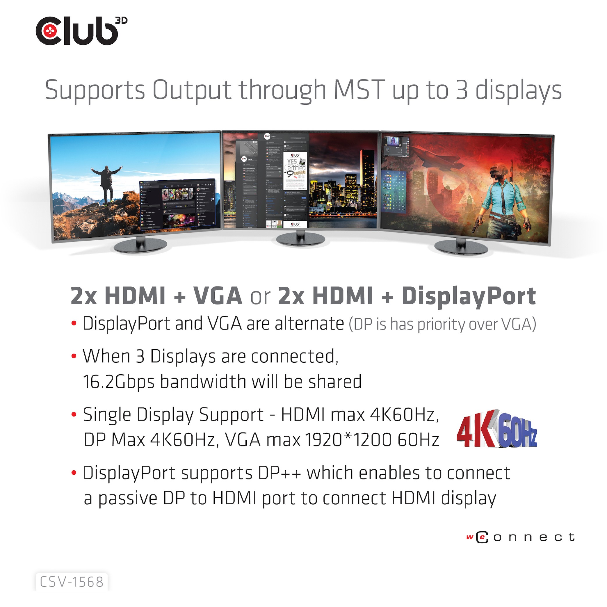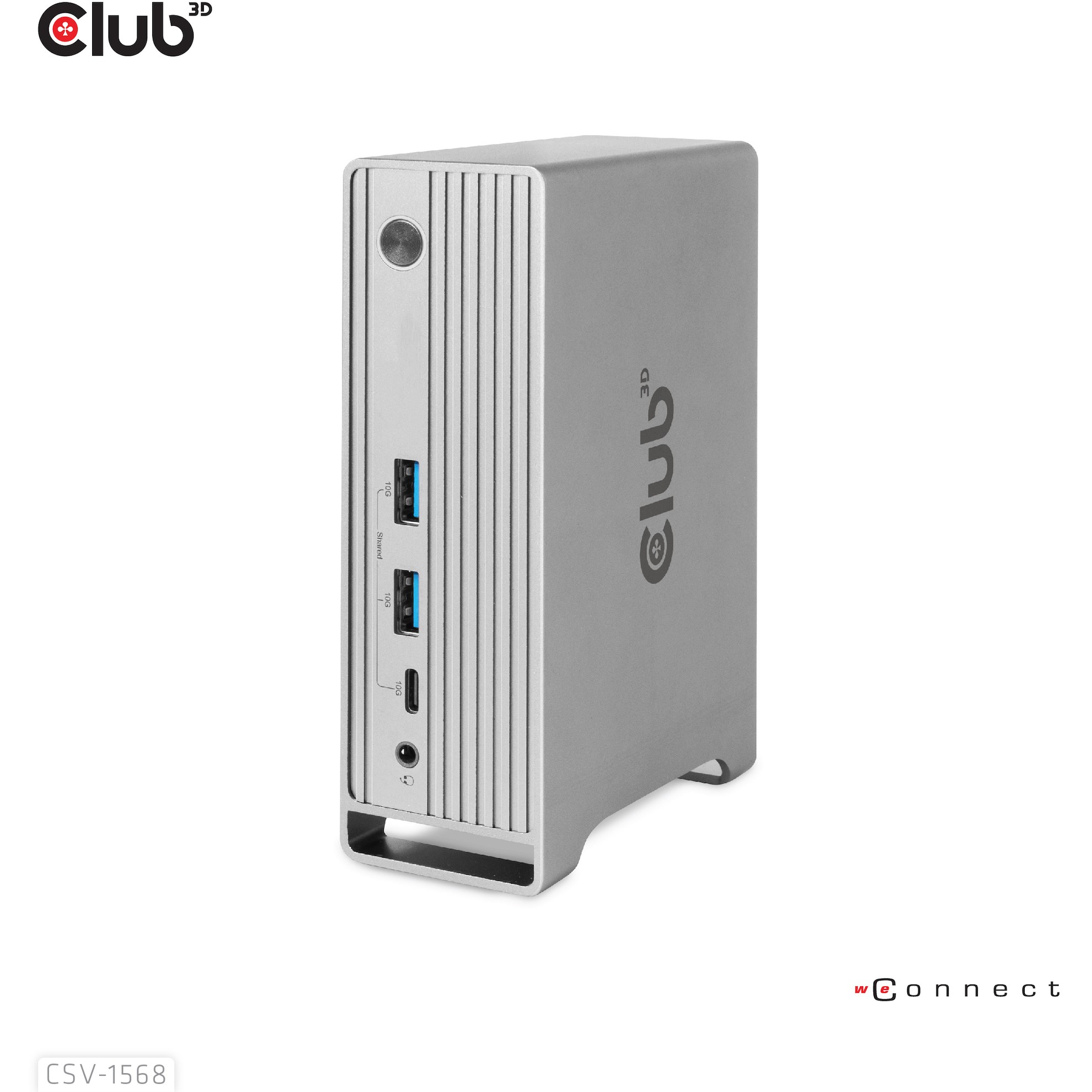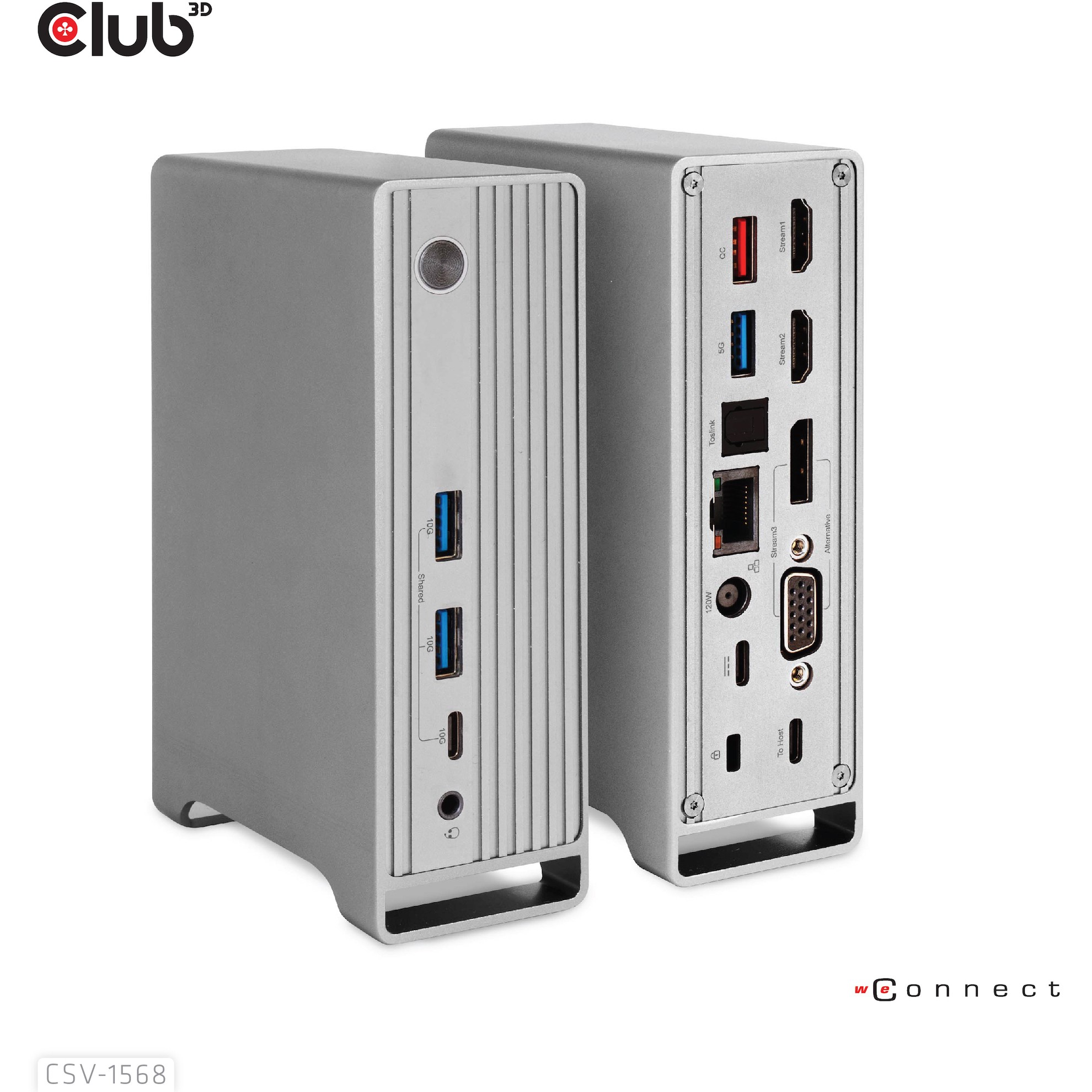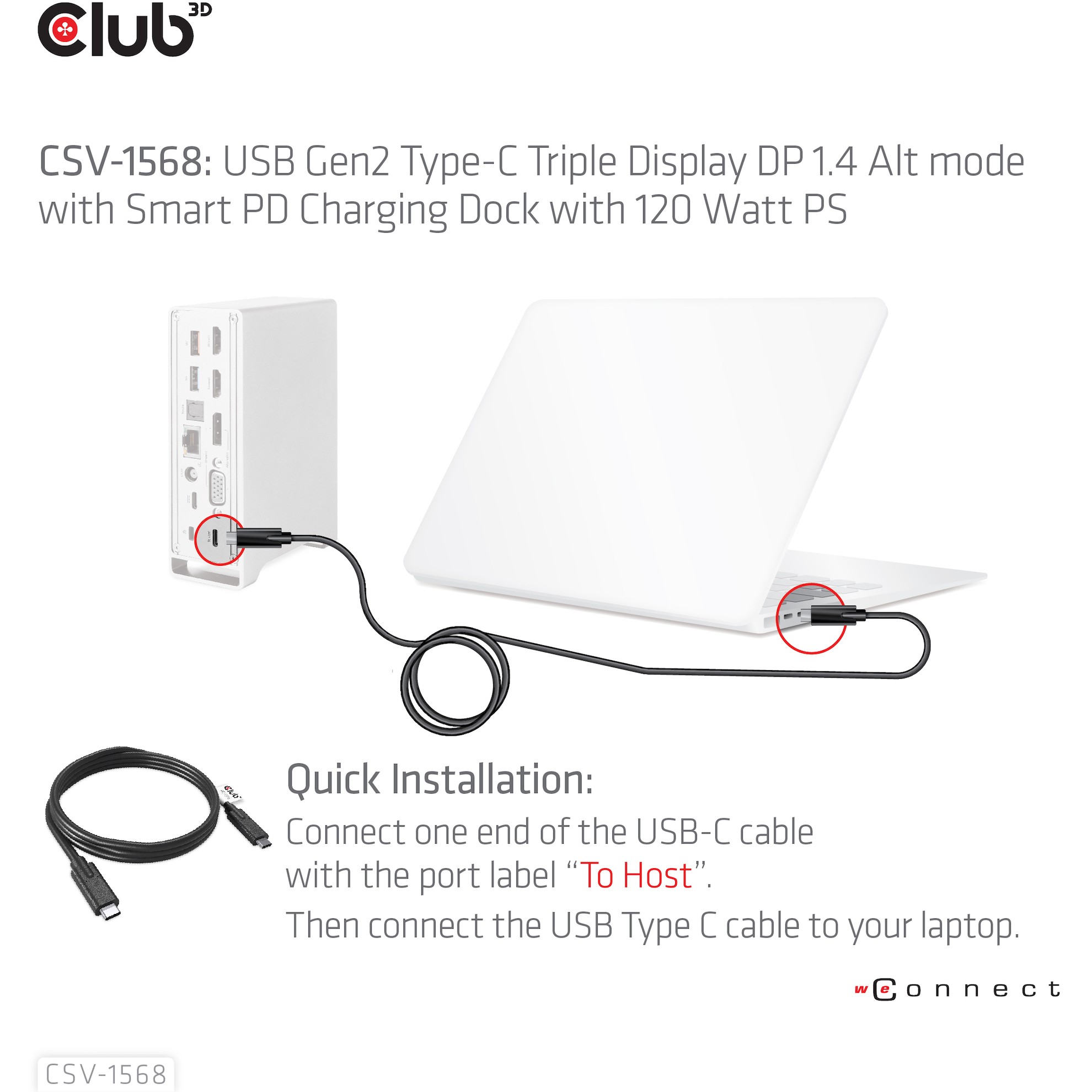 CLUB3D Universal Docking station Metal casing 1x USB Gen2 Type-C (data) 2x USB Gen2 Type-A Female 1x USB Gen1 Type-A Female 1x USB Type-A (RED) Smart Charging port 5V/2.4A Max. • 2x HDMI™ (DP Alt Mode) 1x DP™ (DP Alt Mode) hdr 1x VGA 1x RJ45+ 120 Watt. Übertragungstechnik: Andocken, Hostschnittstelle: USB 3.2 Gen 2 (3.1 Gen 2) Type-C, USB-Stromversorgung bis zu: 100 W. Produktfarbe: Metallisch, Datenübertragungsrate: 16,2 Gbit/s, Maximale Bildwiederholrate: 60 Hz. Energiequelle: Gleichstrom, Netzstecker: USB Typ-C, AC Eingangsspannung: 100 - 240 V. Breite: 139 mm, Tiefe: 90 mm, Höhe: 44 mm. Menge pro Packung: 1 Stück(e), Verpackungsbreite: 225 mm, Verpackungstiefe: 155 mm