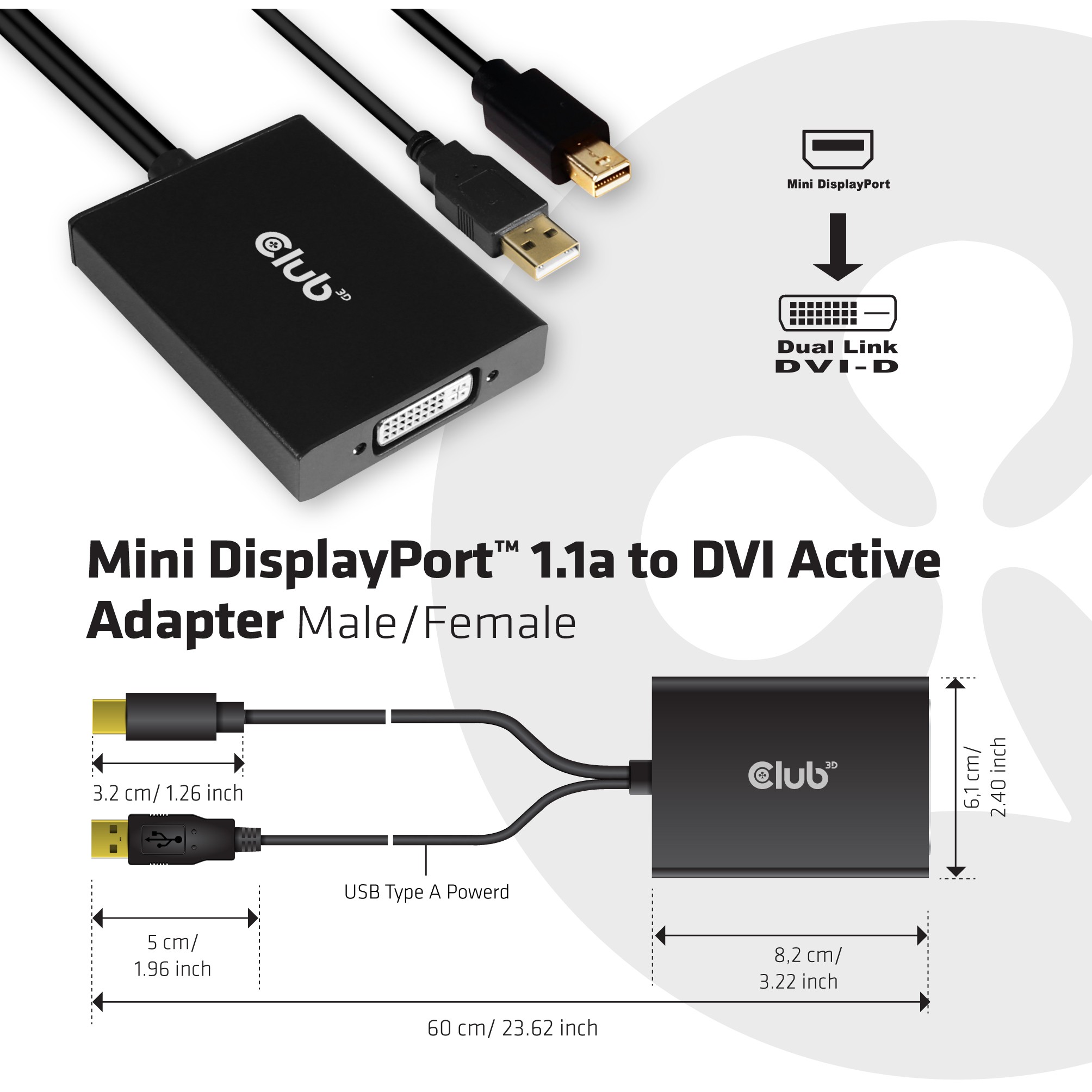 CAC-1130 - Der Mini DisplayPort™ + USB Typ A (für Strom) auf Dual Link DVI Signalformat Konverter verbindet nahtlos Ihre mit Mini DisplayPort™ ausgestattete Quelle mit konventionellen DVI Displays, wie CRT, LCD Monitoren und Projektoren. Können Sie dann die ultimative Widescreen Erfahrung machen, mit einer Auflösung von 2560 x 1440 @ 60Hz auf jedem anderen dafür ausgelegten Display.