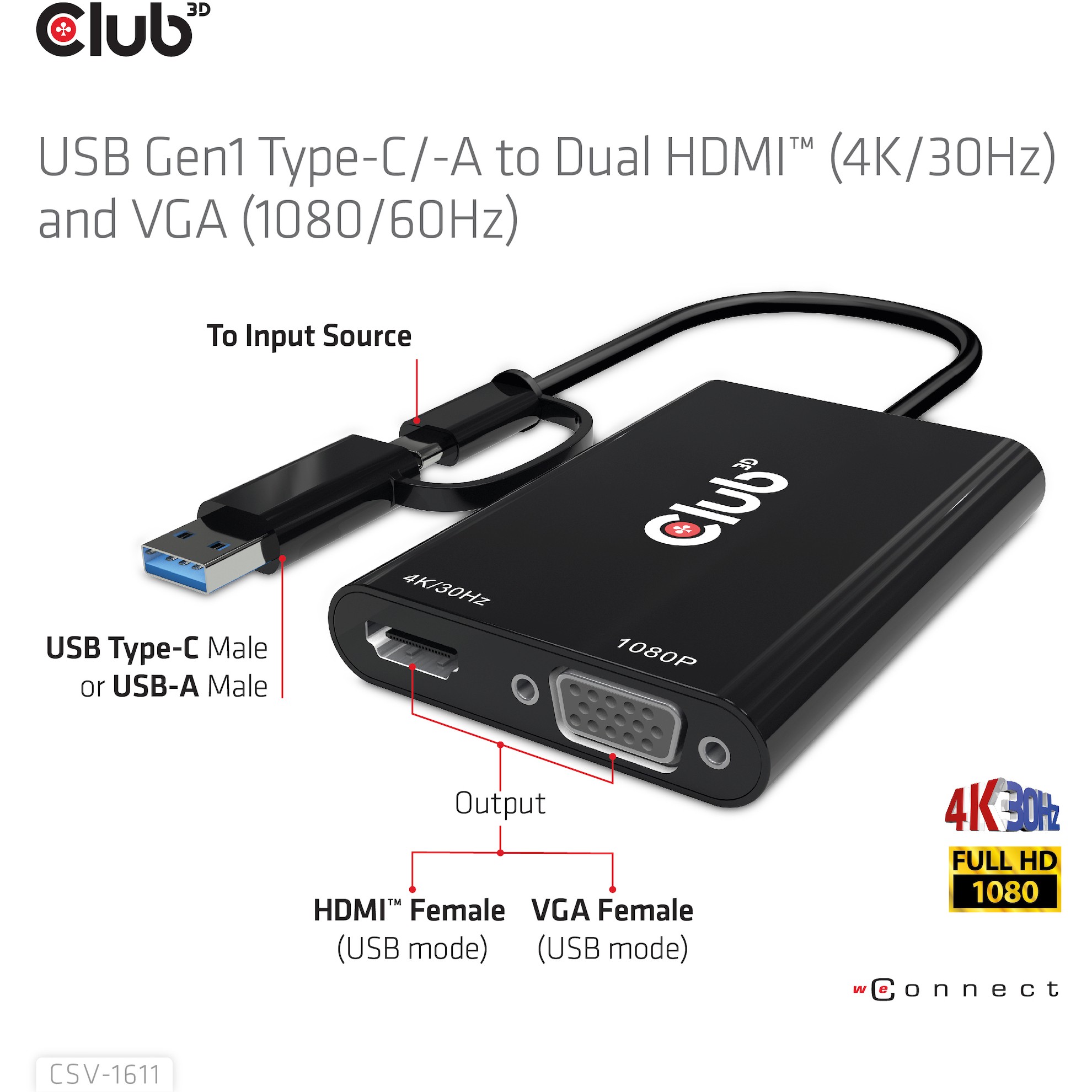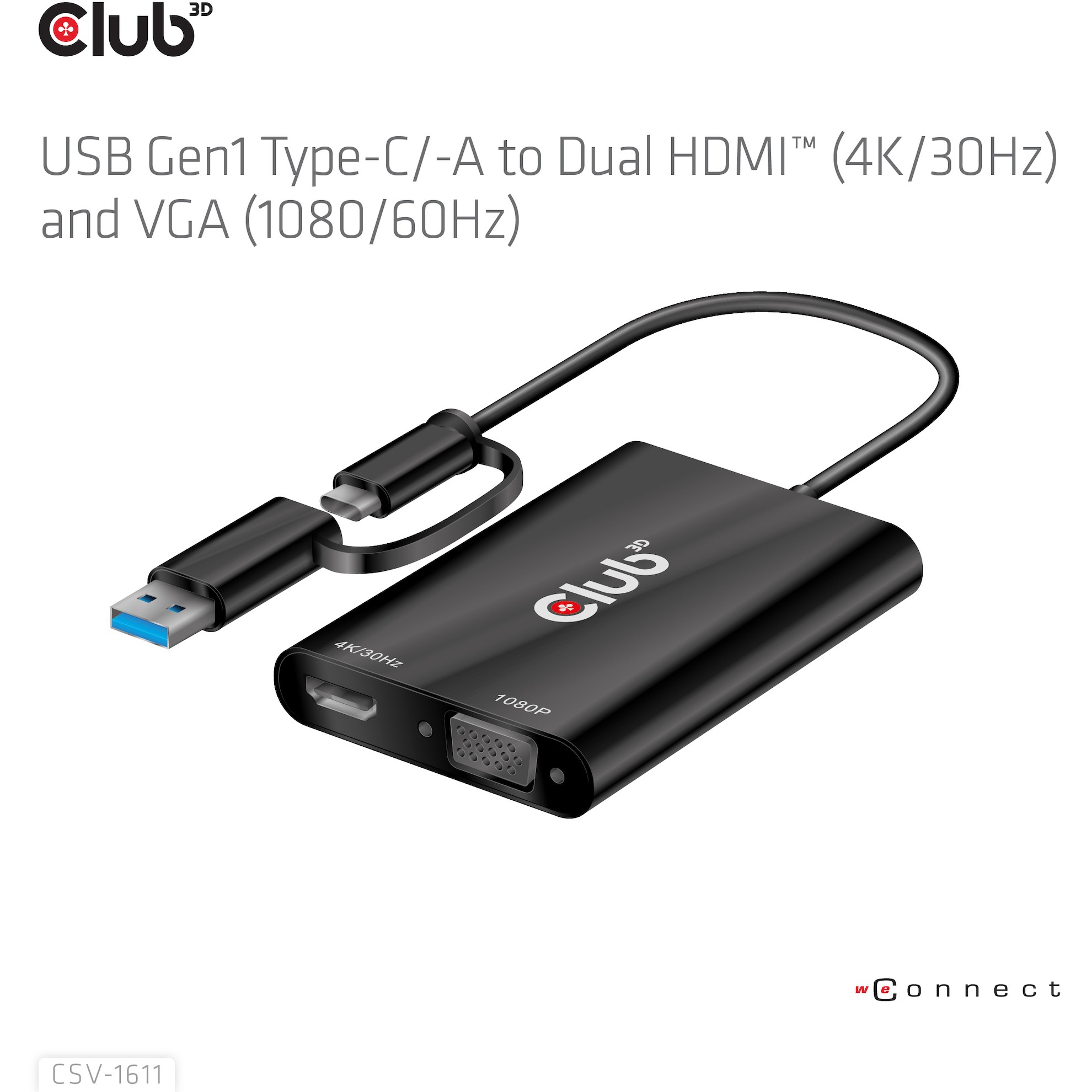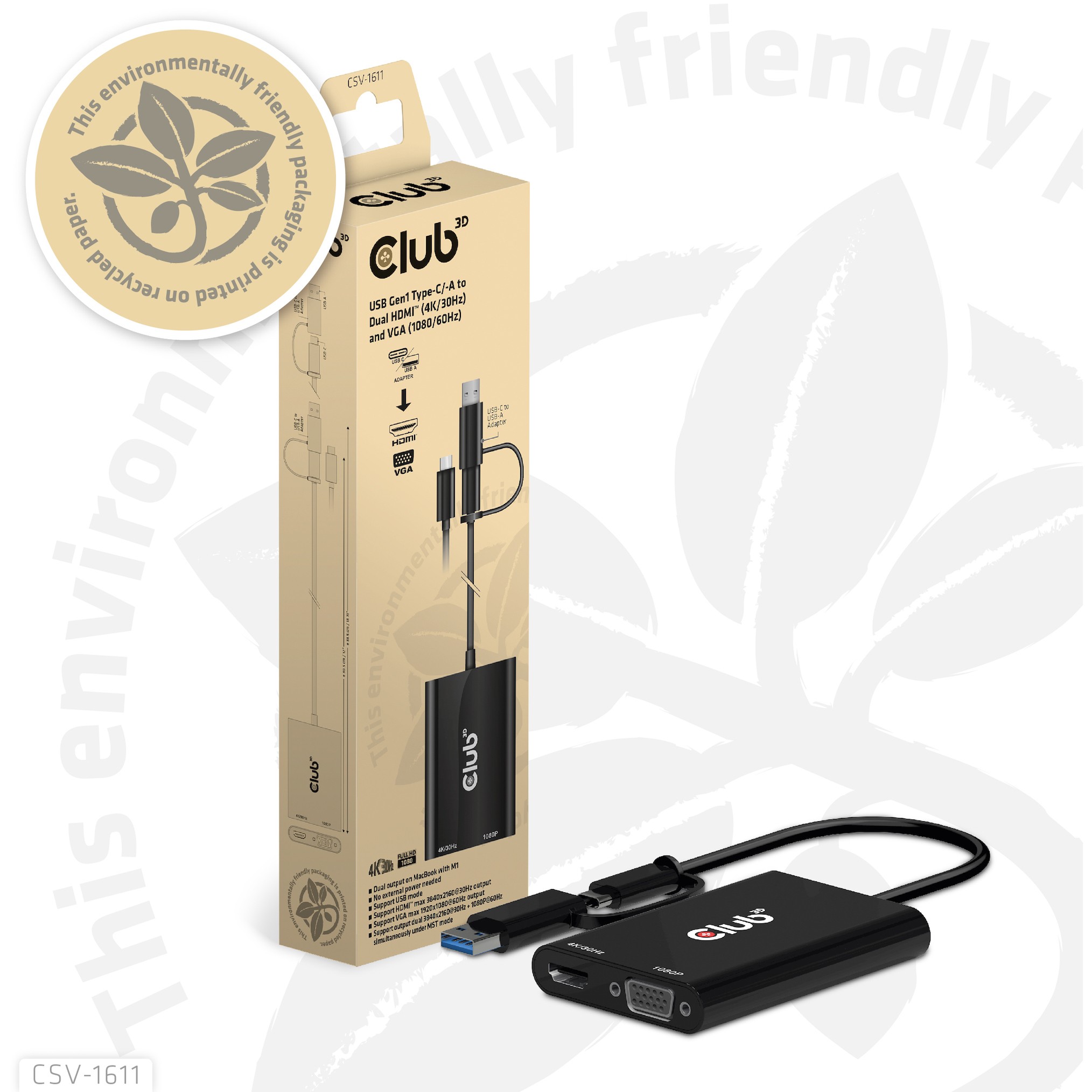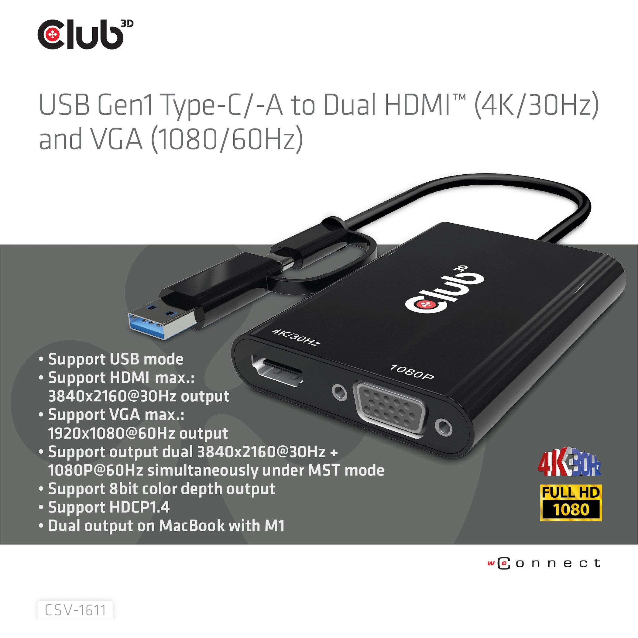 CLUB3D USB Gen1 Type-C/-A to Dual HDMI (4K/30Hz) / VGA (1080/60Hz). Maximale Auflösung: 3840 x 2160 Pixel, Bildwiederholfrequenz bei maximaler Auflösung: 30 Hz, Unterstützte Grafik-Auflösungen: 1920 x 1080 (HD 1080). Produktfarbe: Schwarz. Breite: 62,2 mm, Tiefe: 91 mm, Höhe: 14,1 mm. Gewicht der Papier-/Kartonverpackung: 58 g. Verpackungsart: Box, Verpackungsbreite: 80 mm, Verpackungstiefe: 35 mm