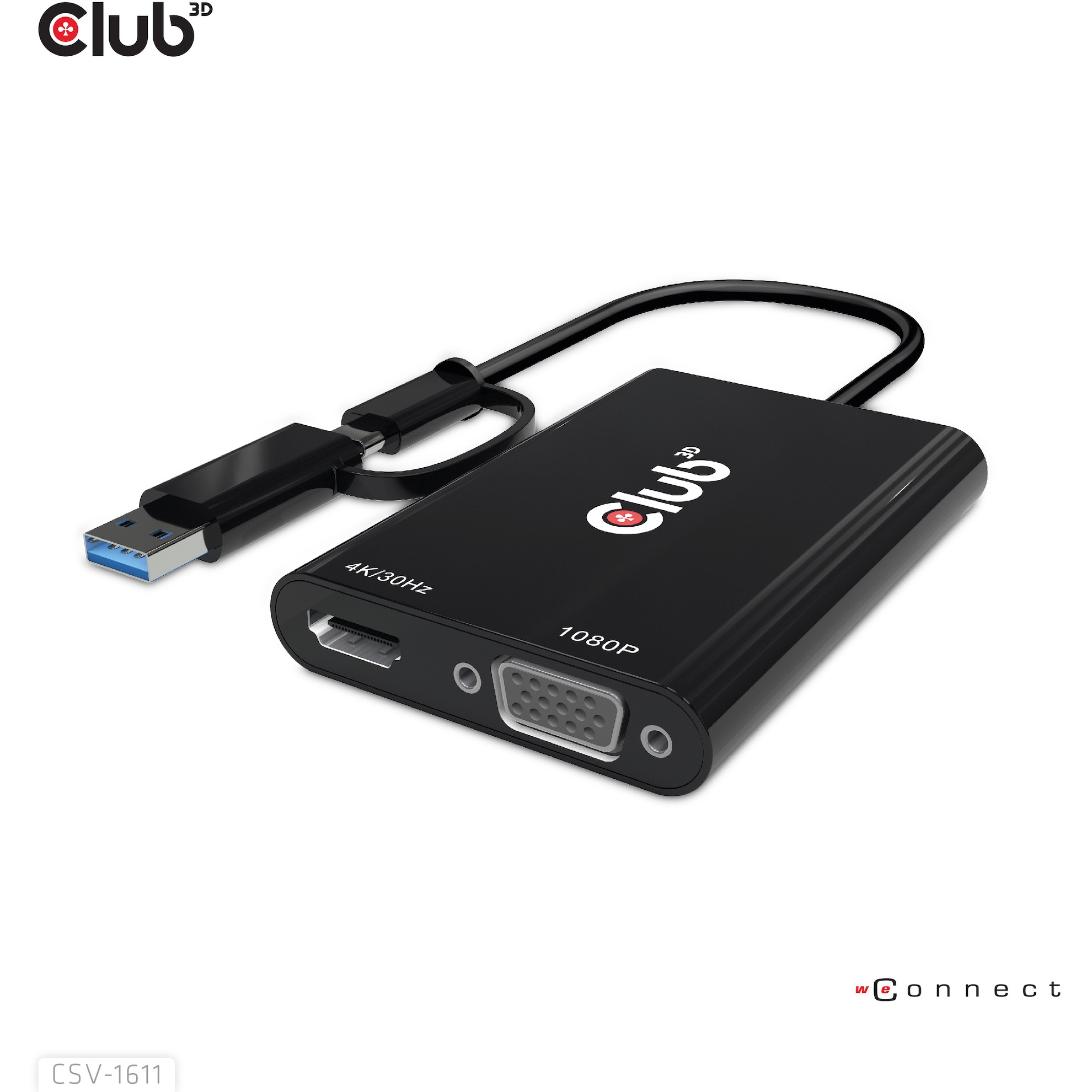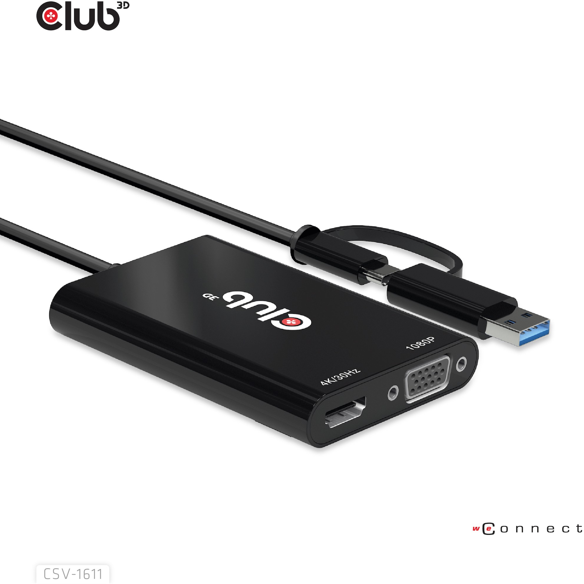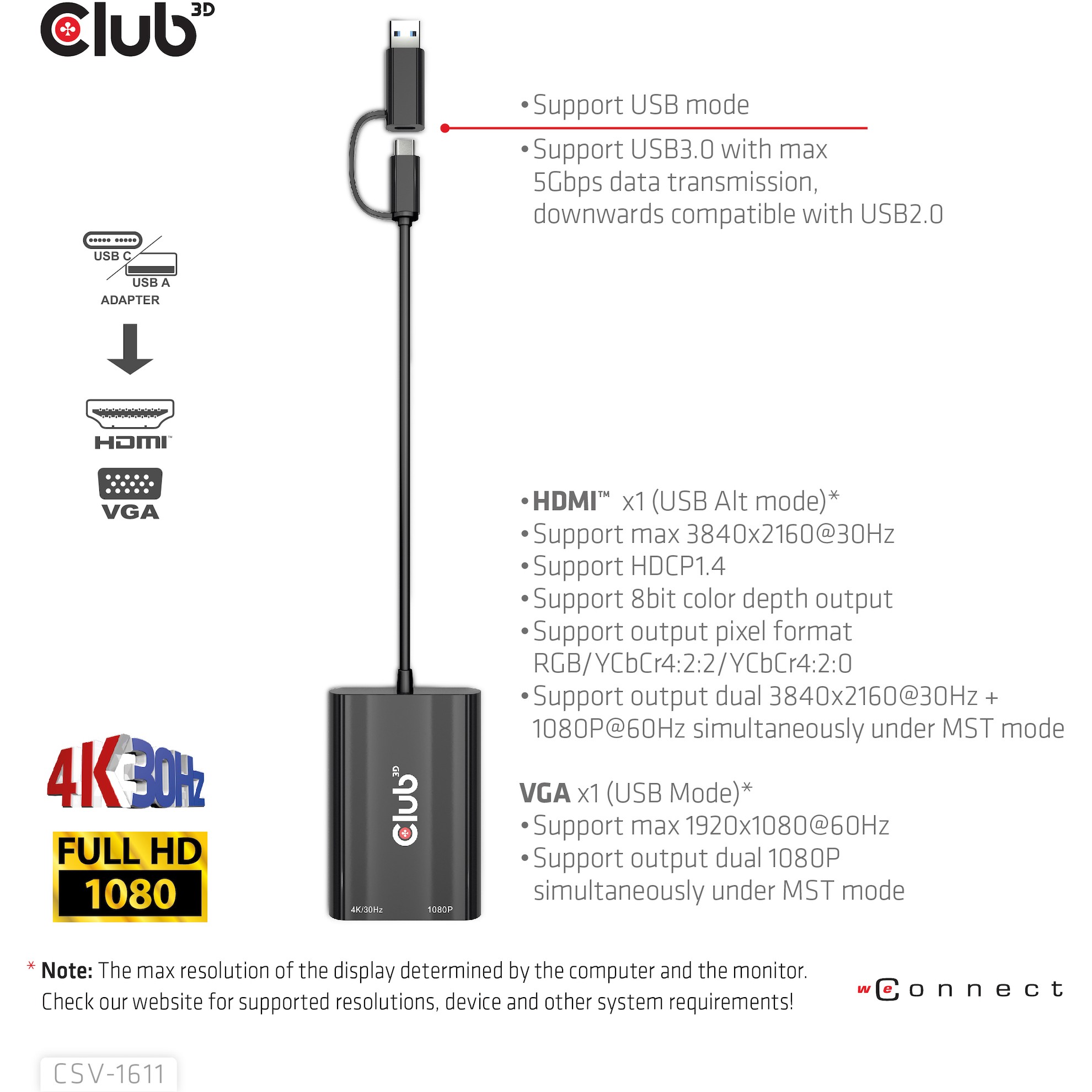 CLUB3D USB Gen1 Type-C/-A to Dual HDMI (4K/30Hz) / VGA (1080/60Hz). Maximale Auflösung: 3840 x 2160 Pixel, Bildwiederholfrequenz bei maximaler Auflösung: 30 Hz, Unterstützte Grafik-Auflösungen: 1920 x 1080 (HD 1080). Produktfarbe: Schwarz. Breite: 62,2 mm, Tiefe: 91 mm, Höhe: 14,1 mm. Gewicht der Papier-/Kartonverpackung: 58 g. Verpackungsart: Box, Verpackungsbreite: 80 mm, Verpackungstiefe: 35 mm