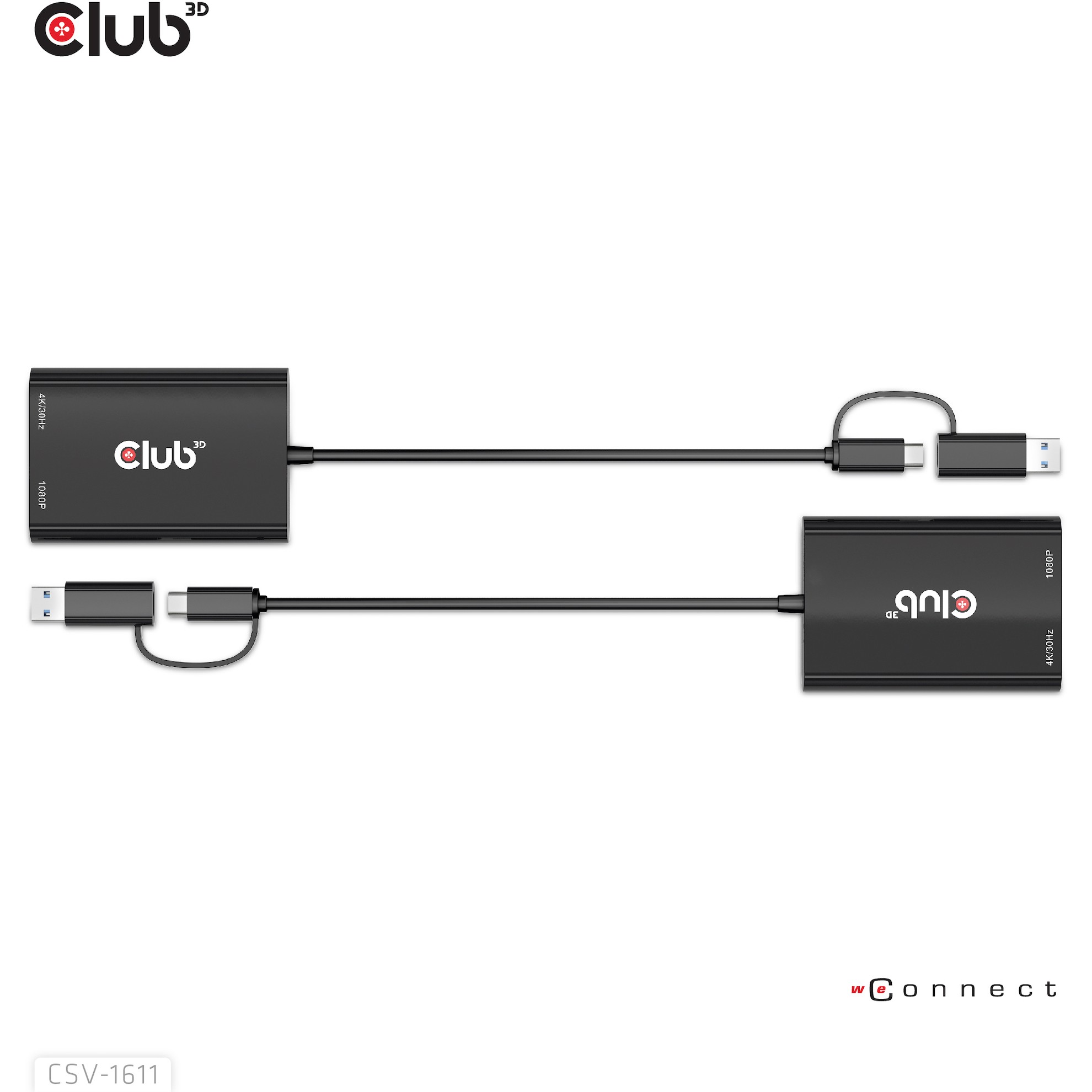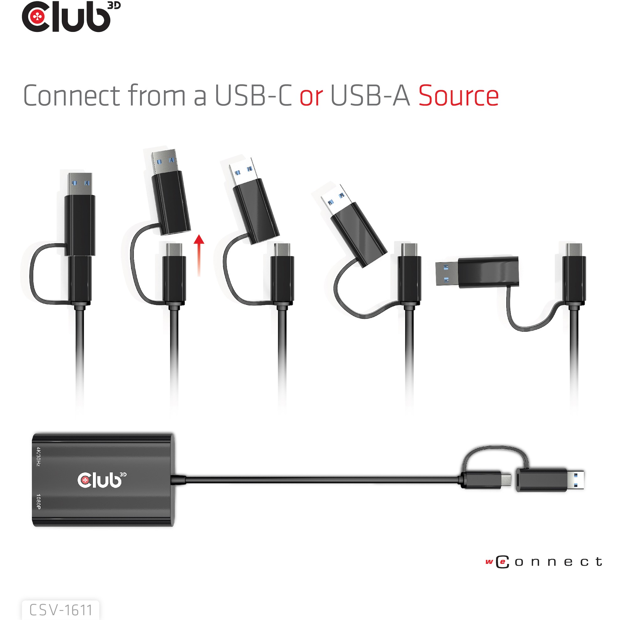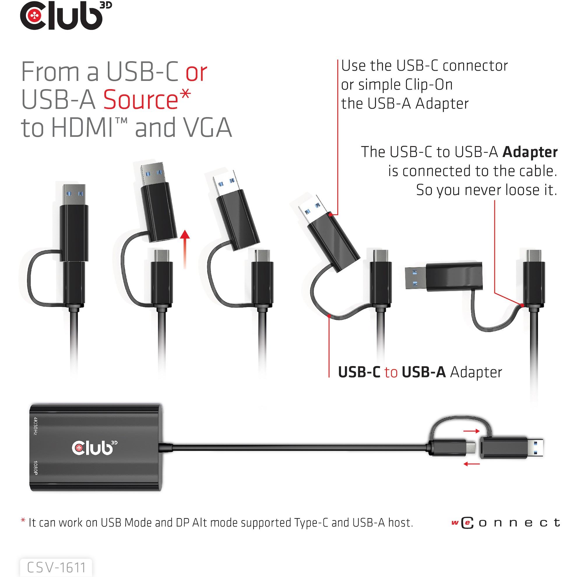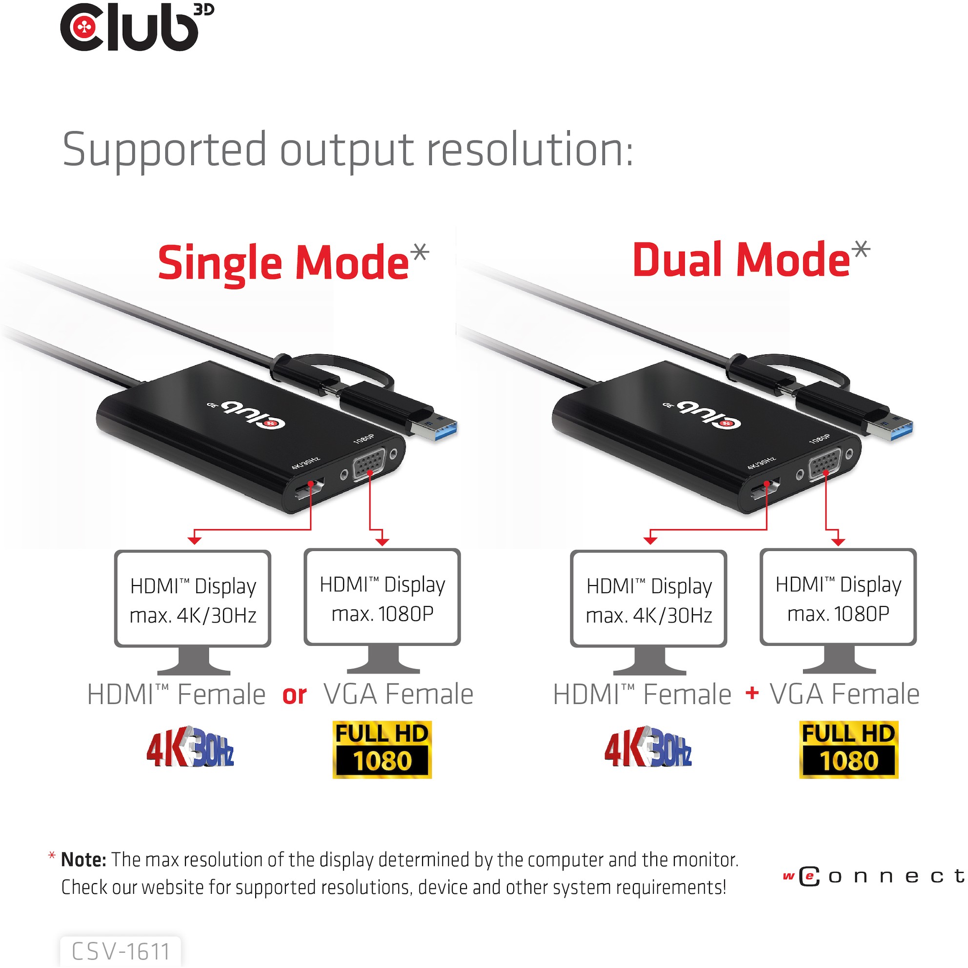 CLUB3D USB Gen1 Type-C/-A to Dual HDMI (4K/30Hz) / VGA (1080/60Hz). Maximale Auflösung: 3840 x 2160 Pixel, Bildwiederholfrequenz bei maximaler Auflösung: 30 Hz, Unterstützte Grafik-Auflösungen: 1920 x 1080 (HD 1080). Produktfarbe: Schwarz. Breite: 62,2 mm, Tiefe: 91 mm, Höhe: 14,1 mm. Gewicht der Papier-/Kartonverpackung: 58 g. Verpackungsart: Box, Verpackungsbreite: 80 mm, Verpackungstiefe: 35 mm