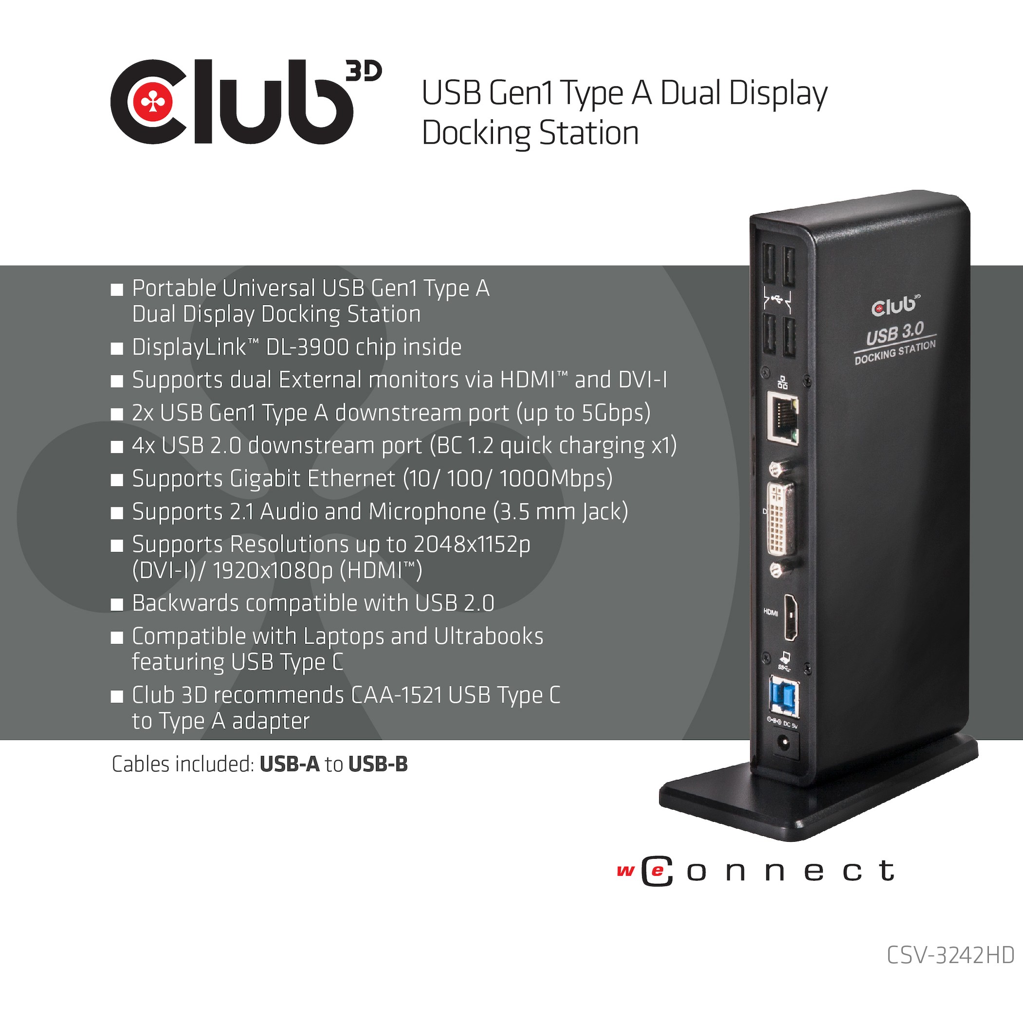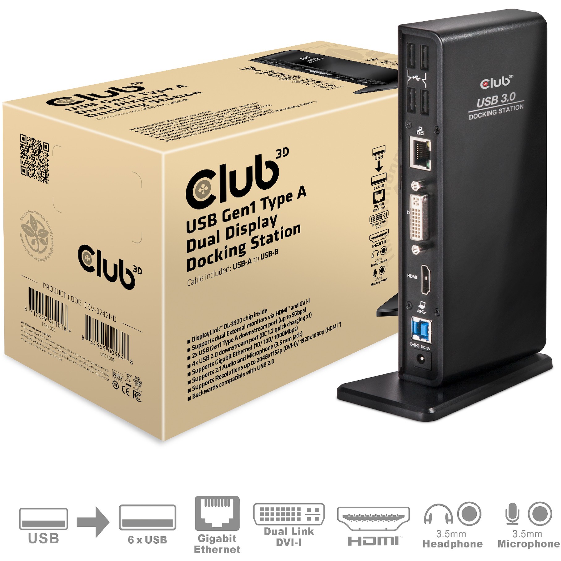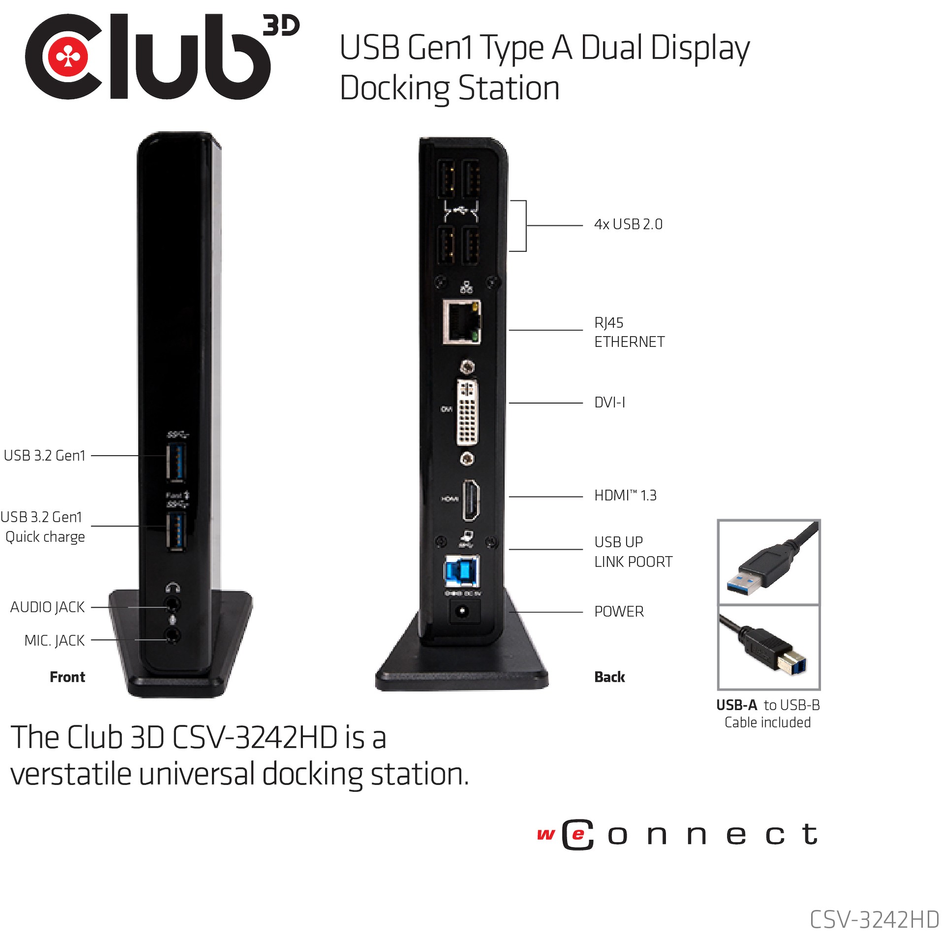 Die Club 3D USB 3.0 Dual Display Docking Station wurde entwickelt für Leute mit hohem Bedarf für zusätzliche Anschlüsse. Mit der Docking Station kannst Du die Anschlüsse deines Computers für mehr USB Peripheriegeräte, Ethernet Netzwerk, Lautsprecher und Mikrofon über nur ein USB Kabel erweitern.