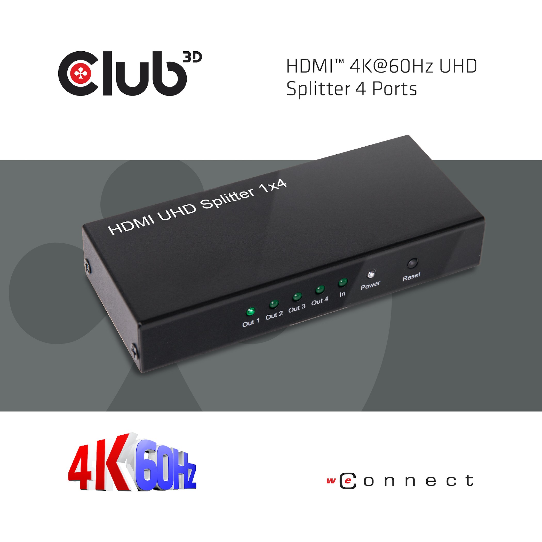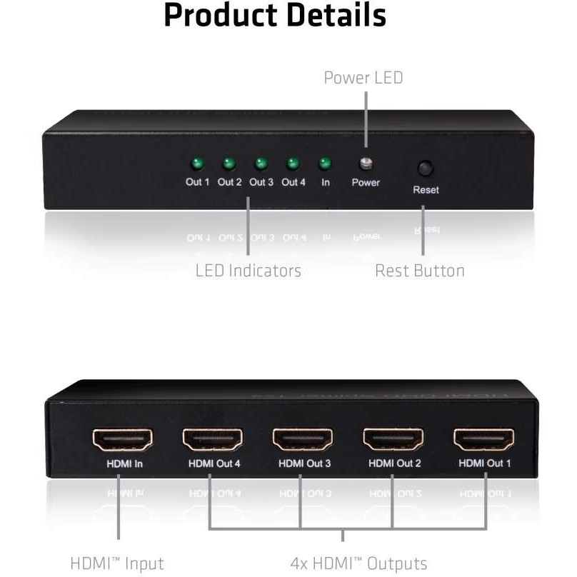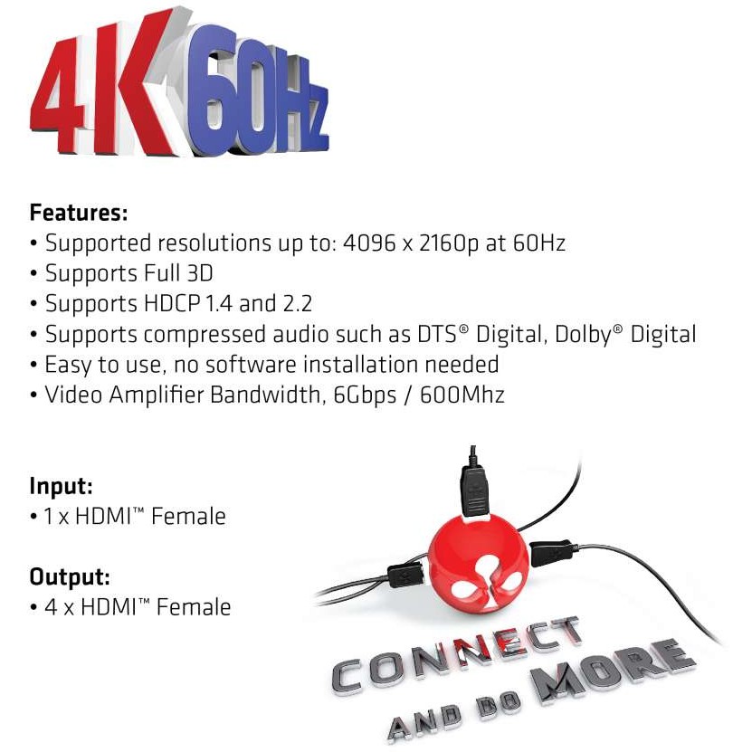 Auflösung von bis zu 4K @ 60Hz und digitalem Audio vom Eingangssignal an bis zu vier angeschlossenen 4K UHD Fernseher, Monitore oder Projektoren weiter.