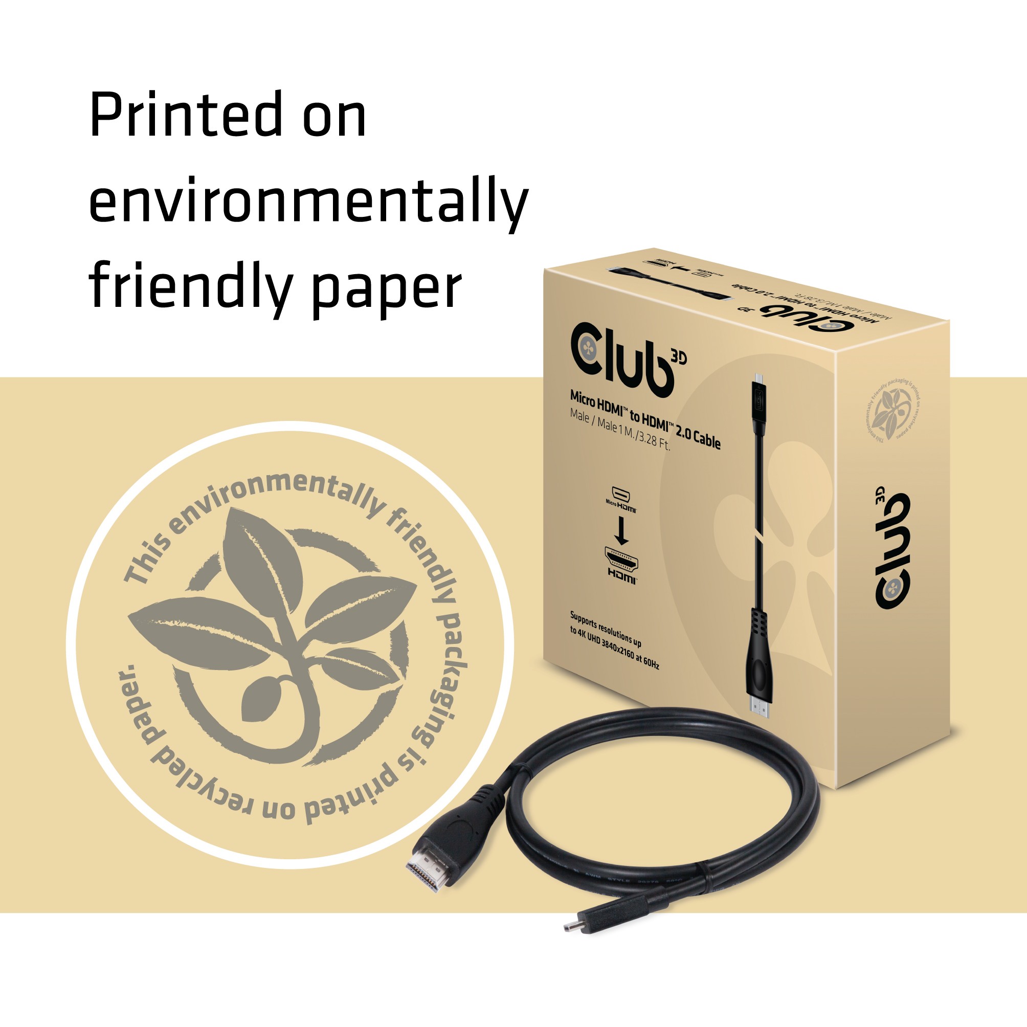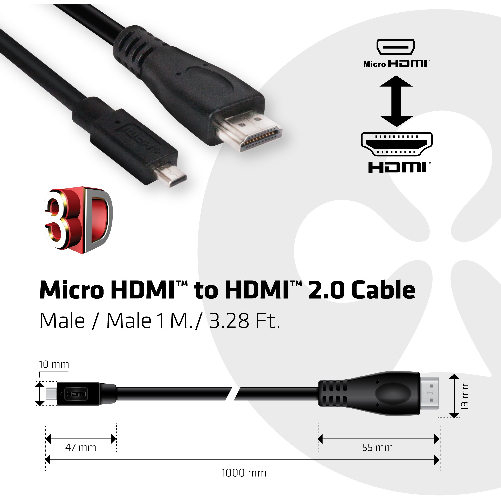Das Club 3D Micro HDMI™ zu HDMI™ 2.0 Kabel liefert ein UHD Signal für klare,natürliche Bilder und Klang. Es ermöglicht Ihnen, Ihre Digitalkamera/Camcorder, Mini PC, Pico Projektor oder anderes Gerät mit Micro HDMI™ Ausgang an einen 4K UHD TV, Monitor Oder Projektor mit HDMI™ (Typ A) Eingang anzuschließen. Es unterstützt voll und ganz die Premium High Speed HDMI™ mit Ethernet Spezifikation, um sicherzustellen, dass Video bis zu 4K UHD 3840x2160p bei 60Hz funktioniert, sowie Audio und Datenströme. Das Kabel kombiniert die unerreichte Signalqualität und den Komfort der HDMI™ Konnektivität mit der Kraft und Flexibilität des Home Entertainment Networking. Das Micro HDMI™ auf HDMI™ 2.0 Kabel hat Premium-Qualität, ideal für den Einsatz mit (Semi) professioneller Ausrüstung, die Ultra High Definition Auflösungen unterstützt.