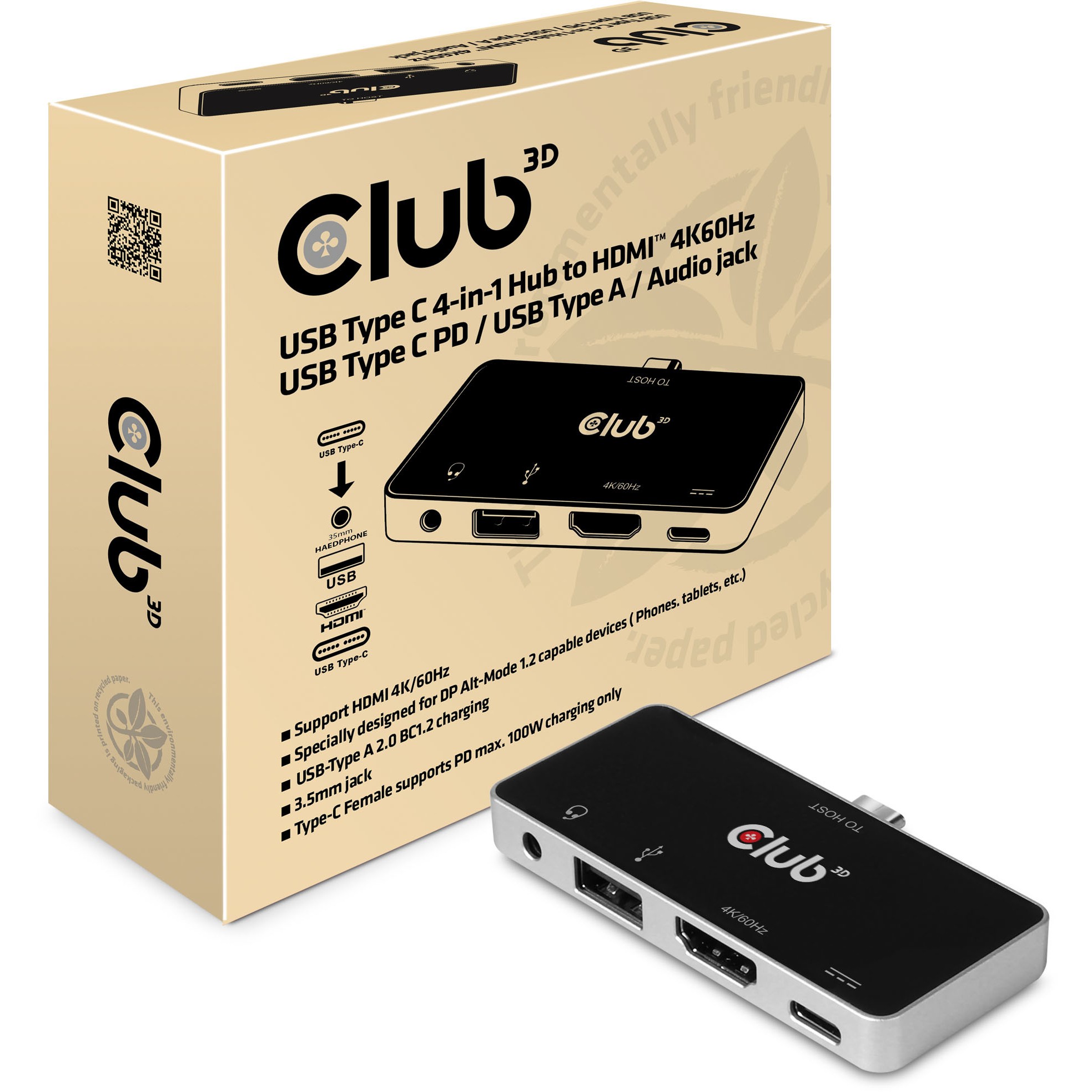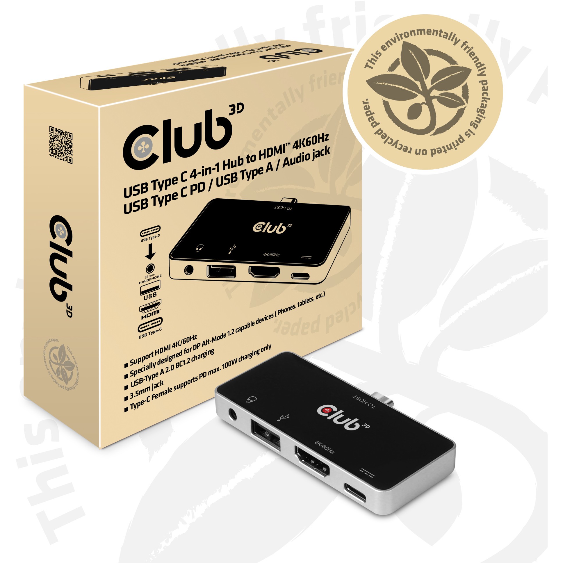 CSV-1591- Club 3D Hub ist ein 4-in-1 USB Typ C Hub mit HDMI™, USB Typ-A 2.0, 3.5mm Audio und USB Typ C PD Ladefunktion. Das Design ist perfekt für alle DP Alt-Mode geeigneten Produkte. Mit diesem Hub können Sie Ultra High Definition Video Ihres Rechners auf einem großen Bildschirm oder auch fantastische Musik genießen, USB 2.0 Daten übertragen und USB Typ C PD Adapter verbinden um Ihren Host zu laden