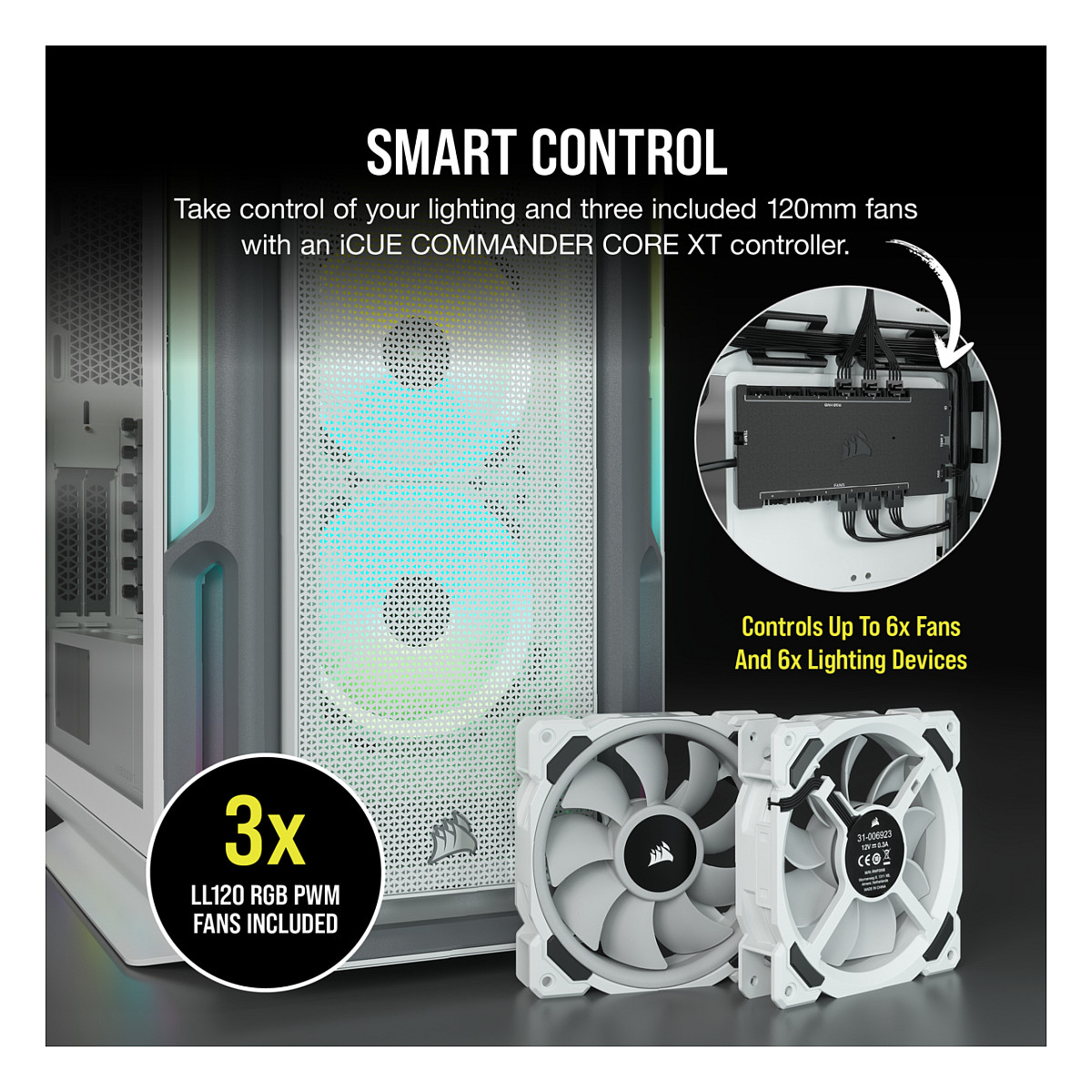 Corsair iCUE 5000T RGB. Formfaktor: Midi Tower, Typ: PC, Produktfarbe: Weiß. Unterstützte Stromversorgungs-Formfaktoren: ATX. Installierte Lüfter (Vorderseite): 3x 120 mm, Durchmesser unterstützte Vorderseitenlüfter: 120,140 mm, Durchmesser unterstützter Rückseitenlüfter: 120 mm. Unterstützte Hard-Disk Drive Größen: 2.5,3.5", SSD-Formfaktor: 2.5". Breite: 251 mm, Tiefe: 530 mm, Höhe: 560 mm
