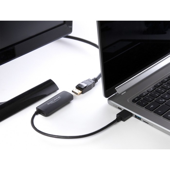 Mit diesem Adapter von Delock kann ein DisplayPort Monitor an eine freie HDMI Schnittstelle eines PCs oder Notebooks angeschlossen werden. Der Adapter wird an die HDMI Buchse des PCs oder Notebooks angeschlossen und mit einem vorhandenen DisplayPort Kabel mit dem Monitor verbunden.