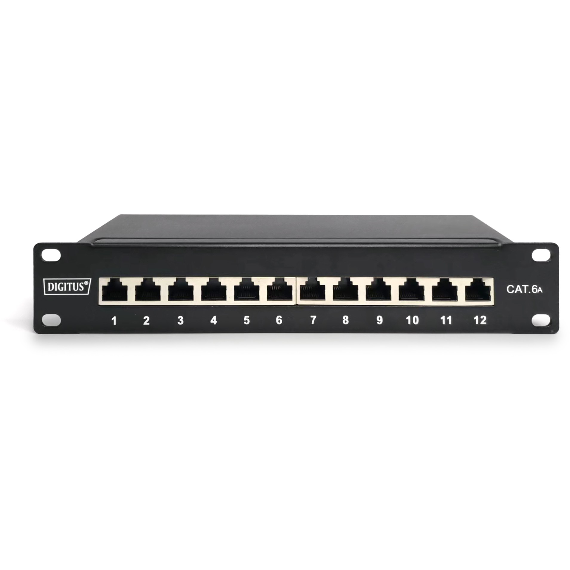 Das DIGITUS® CAT 6A Patch Panel ist erhältlich in der 12-Port Version und stellt mit dem 1,5 mm galvanisiertem kaltgewalzten Stahl ein robustes Patch Panel für die 10" Schrankmontage dar. Es entspricht dem (IEEE 802.3at/af) PoE+ Standard. Das Patch Panel ist elektromagnetisch abgeschirmt und bietet somit verlust- und störungsfreie Weiterleitung der Daten Ihrer Netzwerkinfrastruktur. Die 360° Schirmung an den Kontaktierungsstellen stellt sicher, das auch jeder einzelne Konsolidierungspunkt sauber abgeschirmt wird.