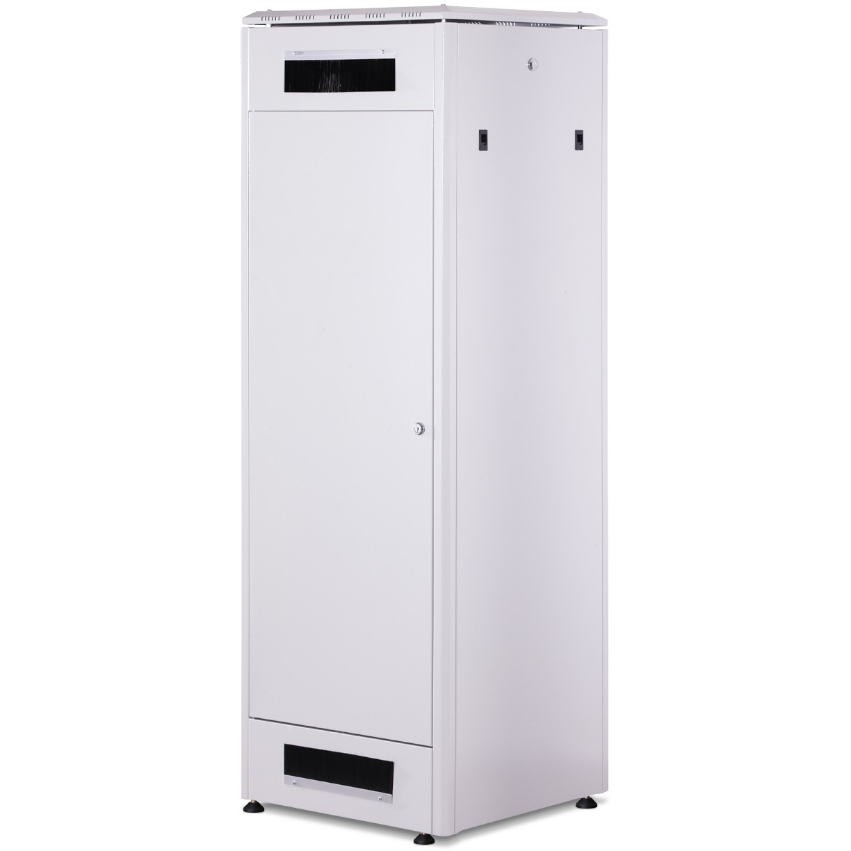 Die Netzwerkschränke der Unique Serie wurden für eine besonders komfortable und flexible Netzwerkverkabelung designt und produziert. Durchdachte Optimierungen bieten marktkonforme Stabilität bei maximaler Flexibilität. Ein modular, durch verschraubte 483 mm (19")-Blindplatten öffenbares Bodenchassis bietet ausreichend Platz für Kabel aller Art. Darüber hinaus befinden sich Kabeleinlässe mit Bürste im hinteren Bereich des Bodenchassis. Rückseitige Bürstenleisten ober- und unterhalb der Rücktür (ab 26HE), ermöglichen den Einsatz bei verschiedensten Anwendungsszenarien. Großzügige vertikale Kabelkanäle mit Kabelführungshilfen und Blende, verbaut in der Frontseite (ab 800 mm Schrankbreite), runden die vielfältigen Eigenschaften des Netzwerkschranks einwandfrei ab. Zwei Paar verkröpfte und galvanisch verzinkte, mit gegenläufig ablesbaren Höheneinheiten beschriftete 483 mm (19")-Profilschienen sind im Inneren verbaut. Sie lassen sich stufenlos verstellen und sind mit zusätzlichen Tiefenstreben im Schrank verbunden. Jeder Schrank ist eine robuste Stahlkonstruktion aus bis zu 1,5 mm starkem Stahlblech. Die Farbgebung erfolgt in Form von elektrostatischer Pulverbeschichtung in den Standardfarben Grau (RAL 7035) und Schwarz (RAL 9005). Modular abschließ- und abnehmbare Seitenwände sowie Türen verbessern die Zugänglichkeit. Ein Türanschlagswechsel kann vorgenommen werden. Des Weiteren sind die Schränke auf Grund der zerlegbaren Konstruktion bei Bedarf komplett demontierbar.