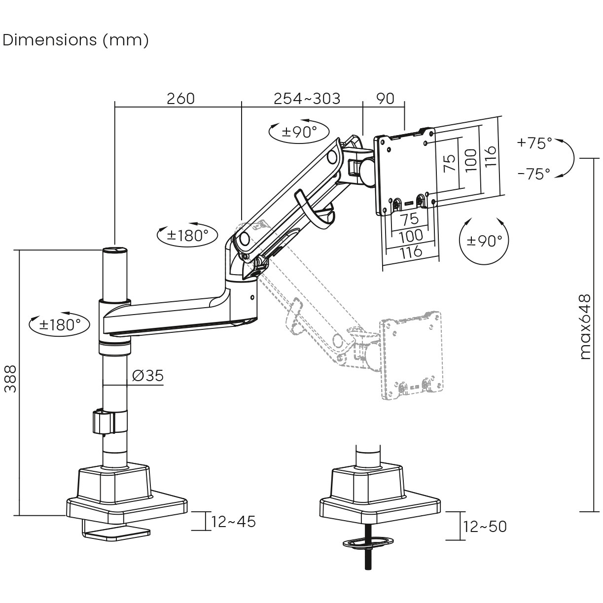 Single Monitorhalterung – Vollbeweglich, belastbar, platzsparend Die vollbewegliche Tischhalterung für Einzelmonitore überzeugt durch ihre robuste Heavy-Duty-Konstruktion und trägt zuverlässig Flat- oder Curved-Bildschirme mit einer Größe von bis zu 57 Zoll und einem Gewicht von bis zu 27 kg. Durch das integrierte Gasfeder-System mit justierbarem Federspannungsmechanismus lässt sich der Monitor mühelos und präzise in Position bringen – ganz nach individuellem Bedarf. Mit großzügigem Bewegungsspielraum ermöglicht die Halterung das Neigen, Schwenken, Drehen sowie die stufenlose Höheneinstellung des Monitors und sorgt so für ergonomisches Arbeiten und optimalen Betrachtungskomfort. Die VESA Quick-Release-Funktion erlaubt eine schnelle und werkzeuglose Montage oder Demontage des Bildschirms, während die Schnellverschlusskupplung eine zügige Installation der Arme gewährleistet. Die Halterung wird vollständig von oben auf dem Schreibtisch montiert und bietet zwei flexible Befestigungsoptionen – sowohl per Tischklemme als auch über eine Durchführung. Dank des integrierten Kabelmanagements bleibt der Arbeitsplatz stets aufgeräumt. Eine zusätzliche Pole-Halterung erweitert die Einstellmöglichkeiten und rundet das funktionale Design ab.