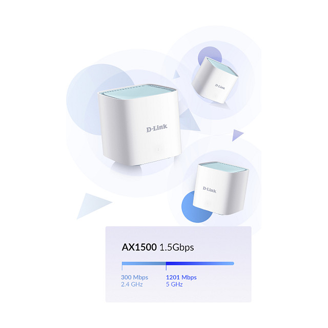 D-Link EAGLE PRO AI AX1500. Produktfarbe: Weiß, Antennentyp: Intern, Produkttyp: Mesh-System. WLAN-Band: Dual-Band (2,4 GHz/5 GHz), Top WLAN-Standard: Wi-Fi 6E (802.11ax), WLAN-Standards: 802.11a, 802.11b, 802.11g, Wi-Fi 4 (802.11n), Wi-Fi 5 (802.11ac), Wi-Fi 6 (802.11ax). Virtueller Assistent: Amazon Alexa & Google Assistant, Firewall: DoS, Stateful Packet Inspection, Anti-spoofing Checking, IP/MAC Address Filtering, 1 x DMZ, Unterstützt Mac-Betriebssysteme: Mac OS X 10.10 Yosemite, Mac OS X 10.11 El Capitan, Mac OS X 10.12 Sierra, Mac OS X 10.13 High.... Stromverbrauch (Standardbetrieb): 12 W, AC Eingangsspannung: 12 V, AC-Adapter Eingangsstrom: 1 A. Konformitätsbescheinigungen: CE, Zertifizierung: FCC