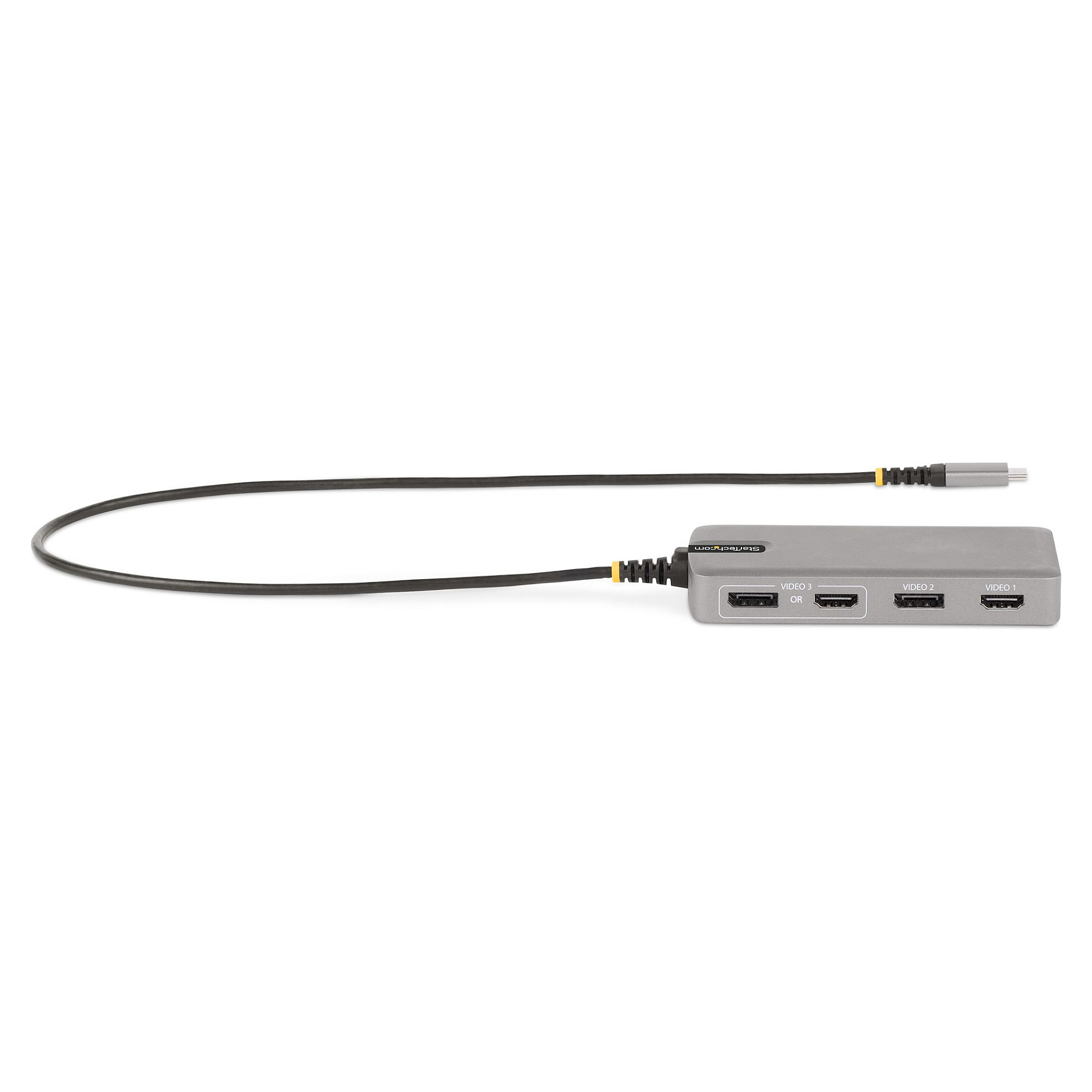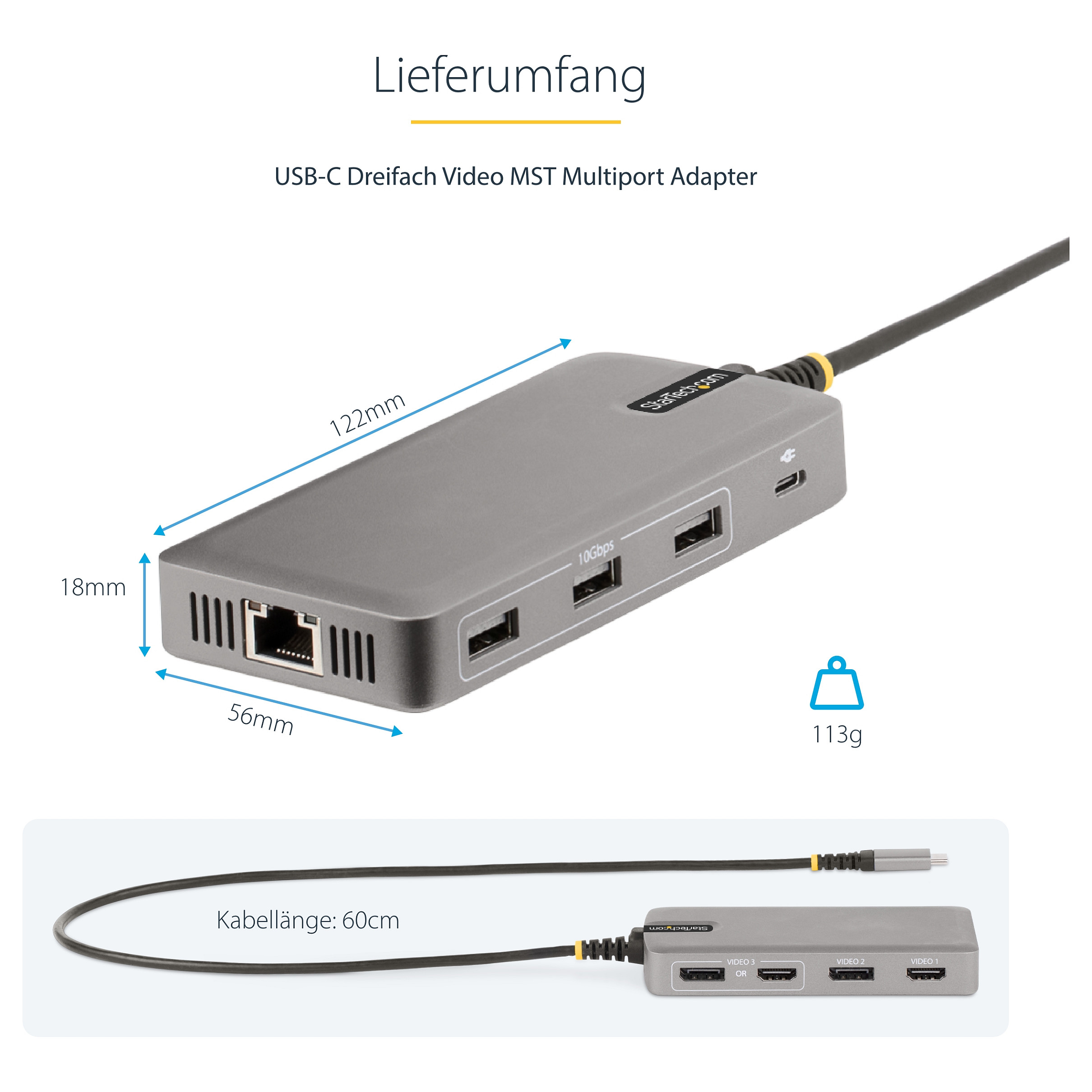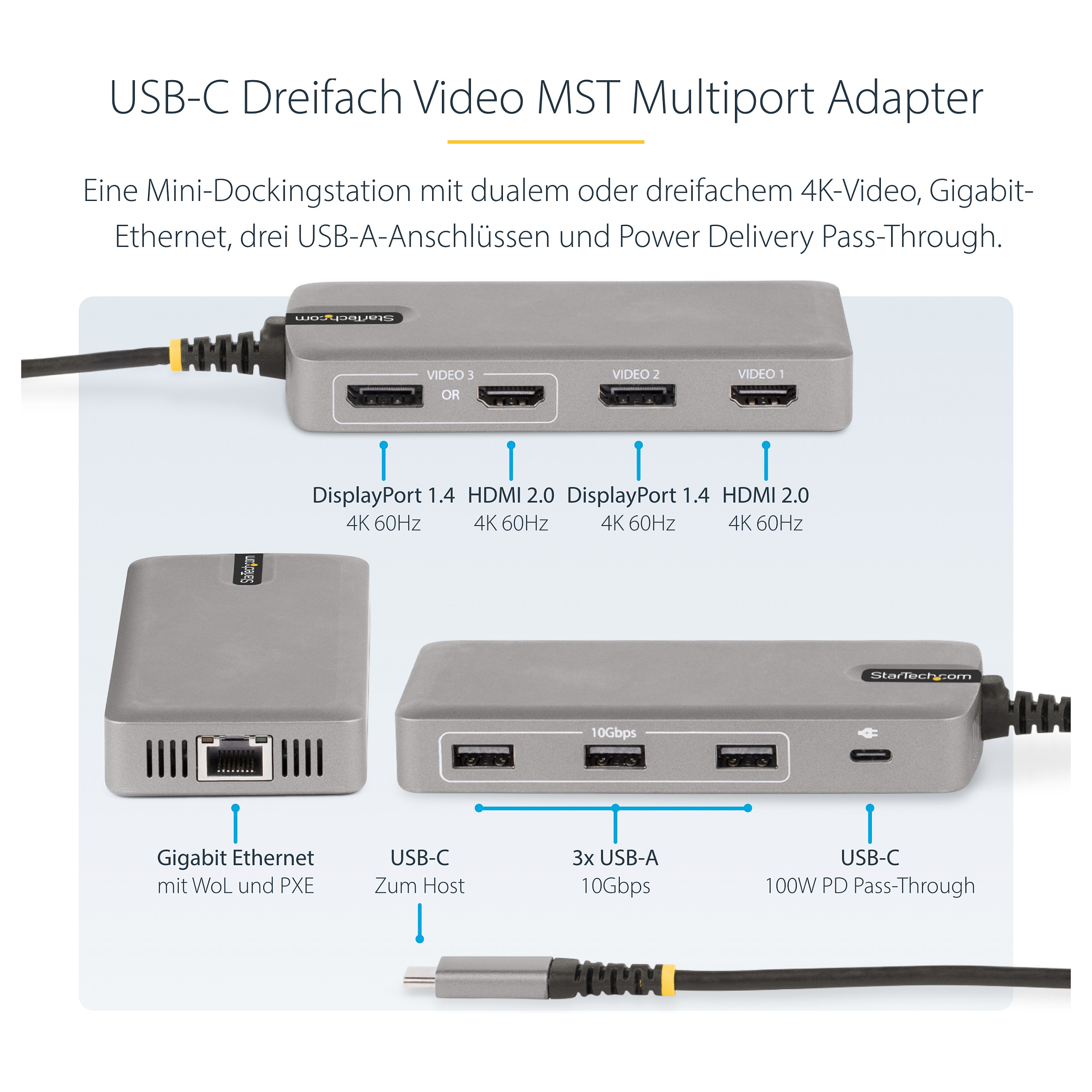 Dieser USB Typ-C Multiport Adapter nutzt DP 1.4 Alt Mode und MST-Technologien von einem Host Computer, um bis zu drei DisplayPort und/oder HDMI Bildschirme zu unterstützen. Die USB-C Dockingstation bietet 2x HDMI Ausgänge, 2x DisplayPort Ausgänge, einen 3-Port USB 3.2 Gen 2 Typ-A (10Gbit/s) Hub und einen Gigabit Ethernet Port, alles über eine Verbindung zum USB-C oder Thunderbolt 3/4™ Port eines Laptops. Es bietet außerdem eine leistungsstarke Stromversorgung über einen dedizierten USB-C Power Delivery (PD) 3.0 Pass-Through Port via einen integrierten 60 cm USB-C Host-Kabel. Der USB-C Multiport Adapter bietet eine treiberlose Installation für eine problemlose Einrichtung.