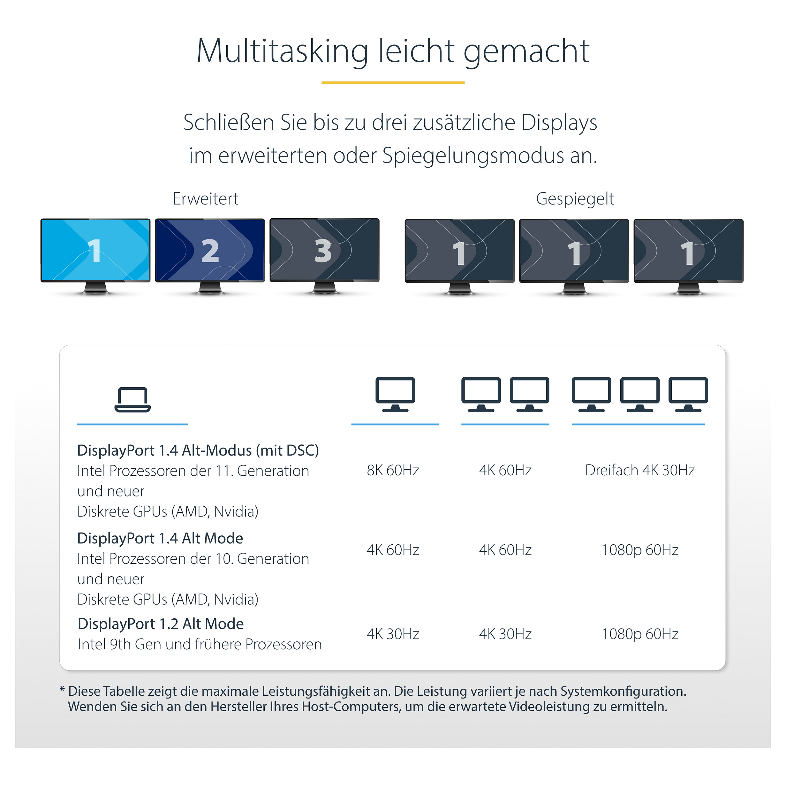 Die Video-Performance, wie z. B. die Auflösung und die Bildwiederholfrequenz aller drei Monitore, hängt von der Grafikprozessoreinheit (GPU) des Host-Computers ab. Um die maximale Performance zu erreichen, ist ein Gerät mit Unterstützung für DisplayPort 1.4 mit DSC und MST erforderlich. Überprüfen Sie die Spezifikationen des Host-Computers und der Monitore, um die erwartete Video-Performance zu ermitteln.