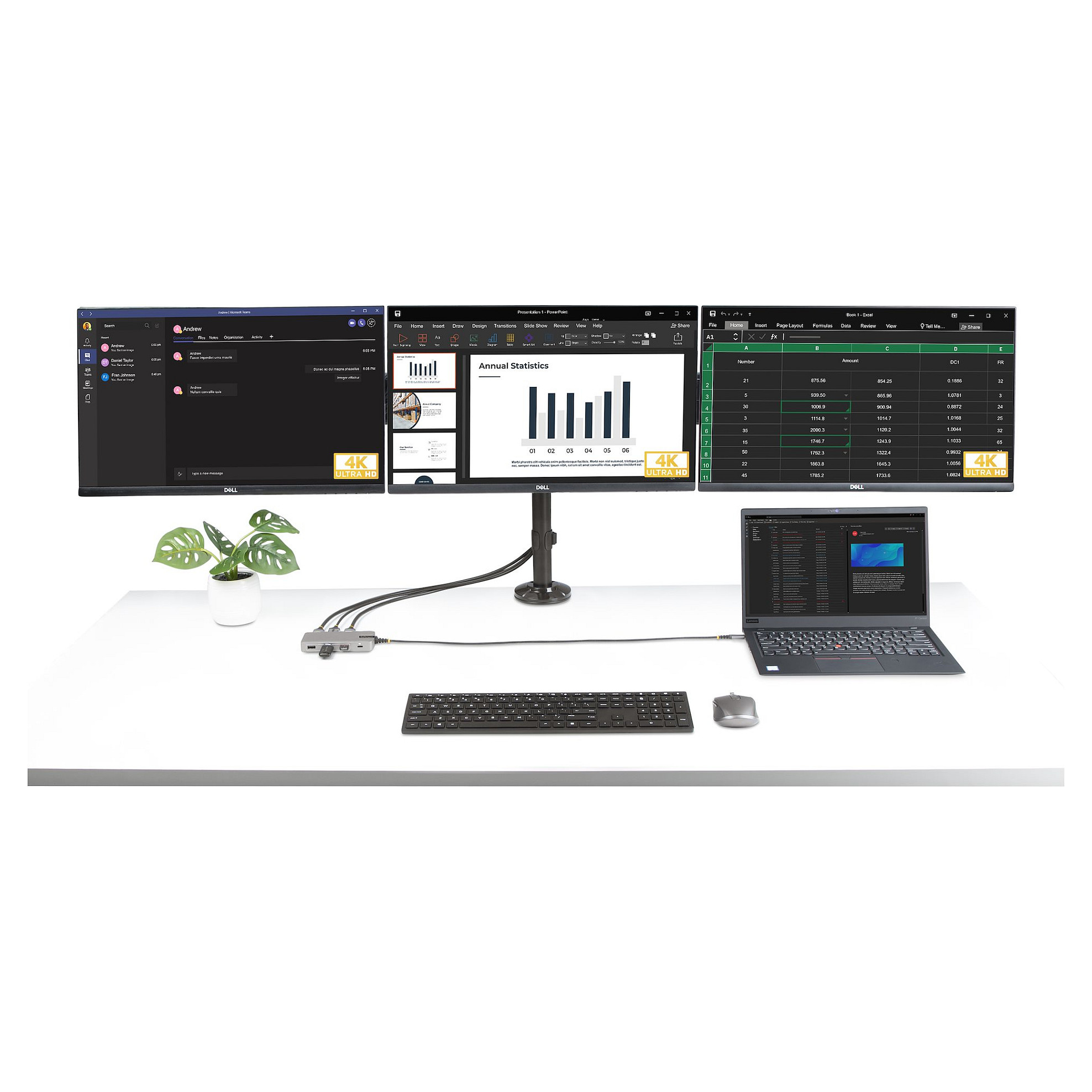 Erstellen Sie eine mobile Workstation mit zwei- oder dreifachem 4K-Video über HDMI und/oder DisplayPort (MST-Unterstützung erforderlich), drei USB-A Ports, Gigabit Ethernet und pass-through power delivery zum Laden des Laptops