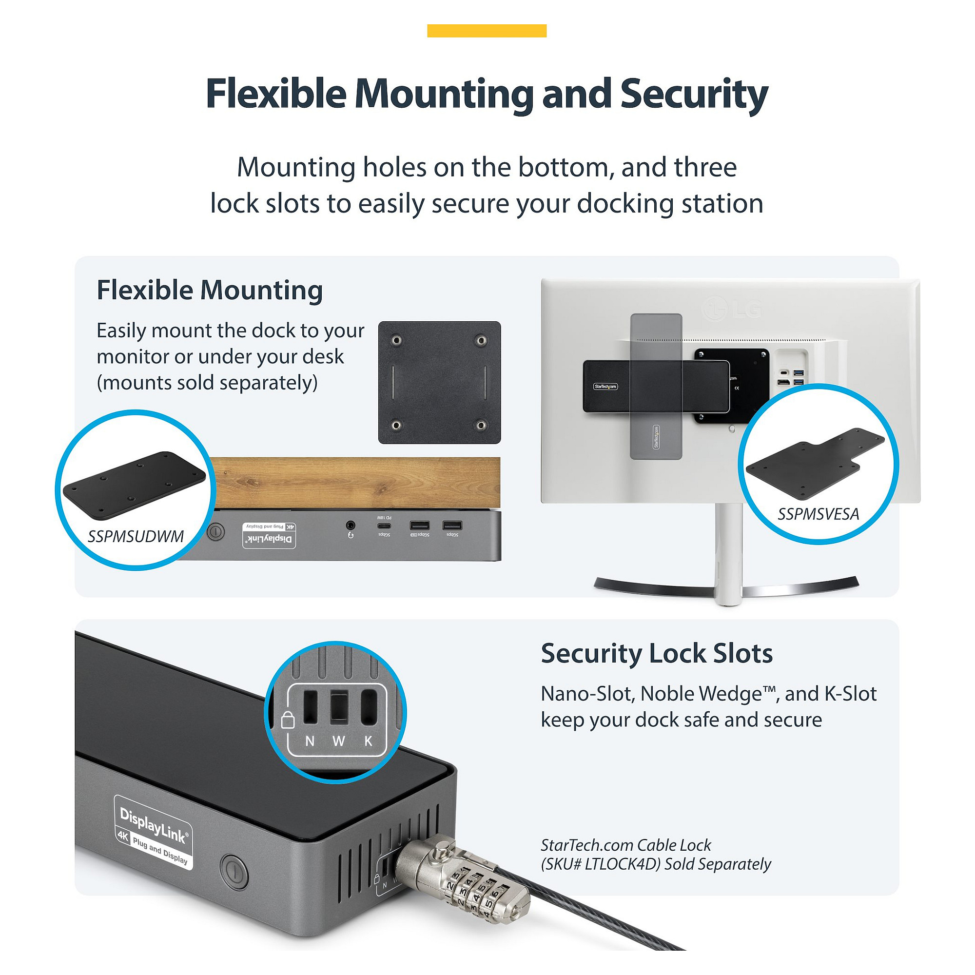 Der integrierte 2,5GbE Anschluss ermöglicht High-Speed Datenübertragungen und unterstützt PXE-Boot, Jumbo Frames und Wake-on-LAN. Integrierte Schlossschlitze und optionale Montagemöglichkeiten (SSPMSUDWM, DOCK-NUC-VESA-MOUNT, SSPMSVESA) erhöhen die physische Sicherheit der Dockingstation.