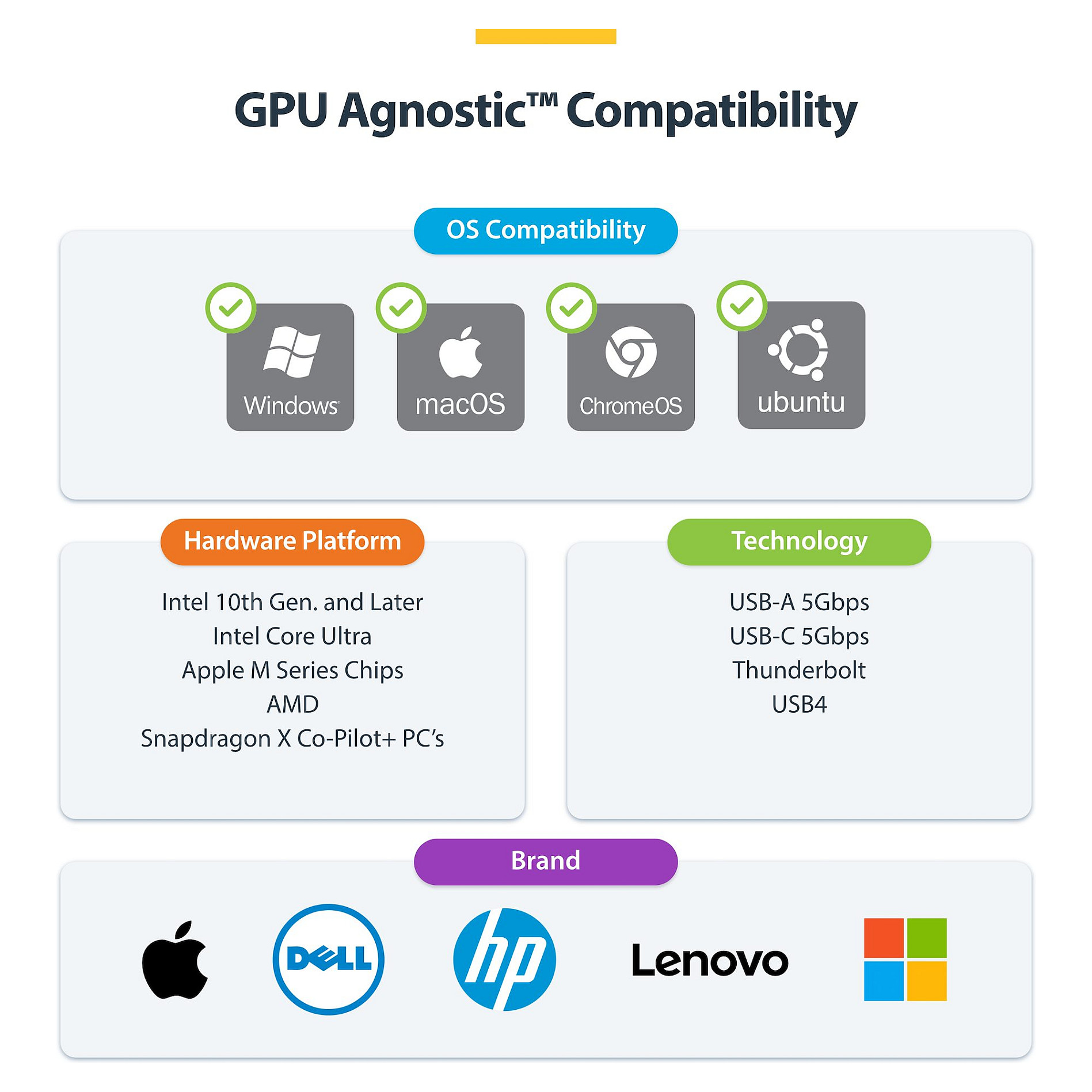 DisplayLink-basierte HDMI- und DisplayPort-Ausgänge ermöglichen Multi-Monitor-Setups unter macOS, Windows und ChromeOS. Der USB-C-Videoausgang nutzt die integrierte GPU des Laptops für eine leistungsstarke Videoausgabe. Eine einheitliche Treiberlösung vereinfacht die Einrichtung von Hot Desks, reduziert den IT-Supportaufwand und sorgt für gleichbleibende Leistung an mobilen und temporären Arbeitsplätzen.
