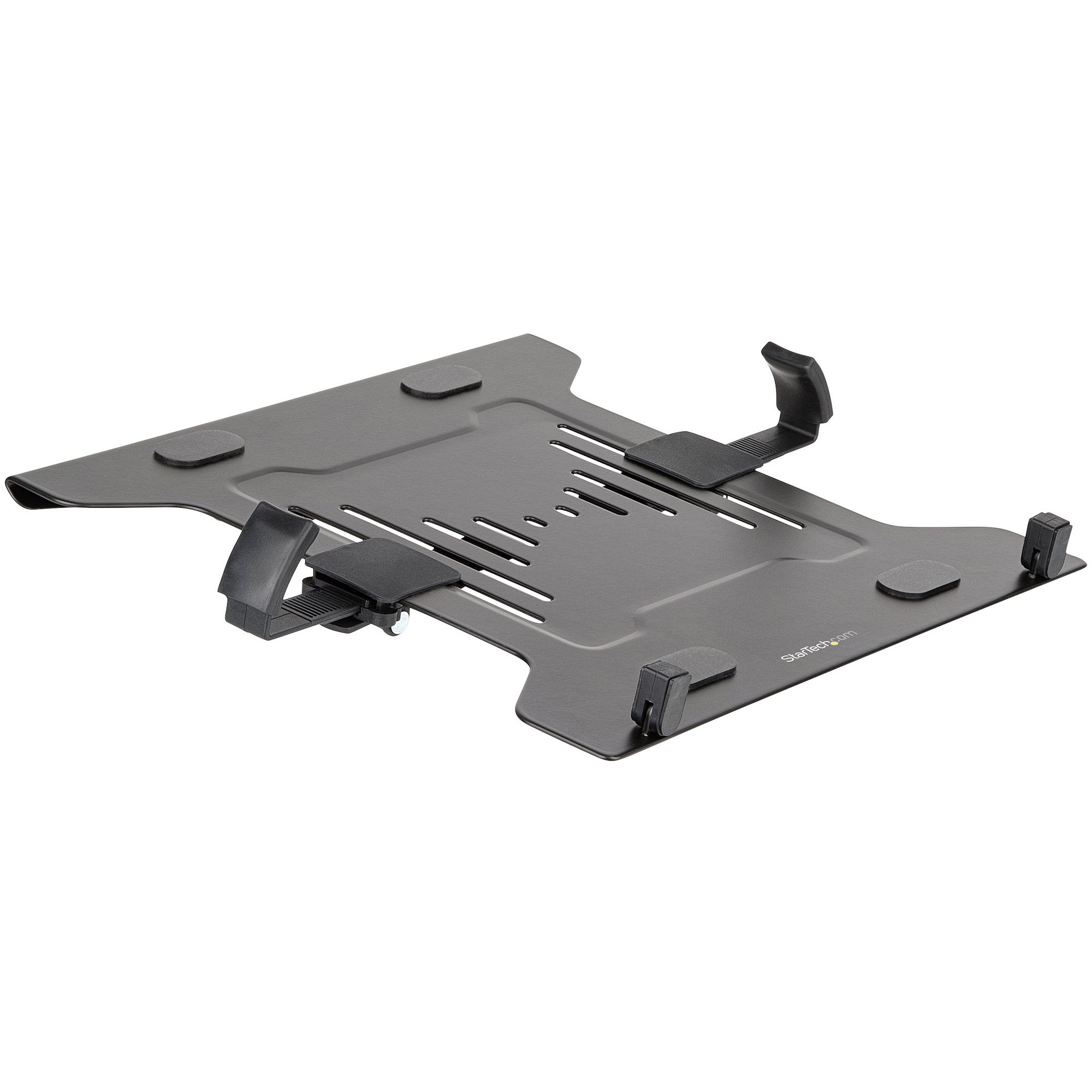 Die Notebook Ablage ist aus Stahl gefertigt, um eine solide Unterstützung zu bieten, und verfügt über Lüftungsschlitze an der Unterseite für eine optimale Luftzirkulation. Die gepolsterte Ärme halten den Laptop fest und können unabhängig voneinander an den Seiten der Ablage positioniert werden, so dass die Anschlusse des Laptops nicht blockiert werden. Vier rutschfeste Gummipads verhindern ein Verrutschen des Laptops und vermeiden Kratzer auf der Unterseite. Höhenverstellbare Stopper am Ablage verhindern das Abrutschen des Laptops in steileren Winkeln. Optional können die gepolsterte Ärme abgenommen werden, um jede Laptop Dicke zu unterstützen, was jedoch zu Lasten der Unterstützung bei steileren Winkeln geht.