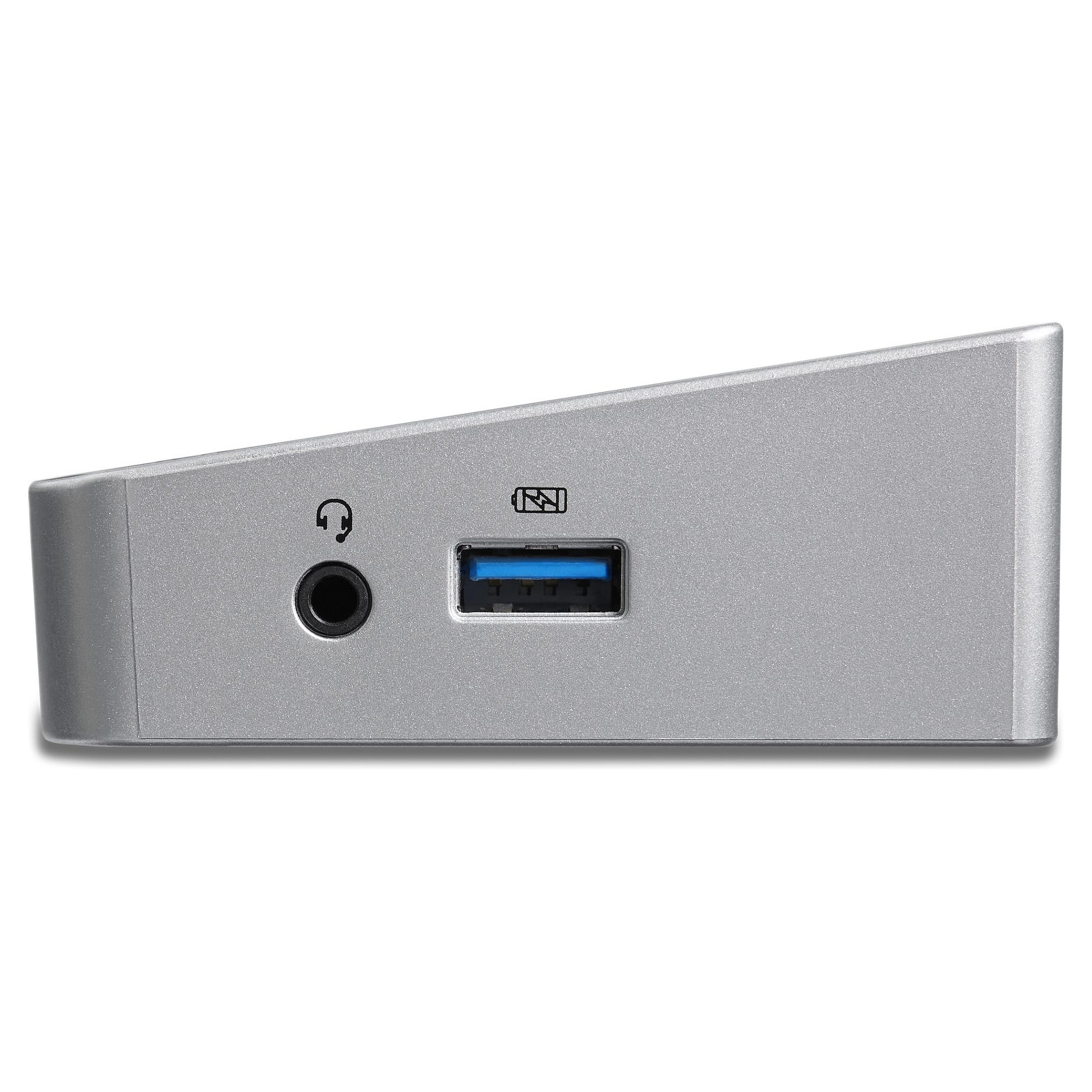 Mit dieser Dockingstation für drei Bildschirme können Sie aus Ihrem Notebook so eine vollständige Workstation machen. Sie bietet Ihnen fünf USB 3.0-Anschlüsse (1x USB Typ C und 4x USB Typ A inkl. 1x Schnelllade-Anschluss), einen Gigabit-Ethernet-Anschluss, eine Kopfhörerbuchse und separate 3,5-mm-Audio- und Mikrofonanschlüsse.