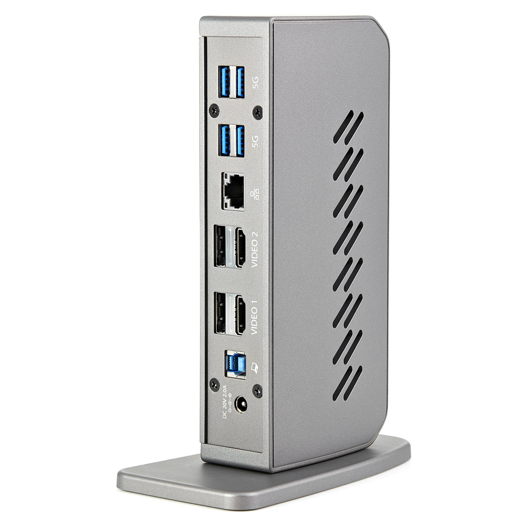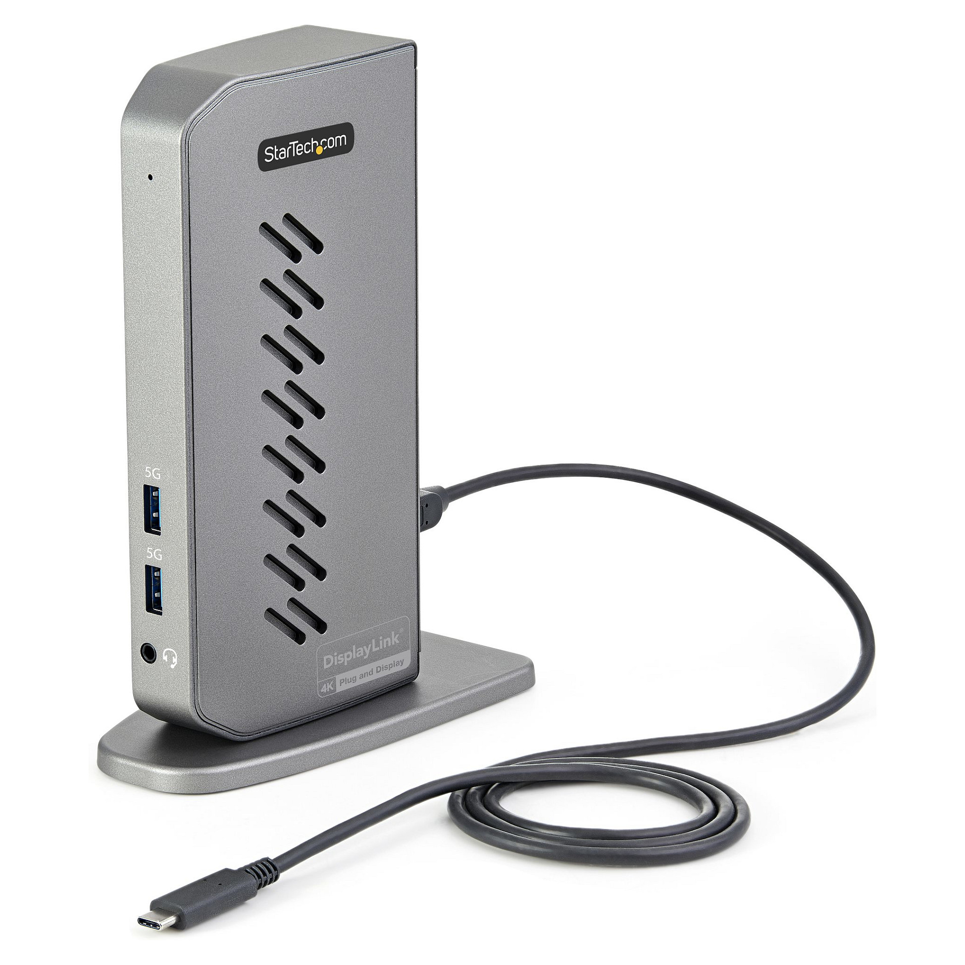 Verbinden Sie Ihre Geräte mit 6 nachgeschalteten USB Type-A Anschlüssen (USB 3.0; 5 Gbit/s), 2 auf der Vorderseite und 4 auf der Rückseite. Das Dock verfügt über einen GbE-Anschluss und eine 4-fach verstellbare 3,5 mm-Headset-Audiobuchse.
