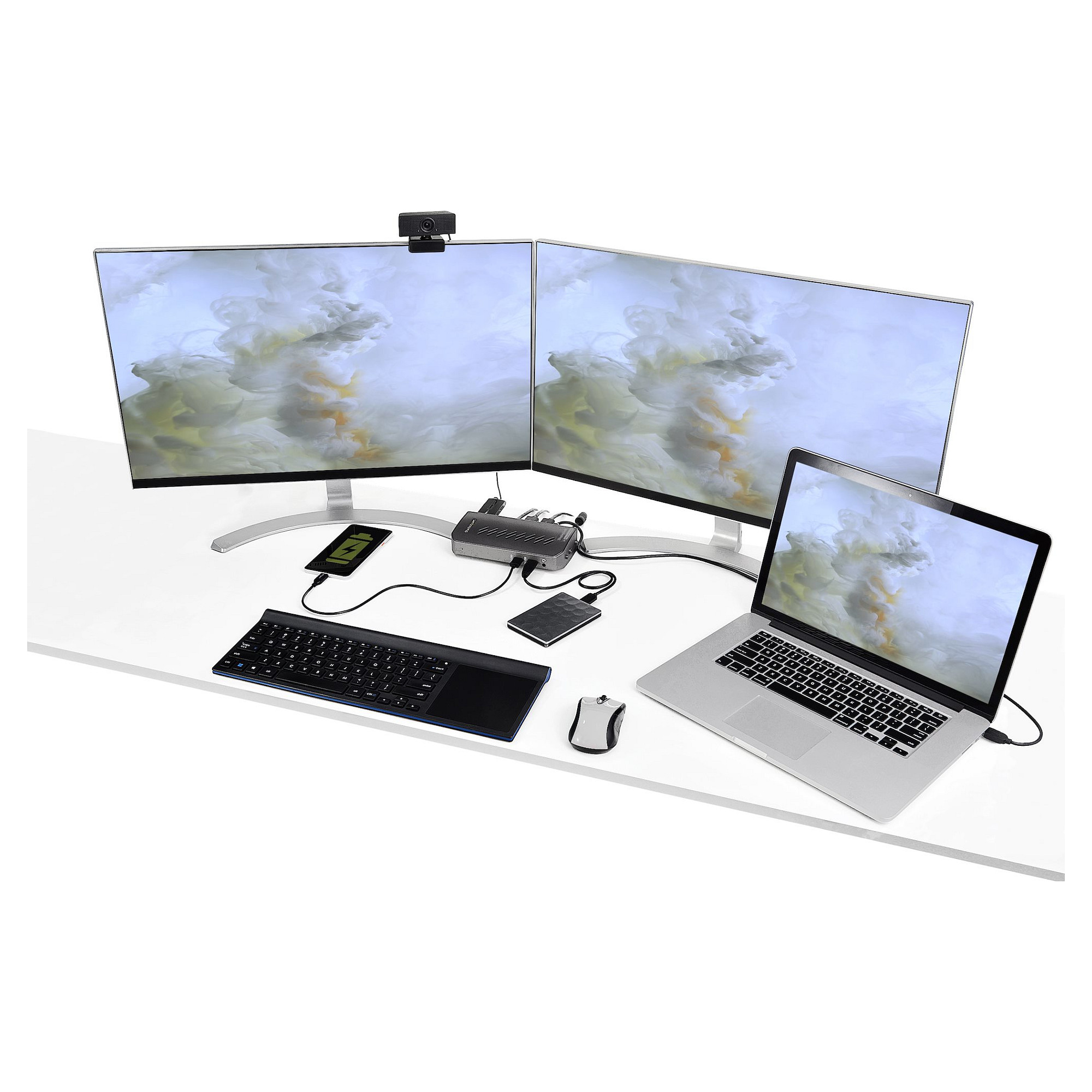 Für eine schnelle Einrichtung ohne vorherige Konfiguration können Sie mit den beiden Hostkabeln (USB-C und USB-A) jeden beliebigen Laptop anschließen. Mit dem mitgelieferten Dockingstandfuß können Sie das Dock vertikal positionieren, um Platz zu sparen, oder platzieren es flach auf dem Schreibtisch.