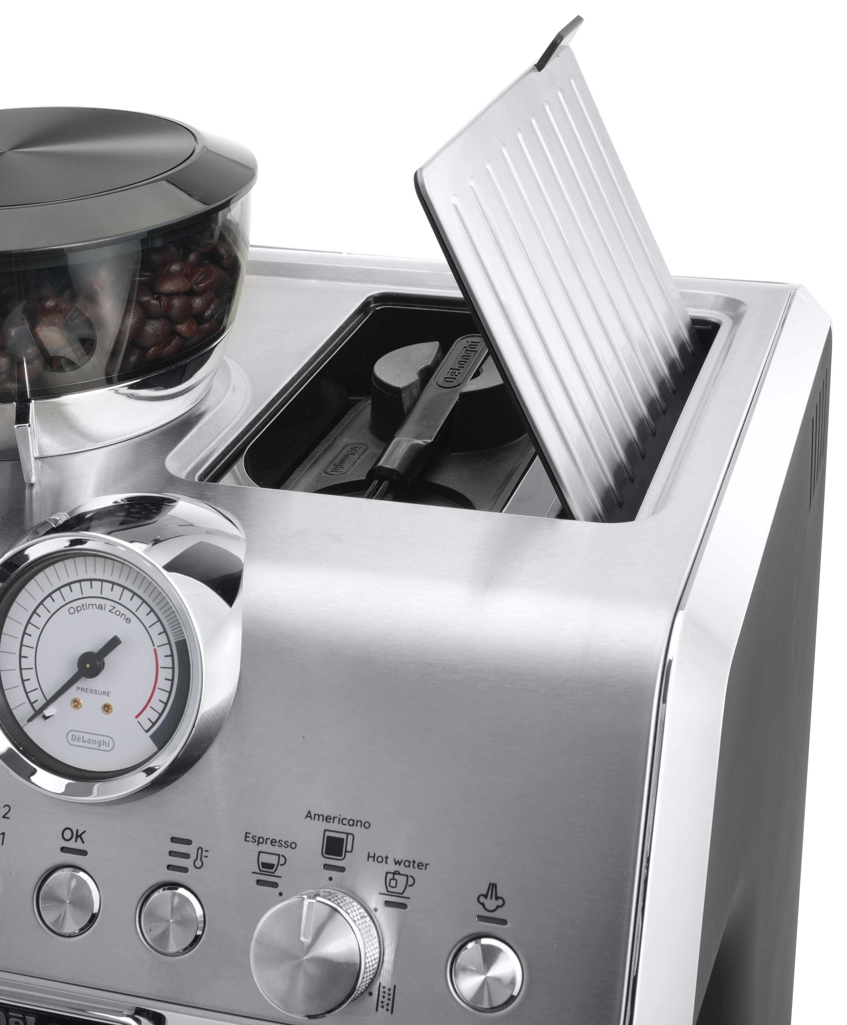 De’Longhi Dedica Arte EC9155.MB. Produkttyp: Espressomaschine, Kaffeezubereitungstyp: Halbautomatisch, Fassungsvermögen Wassertank: 2,5 l, Kaffee-Einfüllart: Kaffeebohnen, Behälter für gebrühten Kaffee: Tasse, Kapazität (in Tassen): 1 Tassen, Eingebautes Mahlwerk. Leistung: 1400 W. Produktfarbe: Schwarz, Edelstahl