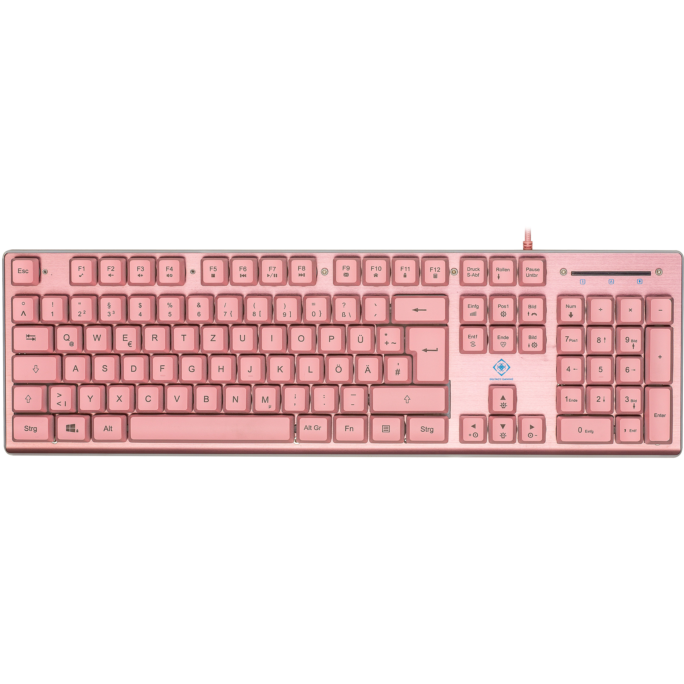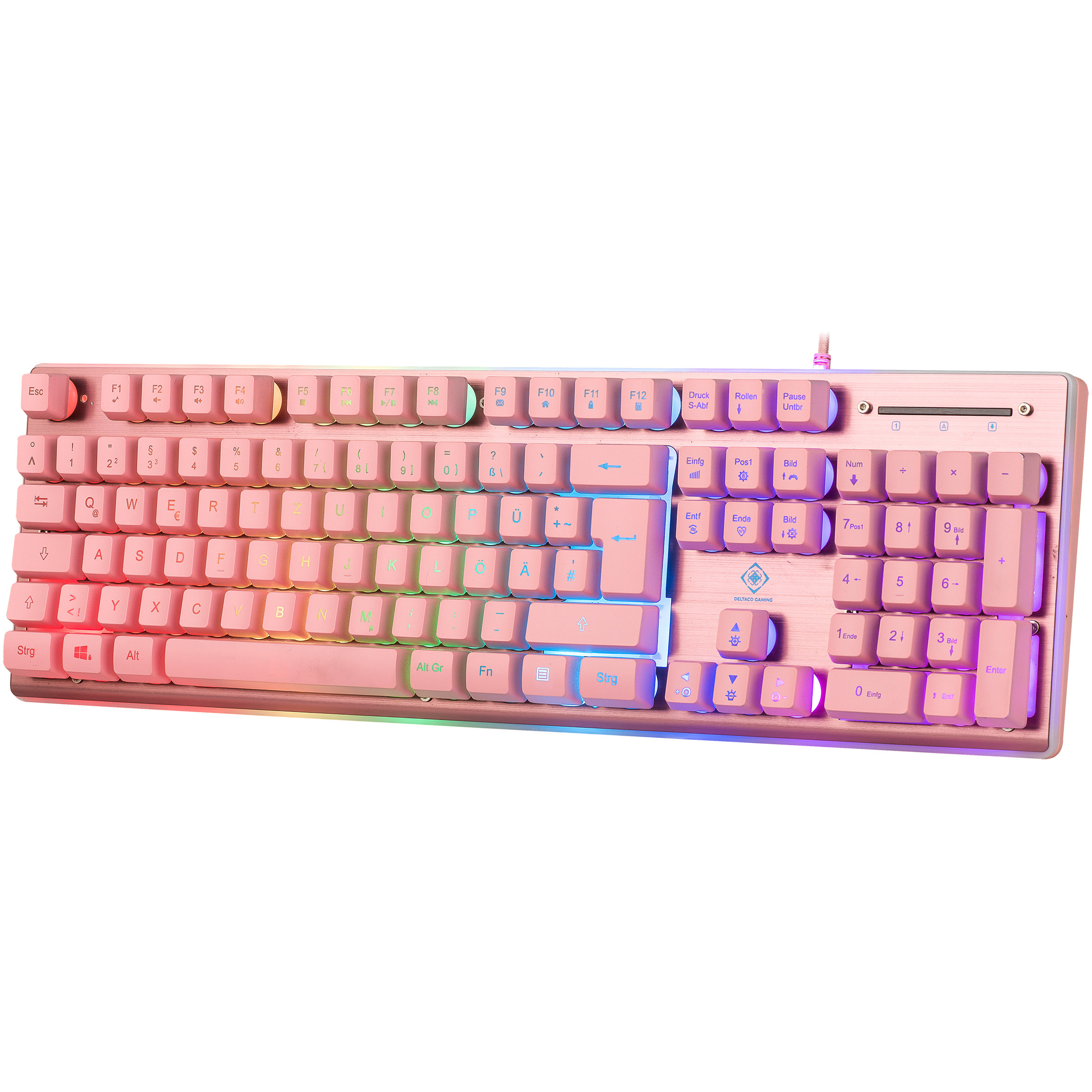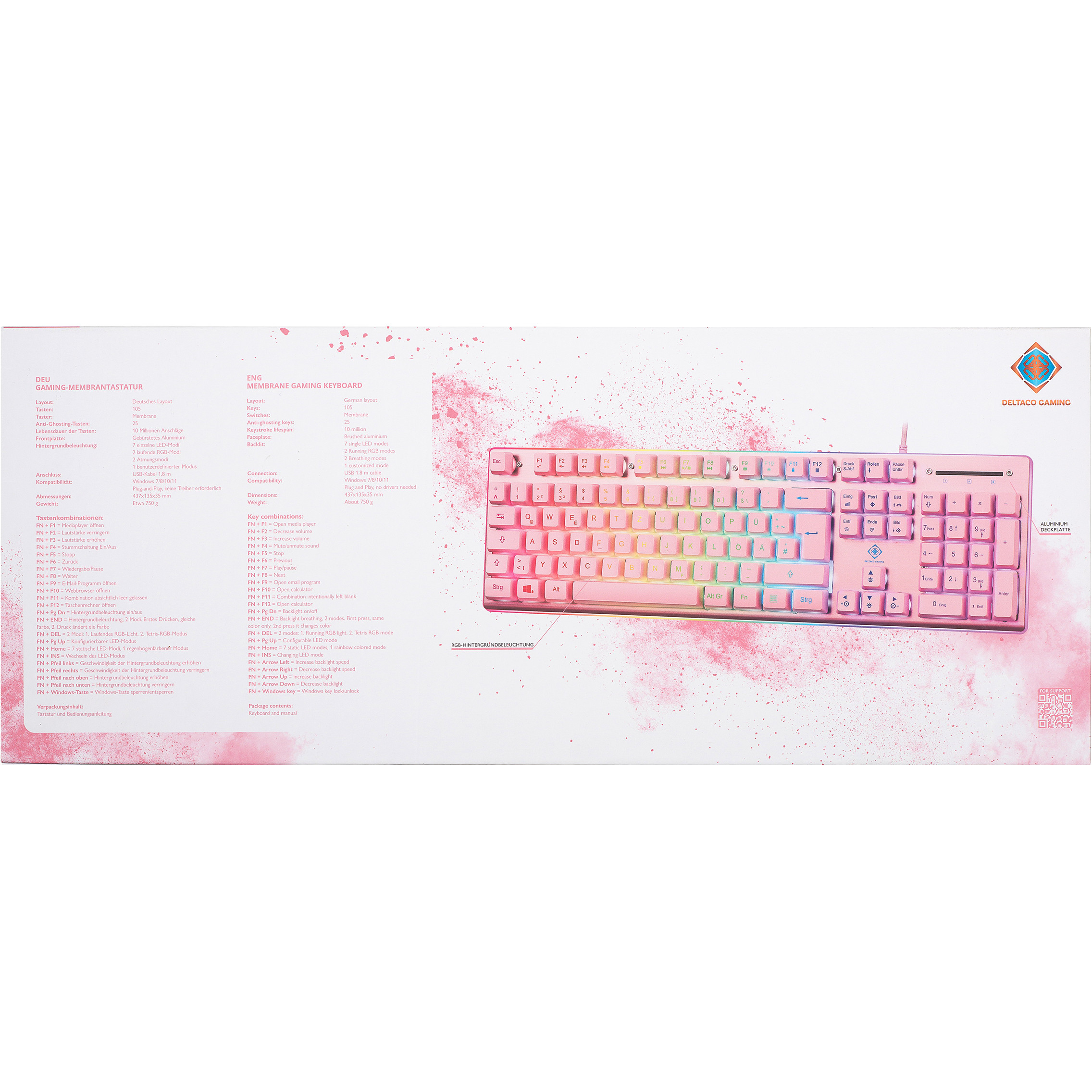 Deltaco Gaming GAM-021-RGB-P-DE. Tastatur Formfaktor: Volle Größe (100%). Tastatur-Stil: Gerade. Übertragungstechnik: Kabelgebunden, Geräteschnittstelle: USB, Tastatur-Switch: Membran Key Switch, Tastaturaufbau: QWERTZ, Tastatur - Tastenanzahl: 105. Typ der Hintergrundbeleuchtung: RGB-LED. Kabellänge: 1,8 m. Empfohlene Nutzung: Gaming. Produktfarbe: Pink