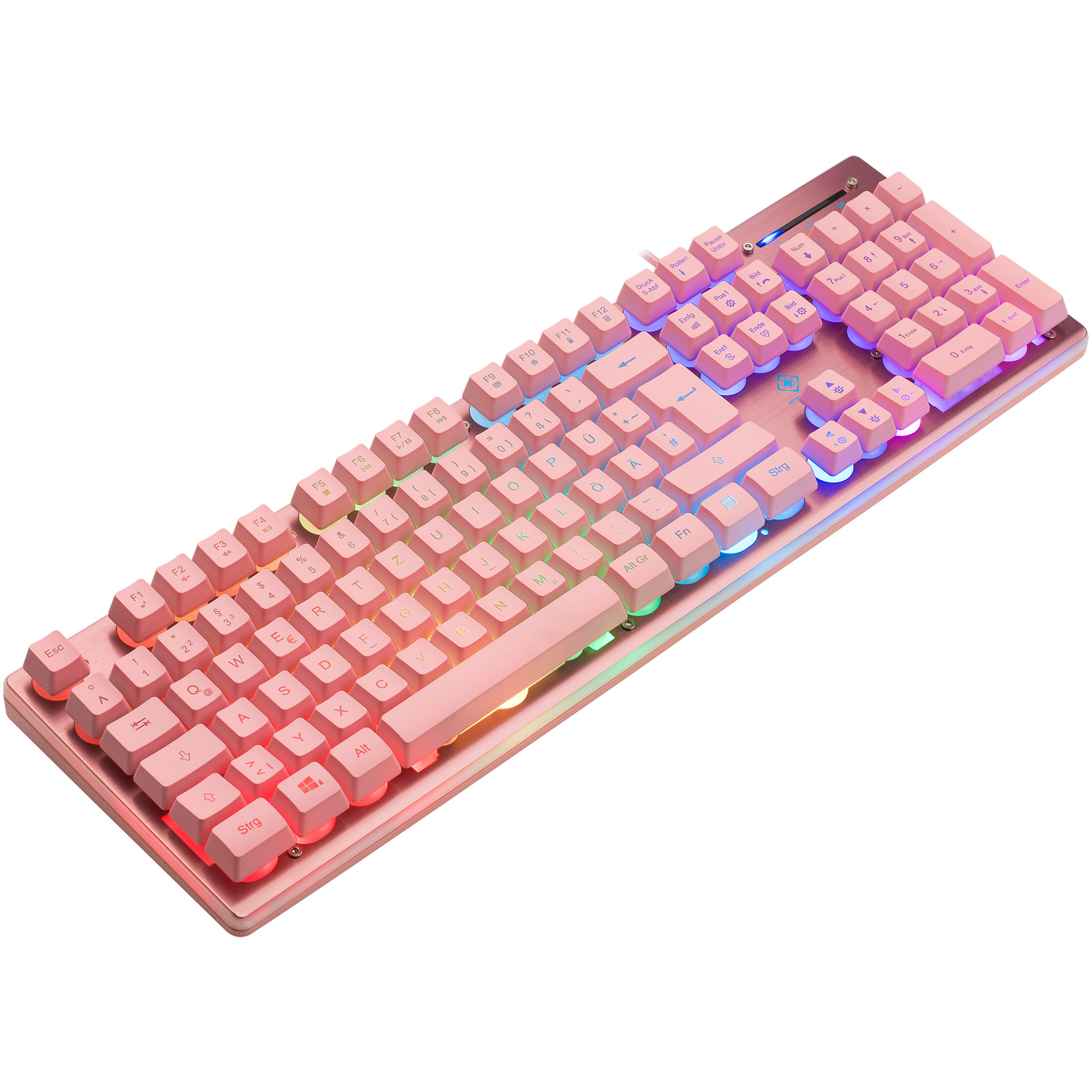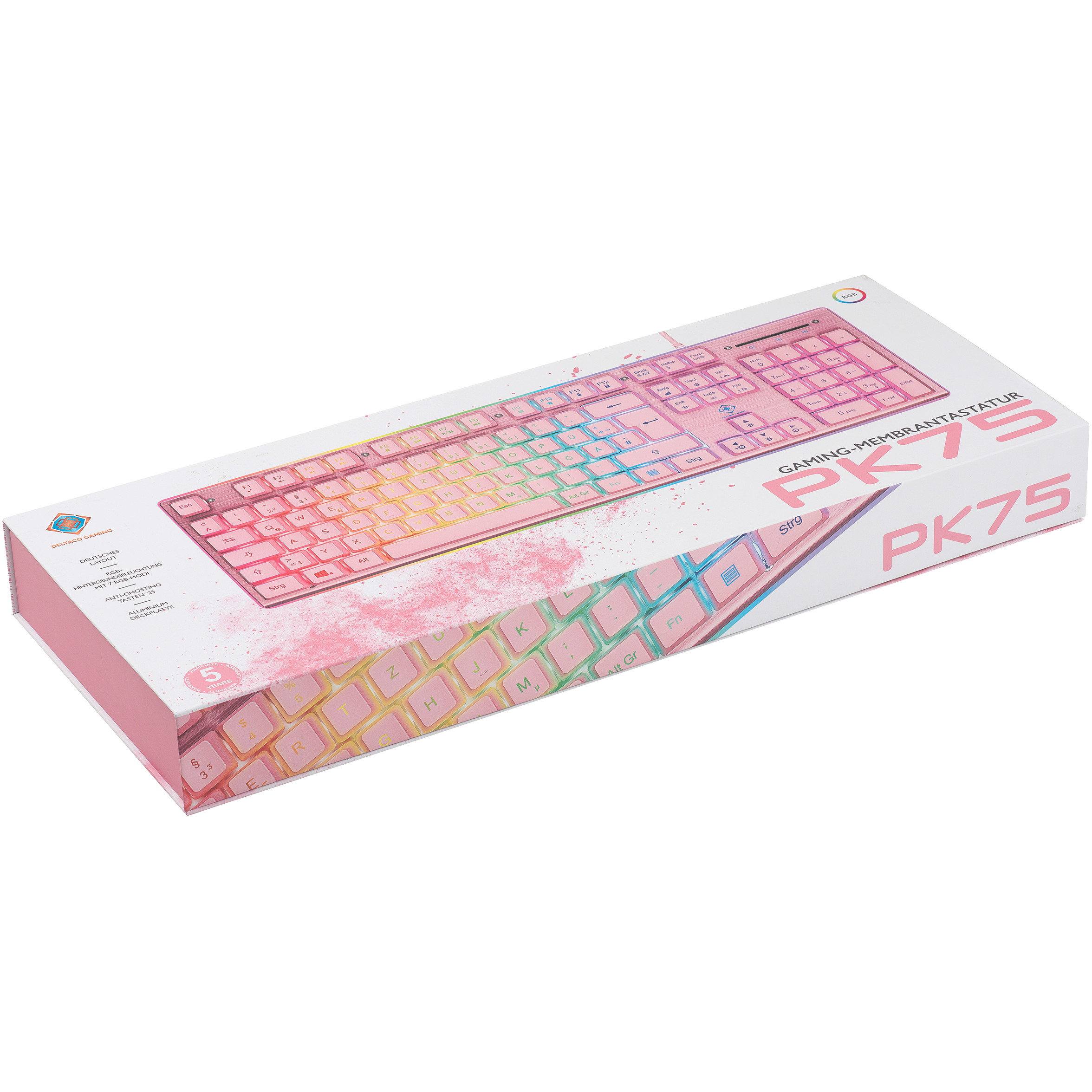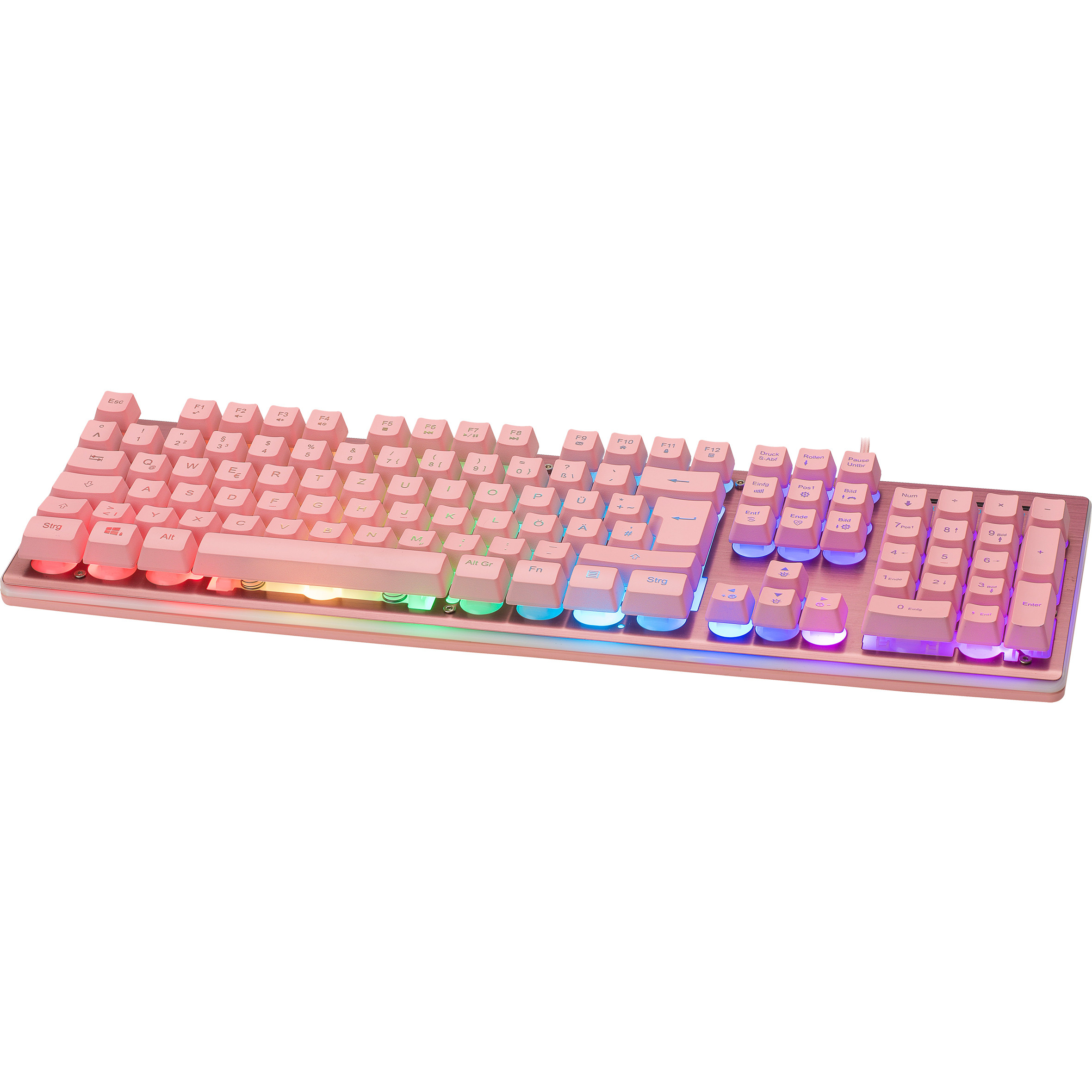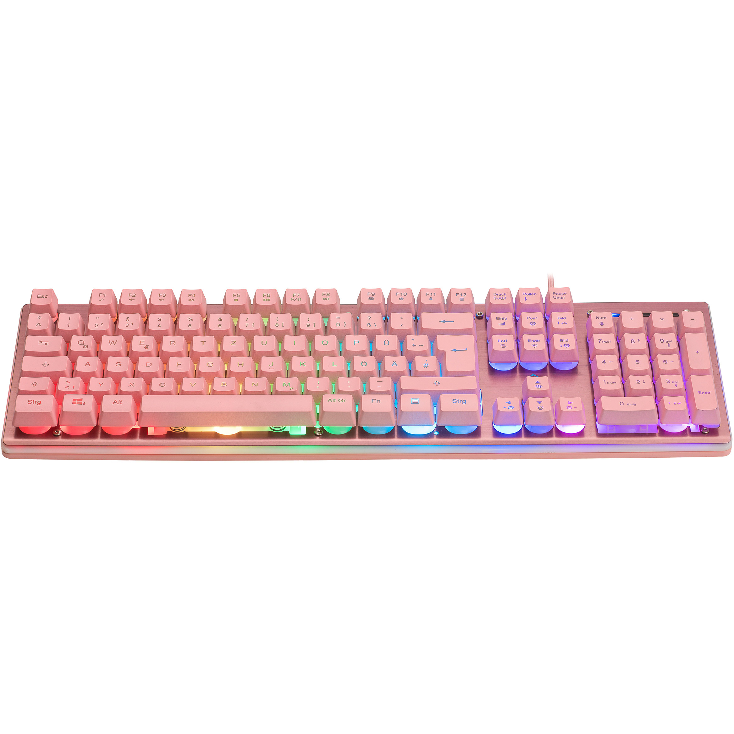 Deltaco Gaming GAM-021-RGB-P-DE. Tastatur Formfaktor: Volle Größe (100%). Tastatur-Stil: Gerade. Übertragungstechnik: Kabelgebunden, Geräteschnittstelle: USB, Tastatur-Switch: Membran Key Switch, Tastaturaufbau: QWERTZ, Tastatur - Tastenanzahl: 105. Typ der Hintergrundbeleuchtung: RGB-LED. Kabellänge: 1,8 m. Empfohlene Nutzung: Gaming. Produktfarbe: Pink
