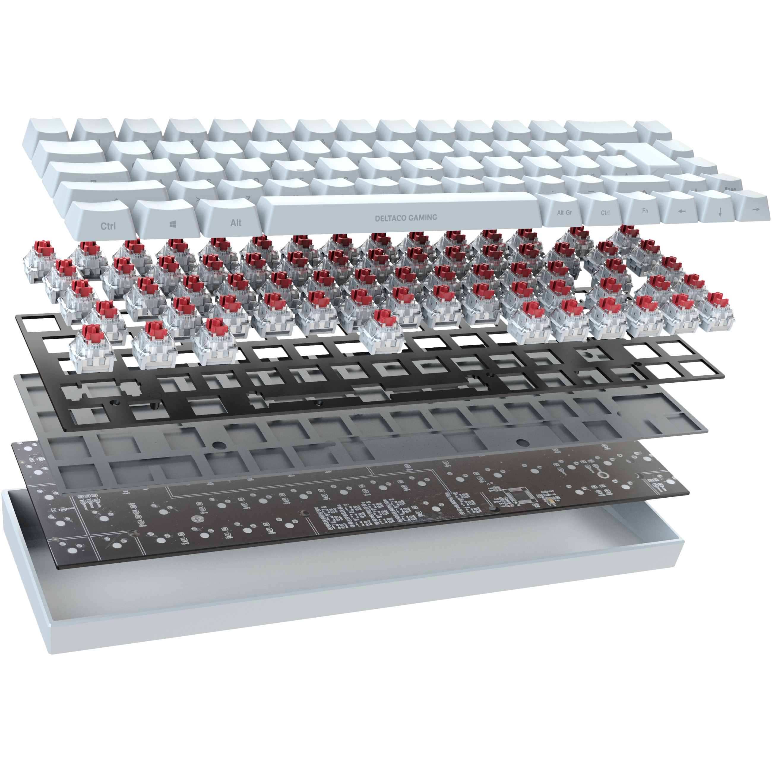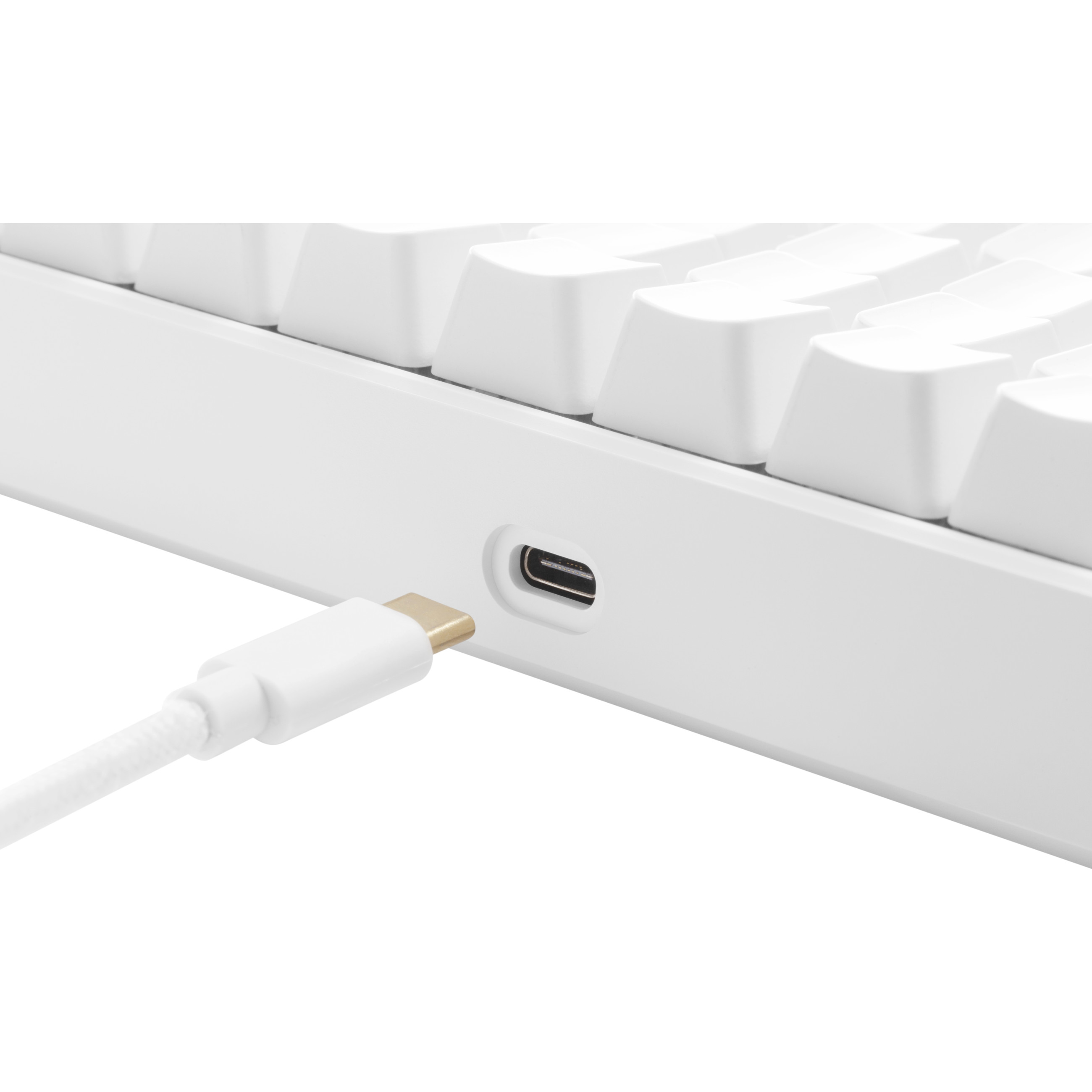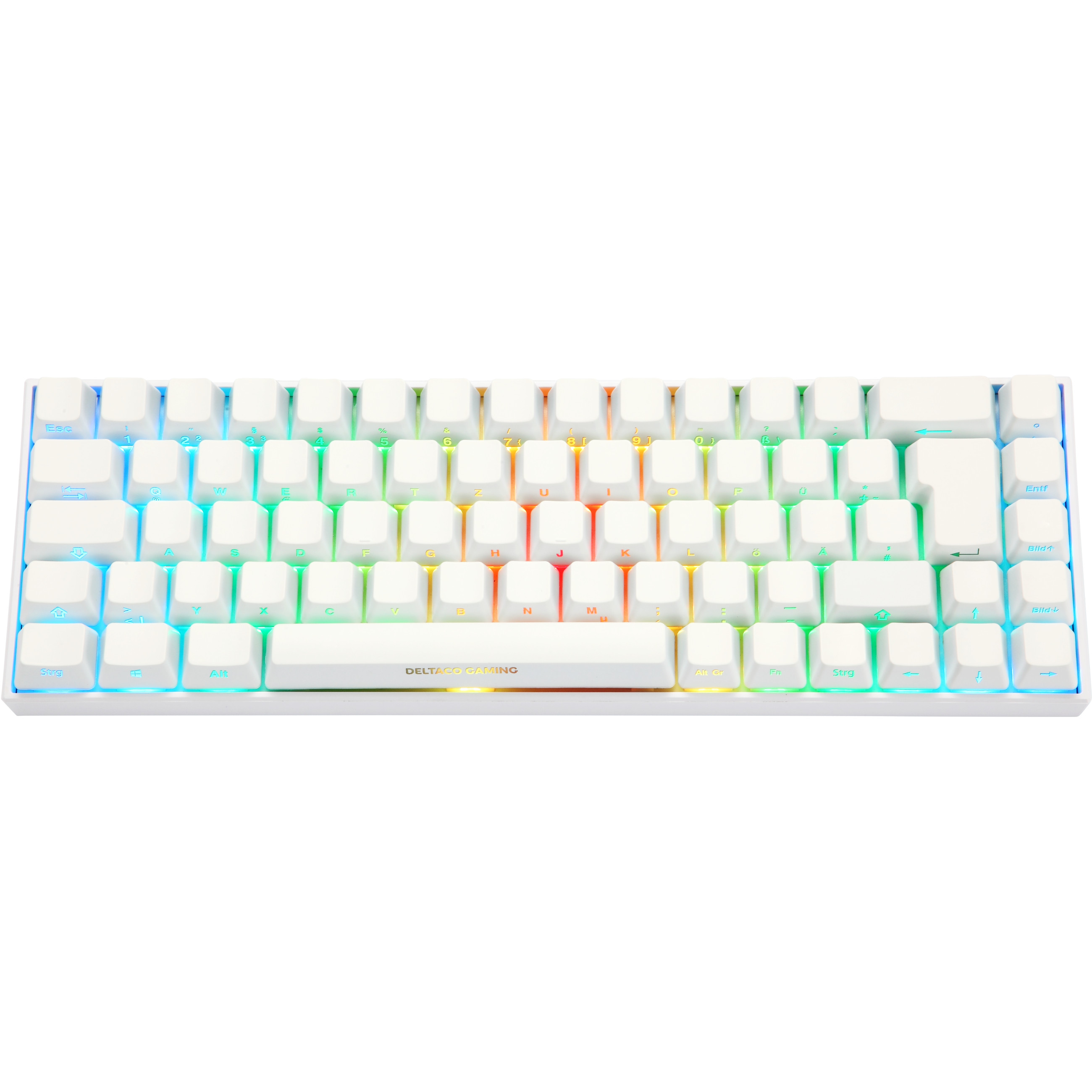 Deltaco Gaming GAM-100-W-DE. Tastatur Formfaktor: 65%. Tastatur-Stil: Gerade. Übertragungstechnik: Verkabelt & Kabellos, Geräteschnittstelle: USB + RF Wireless + Bluetooth, Tastatur-Switch: Mechanischer Switch, Tastaturaufbau: QWERTZ, Tastatur - Tastenanzahl: 68. Typ der Hintergrundbeleuchtung: RGB-LED. Kabellänge: 1,8 m. Empfohlene Nutzung: Gaming. Produktfarbe: Weiß