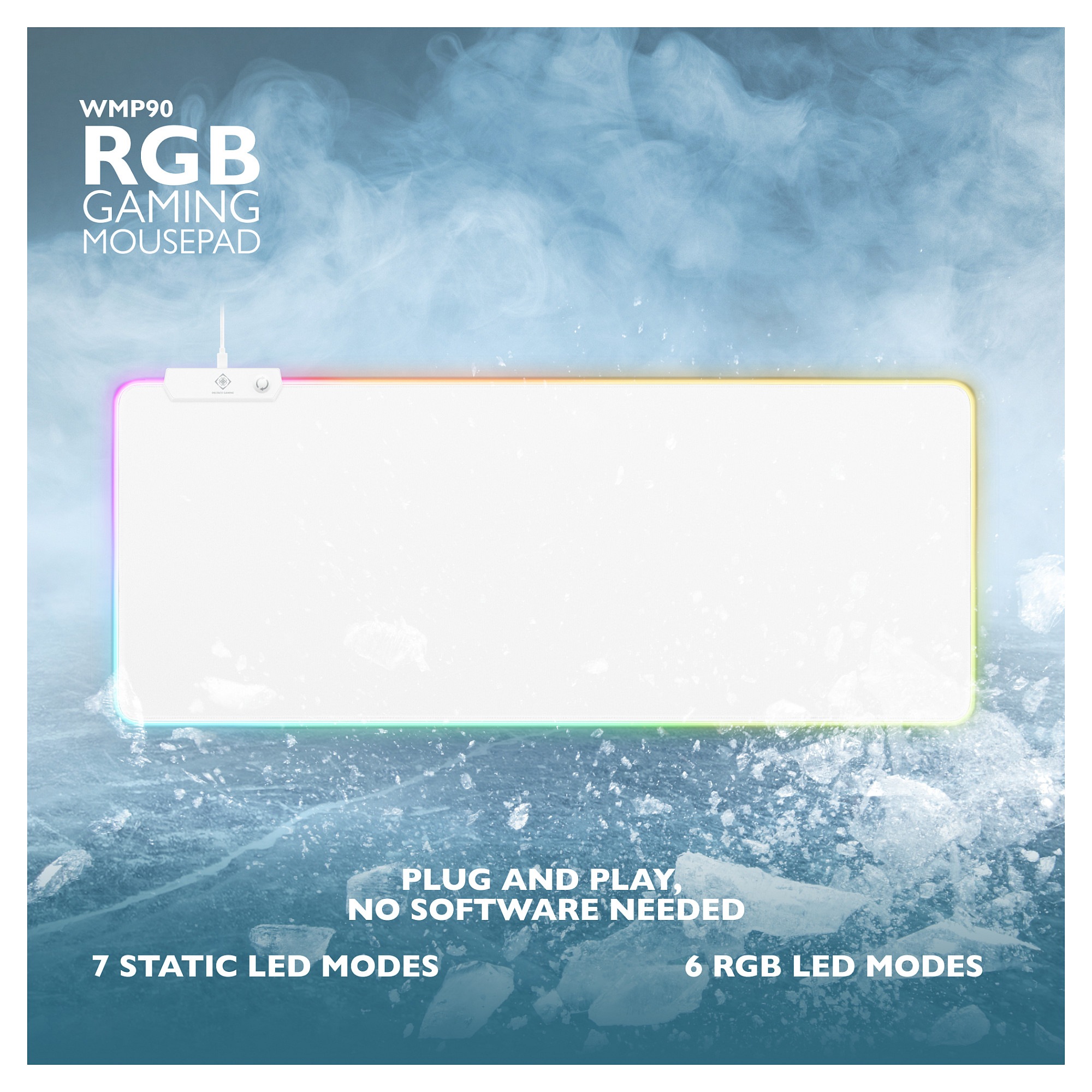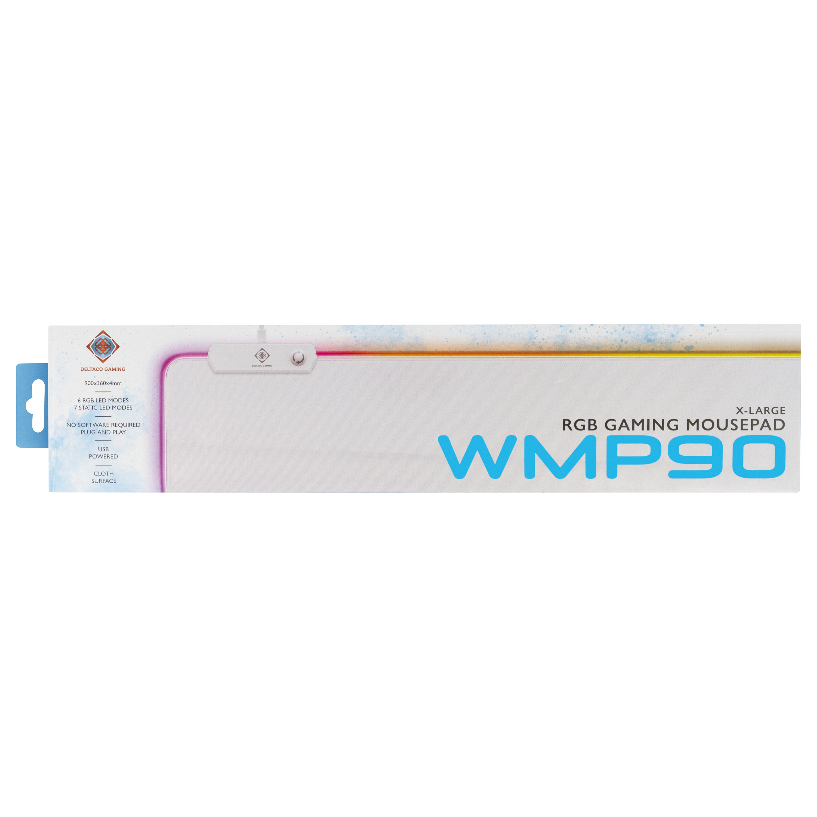 Deltaco Gaming GAM-079-W. Breite: 900 mm, Tiefe: 360 mm. Produktfarbe: Weiß, Oberflächenfärbung: Einfarbig, Material: Gummi, USB, Farbe der Hintergrundbeleuchtung: Mehrfarbig, Anti-Rutsch-Basis, Gaming-Mauspad