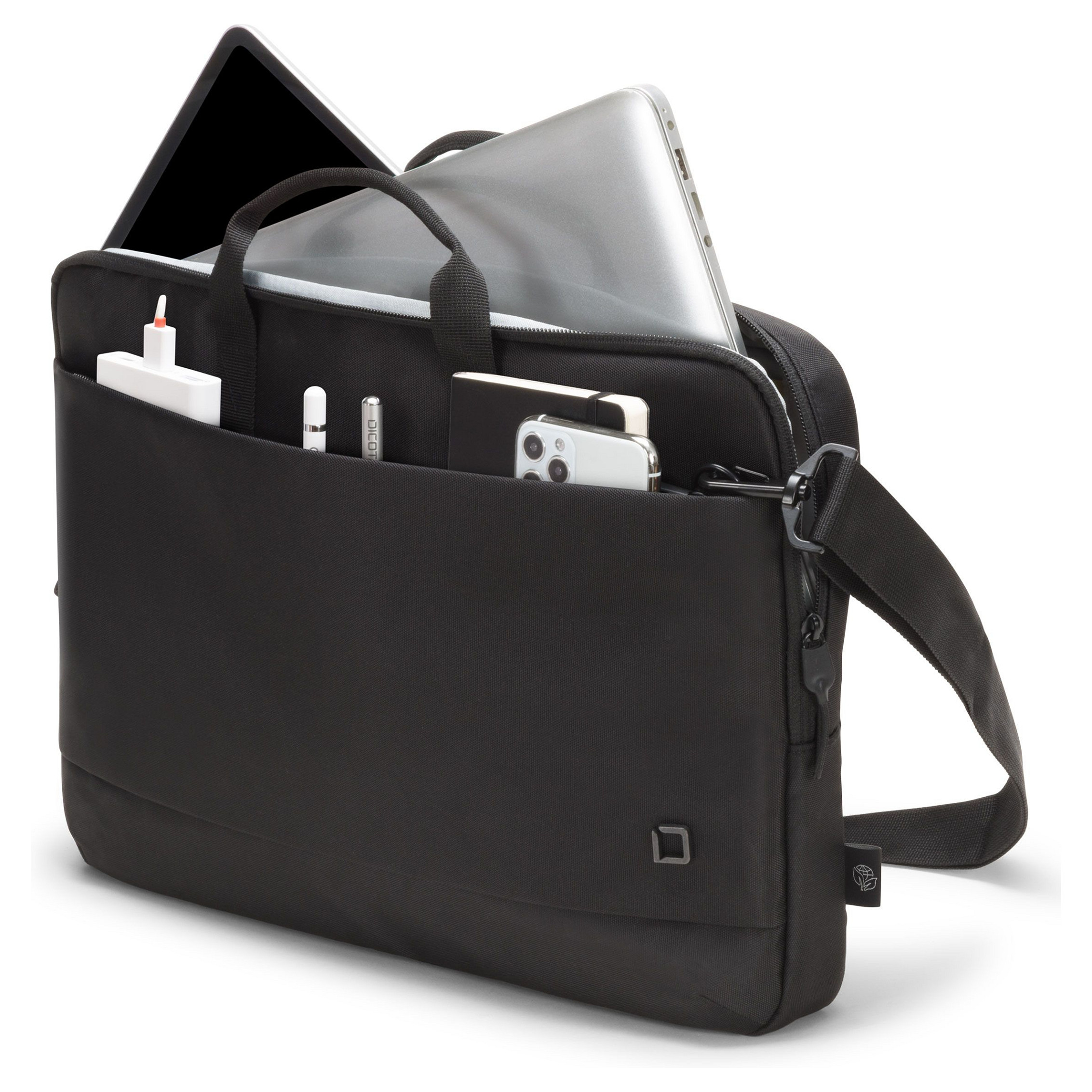 Das Eco Slim Case MOTION ist die leichte und schlanke Tragelösung für Ihren Laptop. Im mit High Density Foam gepolsterten Notebookfach sind Geräte von 12-13.3" bestens geschützt. Das Einsteckfach für Tablets bietet zuverlässigen Schutz für Geräte bis 11". Tragen Sie Ihre Tasche bequem mit dem gepolsterten Handgriff oder verwenden Sie den längenverstellbaren Schultergurt. An der Rückseite befindet sich ein nützliches Dokumentenfach, in dem Unterlagen einfach verstaut werden können. Im praktischen Vorderfach finden Sie genügend Platz für das Smartphone oder weiteres mobiles Zubehör wie Kabel, Stifte oder Ladegeräte, die immer griffbereit sein sollen. Die Tasche besteht aus wasserabweisendem Material um den Inhalt auch an regnerischen Tagen zu schützen. Damit ist das Eco Slim Case MOTION die perfekte Tasche für alle, die viel unterwegs sind und mit einer umweltfreundlichen Tragelösung die sinnvolle Wiederverwendung von PET- Flaschen unterstützen möchten.