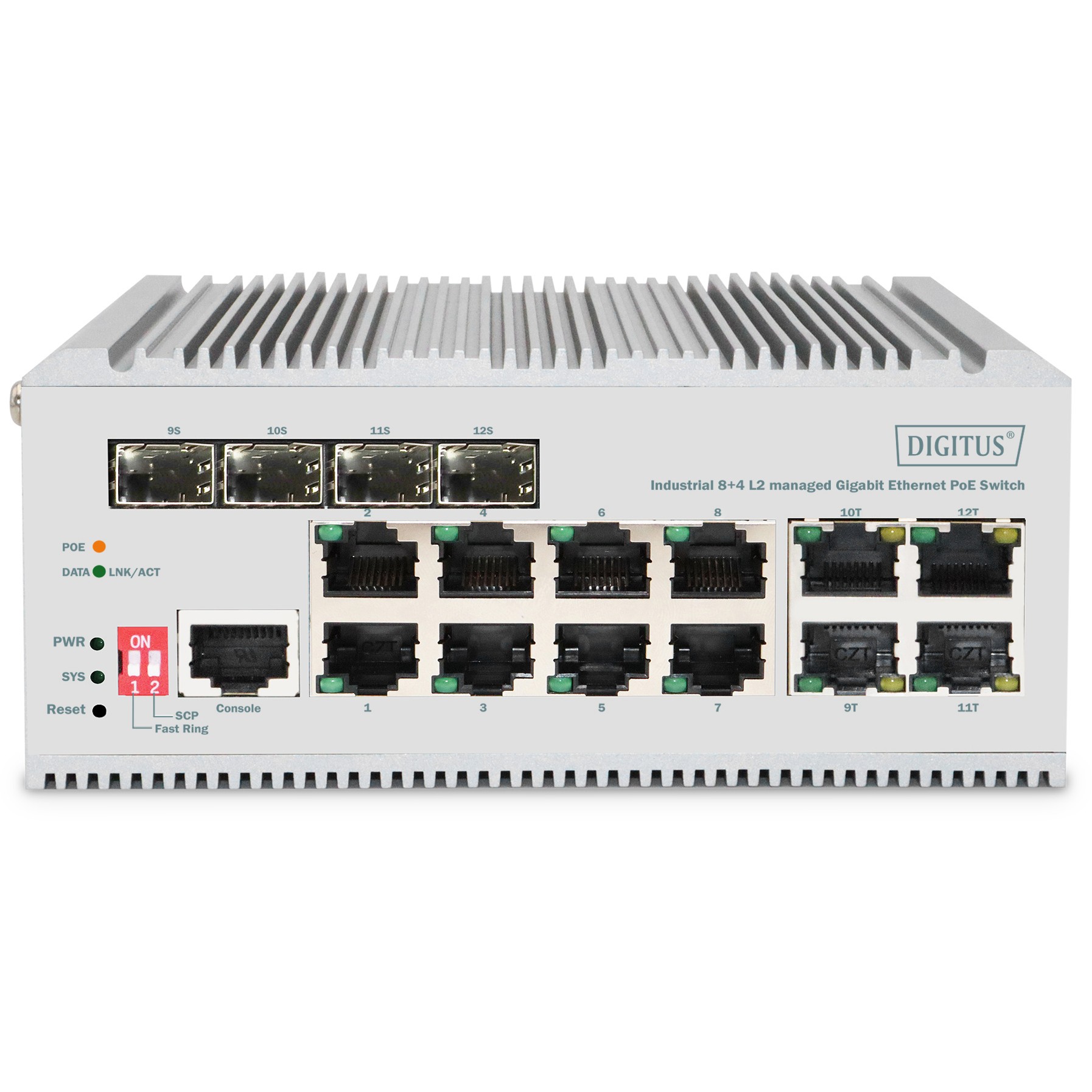 Der DN-651139 Industrienetzwerk-Switch bietet 8 x 10/100/1000 Mbps RJ45-Ports und 4 Gigabit-Combo-Ports. Die RJ45-Ports von 1-8 unterstützen die PoE-Stromversorgung mit maximal 30 W pro Port.
