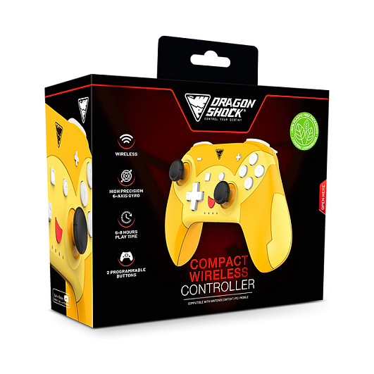 Dragonshock PopTop Compact. Gerätetyp: Gamepad, Gamingplattformen unterstützt: Nintendo Switch, Gaming-Control Funktionsknöpfe: Schaltfläche Zurück, D-Pad, Home button, Reset-Taste. Übertragungstechnik: Kabellos, Geräteschnittstelle: Bluetooth, USB-Stecker: USB Typ-C. Produktfarbe: Orange, Rot, Gelb, Kabellänge: 1 m. Energiequelle: Akku, Akku-/Batterietyp: Eingebaut, Akku-/Batterietechnologie: Lithium-Ion (Li-Ion). Breite: 165 mm, Tiefe: 134 mm, Höhe: 70 mm