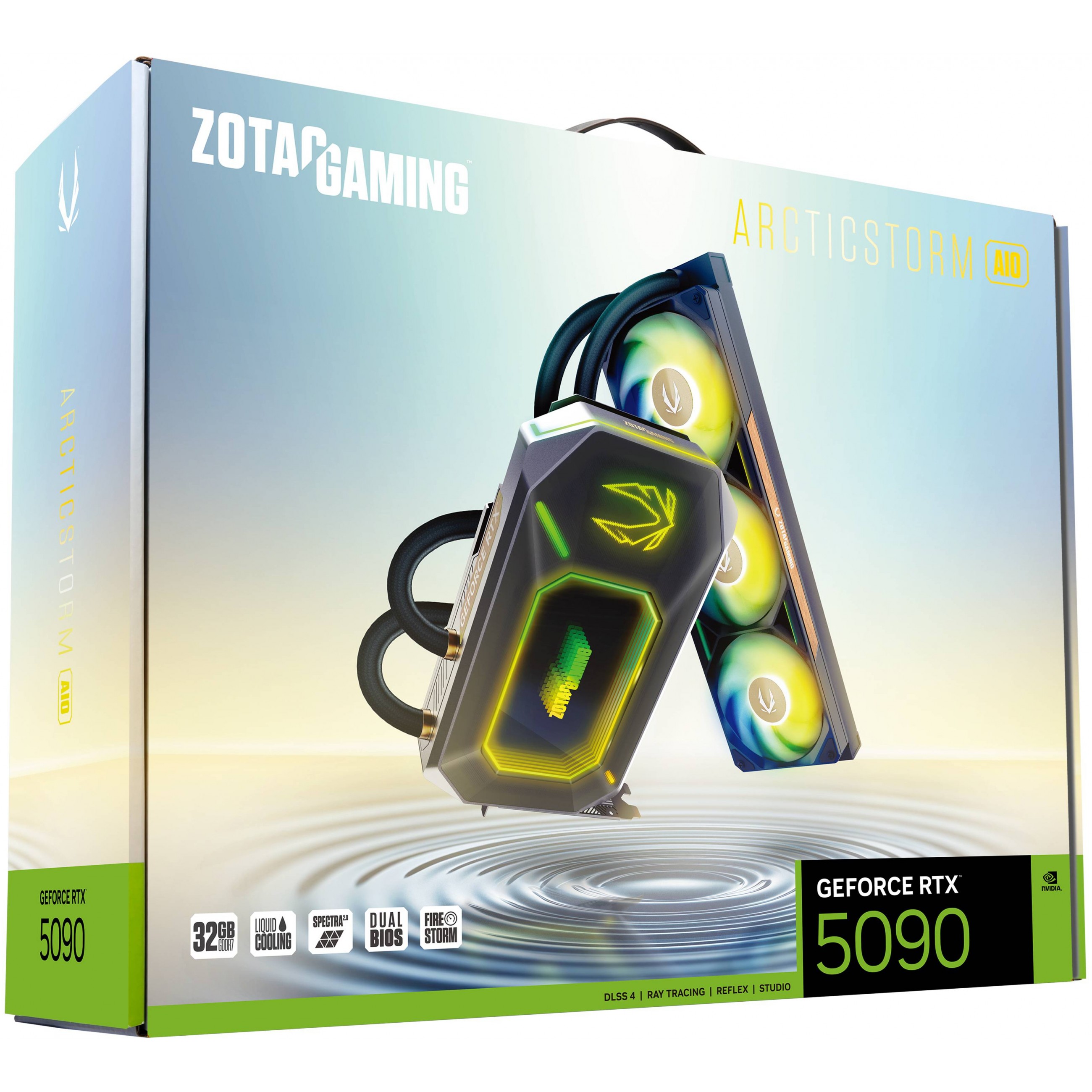 Zotac GAMING GeForce RTX 5090 ARCTICSTORM AIO. Grafikprozessorenfamilie: NVIDIA, GPU: GeForce RTX 5090. Separater Grafik-Adapterspeicher: 32 GB, Grafikkartenspeichertyp: GDDR7, Breite der Speicherschnittstelle: 512 Bit. Maximale Auflösung: 7680 x 4320 Pixel. DirectX-Version: 12 Ultimate, OpenGL-Version: 4.6. Schnittstelle: PCI Express x16 5.0. Kühlung: Hybrid/All-in-One, Anzahl Lüfter: 3 Lüfter, Farben der Beleuchtung: Multi