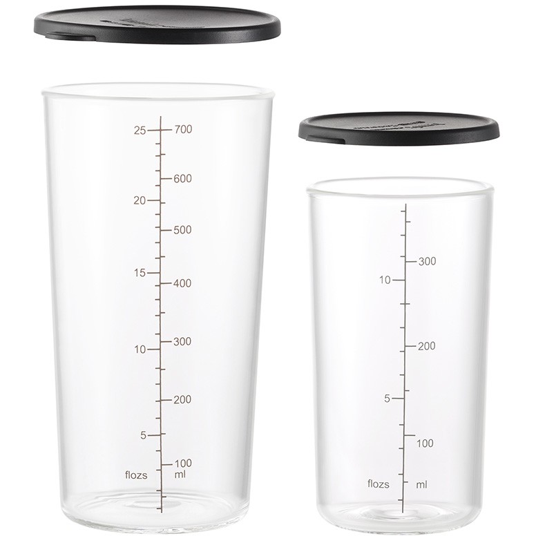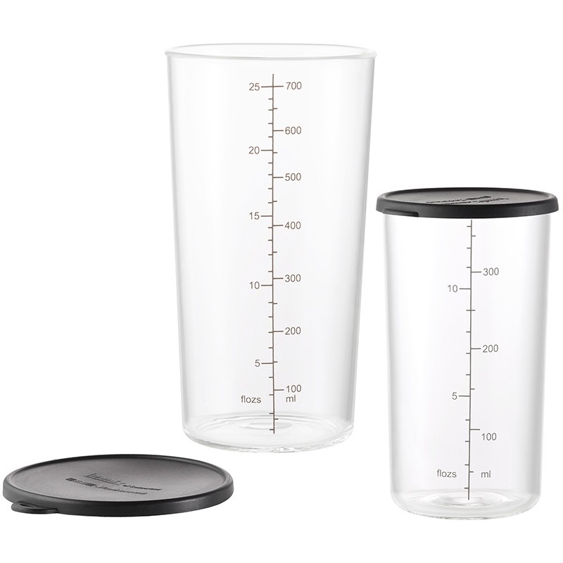 Das erste Messbecherset aus Boro Silikat-Glas für Ihren ESGE-Zauberstab. Im Set sind zwei Messbecher enthalten, ein kleiner Becher mit 400 ml der optimal zur Zubereitung von beispielsweise Mayonnaise ist und ein großer Becher mit 700 ml zum Mixen für leckere Soßen, Drinks und Dips. Beide Becher haben eine Messskala und einen jeweils passenden Deckel, sodass nachdem pürieren, mixen oder zerkleinern den Becher in den Kühlschrank zur Aufbewahrung stellen kann.