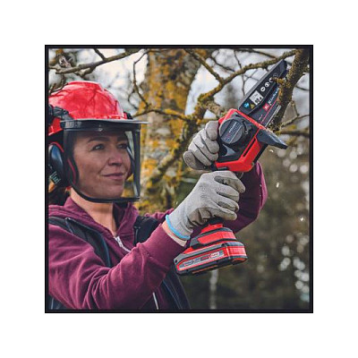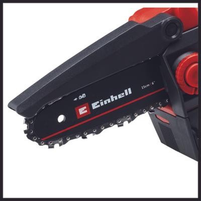 Die Einhell Akku-Astkettensäge GE-PS 18/15 Li BL-Solo ist ein handlicher Helfer für Rück- und Formschnitte von Bäumen und Sträuchern sowie zum Zerkleinern von Grünschnitt und zum Schneiden von kleineren Kanthölzern. Die kompakte Säge ist Mitglied der Einhell Power X-Change Familie und kann mit allen Akkus und Ladegeräten der Systemfamilie kombiniert werden. Angetrieben wird das Gerät von dem Einhell PurePOWER Brushless Motor. Dieser bürstenlose Motor bietet mehr Kraft und eine längere Laufzeit als herkömmliche Kohlebürsten-Motoren. Nach einer Online-Registrierung gelten 10 Jahre Garantie auf den Brushless-Motor. Mit einer Schwertlänge von 15,8 cm und 12,5 cm Schnittlänge eignet sich die kleine und leichte Akku-Astkettensäge optimal zum flexiblen Einsatz im Garten. Der hocheffiziente Motor sorgt für sehr geringe Vibrationen und eine Kettengeschwindigkeit von bis zu 4,8 m/s. Geliefert wird die Säge mit einem hochwertigen Schwert- und Ketten-Set für eine hohe Schnittleistung und beste Arbeitsergebnisse. Zur einfachen Wartung können Schwert und Kette einfach und werkzeuglos gewechselt werden. Zum sicheren und flexiblen Einsatz verfügt die Säge über einen Handschutz und eine klappbare Kettenabdeckung. Angenehm in der Hand liegt das praktische Gartengerät dank des schlanken Griffs, spezieller Softgrip-Flächen und der integrierten Handablagefläche zur beidhändigen Nutzung. Eine Schwertabdeckung wird zur sicheren Lagerung der kleinen Kettensäge mitgeliefert. Ebenfalls im Lieferumfang enthalten sind eine Dosierhilfe zur manuellen Ölung der Kette und ein Innensechskantschlüssel zum Nachspannen der Kette. Dieser wird direkt am Gerät verstaut und ist somit jederzeit griffbereit. Die Lieferung erfolgt ohne Akku und ohne Ladegerät. Diese sind separat, zum Beispiel als praktisches Starter-Set, erhältlich.