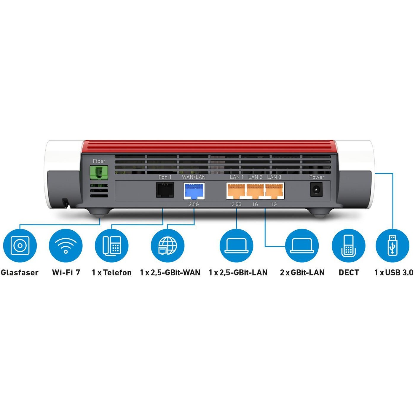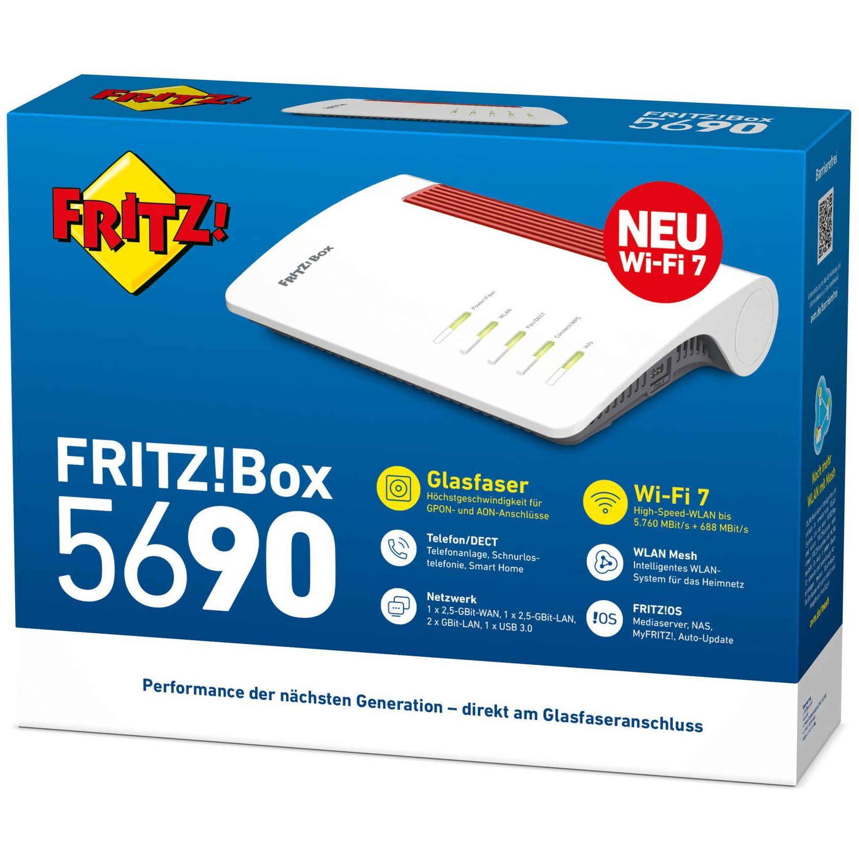 Box 5690. WAN-Verbindungstyp: GPON, RJ-45. WLAN-Band: Dual-Band (2,4 GHz/5 GHz), Top WLAN-Standard: Wi-Fi 7 (802.11be), WLAN Datentransferrate (max.): 5760 Mbit/s. Schnittstellentyp Ethernet-LAN: 2.5 Gigabit Ethernet. Unterstützte Sicherheitsalgorithmen: WPA2, WPA3, WPS. Produkttyp: Tabletop-Router, Produktfarbe: Rot, Weiß
