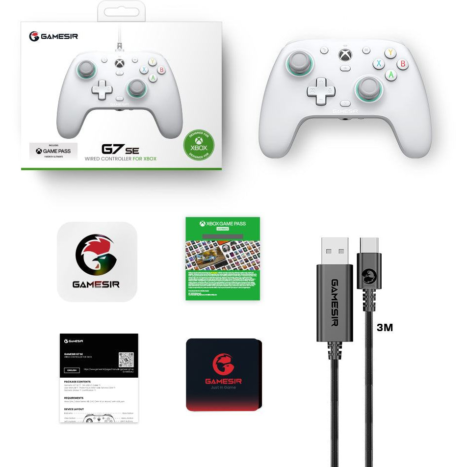 GameSir G7 SE. Gerätetyp: Gamepad, Gamingplattformen unterstützt: Xbox One, Xbox Series S, Xbox Series X, Gaming-Control Funktionsknöpfe: D-Pad, Menü-Taste, Microphone mute button, Modus-Taste. Übertragungstechnik: Kabelgebunden, Geräteschnittstelle: USB, USB-Stecker: USB Typ-C. Produktfarbe: Weiß, Kabellänge: 3 m. Energiequelle: Kabel. Unterstützt Windows-Betriebssysteme: Windows 10, Windows 11