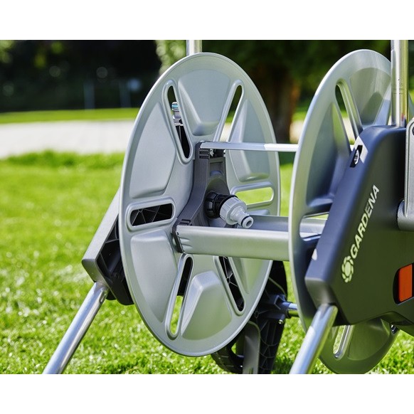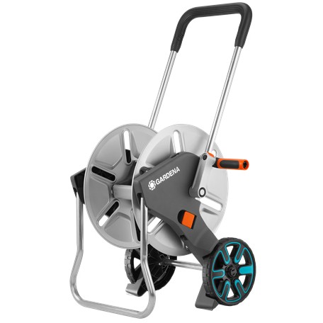 Der GARDENA Metall-Schlauchwagen AquaRoll M Metall ist besonders stabil und robust und hält auch höchsten Beanspruchungen im Garten stand. Er ermöglicht eine platzsparende Aufbewahrung des Gartenschlauchs und ist komfortabel in der Handhabung. Durch die ergonomische Metallkurbel mit Weichkunststoffkomponente lässt sich der Schlauch zuverlässig aufrollen. Kein Umfallen mehr durch den ausklappbaren Standfuß. Seine spezielle Form sowie der sichtbare Räder-Hochstand unterstützen zudem die Standsicherheit des Schlauchwagens. Zur platzsparenden Aufbewahrung wird der Standfuß einfach eingeklappt, der Griff nach unten geschoben und die Kurbel schnell eingeklappt.