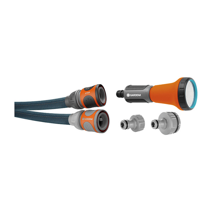 Das sofort einsatzbereite Set beinhaltet neben dem Liano™ Xtreme die vormontierten Original GARDENA Systemteile Liano™ Wasserstop und Liano™ Schlauchverbinder, eine Bewässerungsbrause sowie zwei Hahnverbinder – wovon einer ein Reduzierstück hat – für drei Hahngrößen.