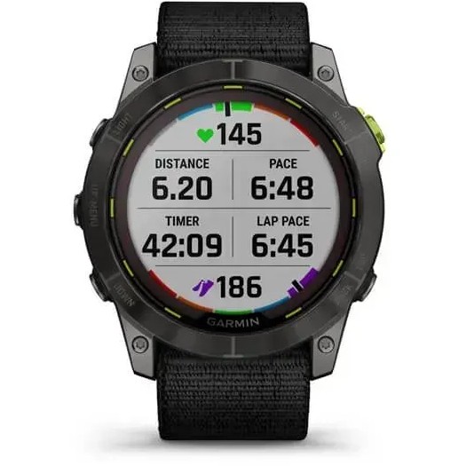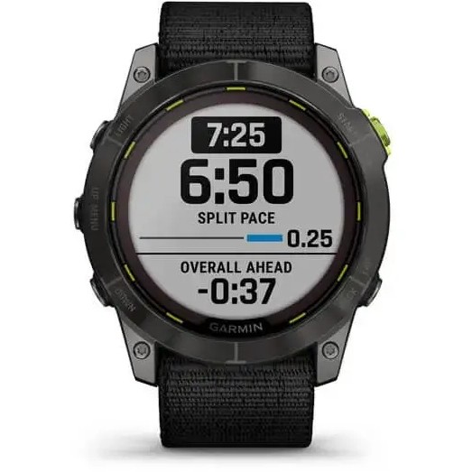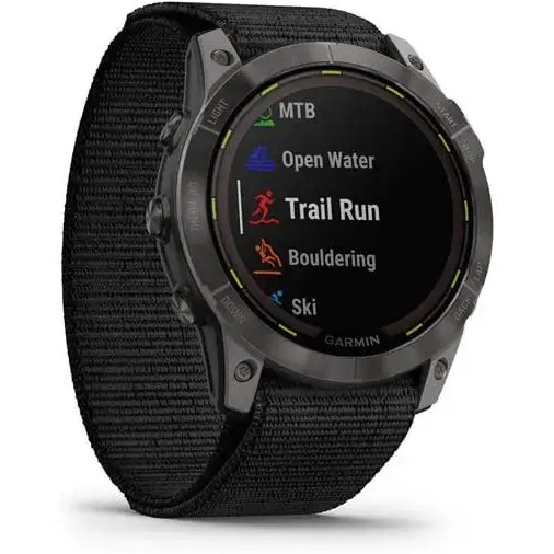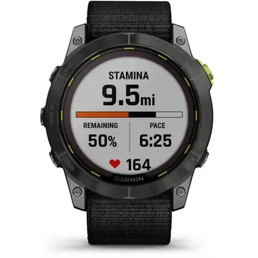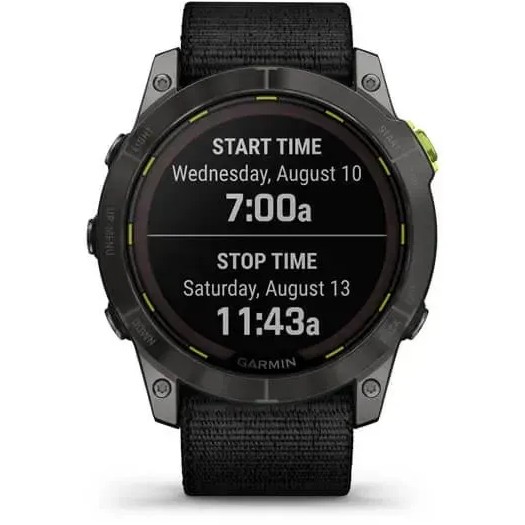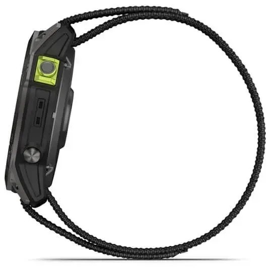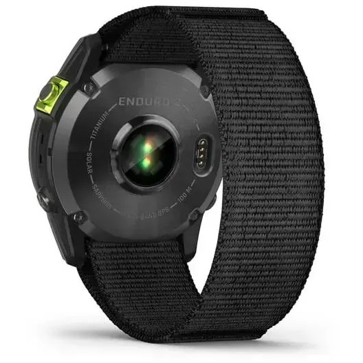 Garmin Enduro 2. Bildschirmdiagonale: 3,56 cm (1.4"), Bildschirmtechnologie: MIP, Display-Auflösung: 280 x 280 Pixel, Touchscreen. Flash-Speicher: 32 GB. WLAN. GPS. Gewicht: 70 g. Bandmaterial: Nylon, Armbandfarbe: Schwarz, Bandgröße: Universalgröße